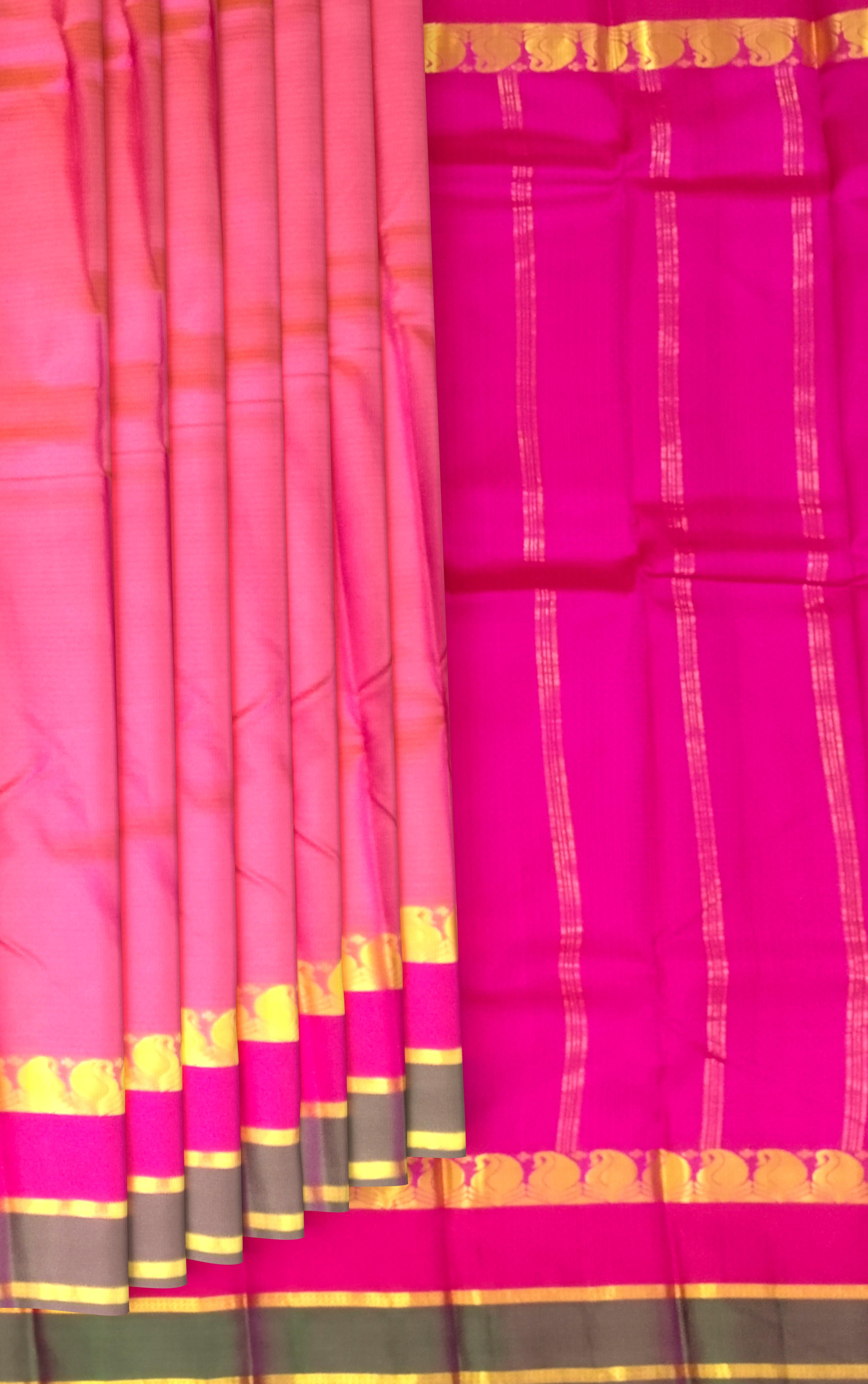 Soft and radiant, this Peach Kanchipuram Silk Saree showcases timeless elegance with its pink and green border. The plain silk body enhances the natural sheen of the fabric, making it both sophisticated and serene. The combination of peach with contrasting tones creates a delicate balance of modern style and traditional warmth. Kanchipuram pure silk sarees are woven with intricate attention to detail, using pure mulberry silk and traditional zari. These sarees are renowned for their rich texture, vivid hues, and the pride of craftsmanship that has been passed down through generations in the town of Kanchipuram. Perfect for festive occasions, cultural gatherings, and family celebrations, this saree can be paired with a pink or green blouse. Complete your ensemble with antique gold jewellery and a matching clutch for a polished, graceful look. Note: The appearance of the product’s colors may vary due to lighting conditions or your device’s screen calibration. For further assistance or additional images/videos, feel free to contact us at +91 97897 60367 or email at wecare@thesudeshiweaving.com.