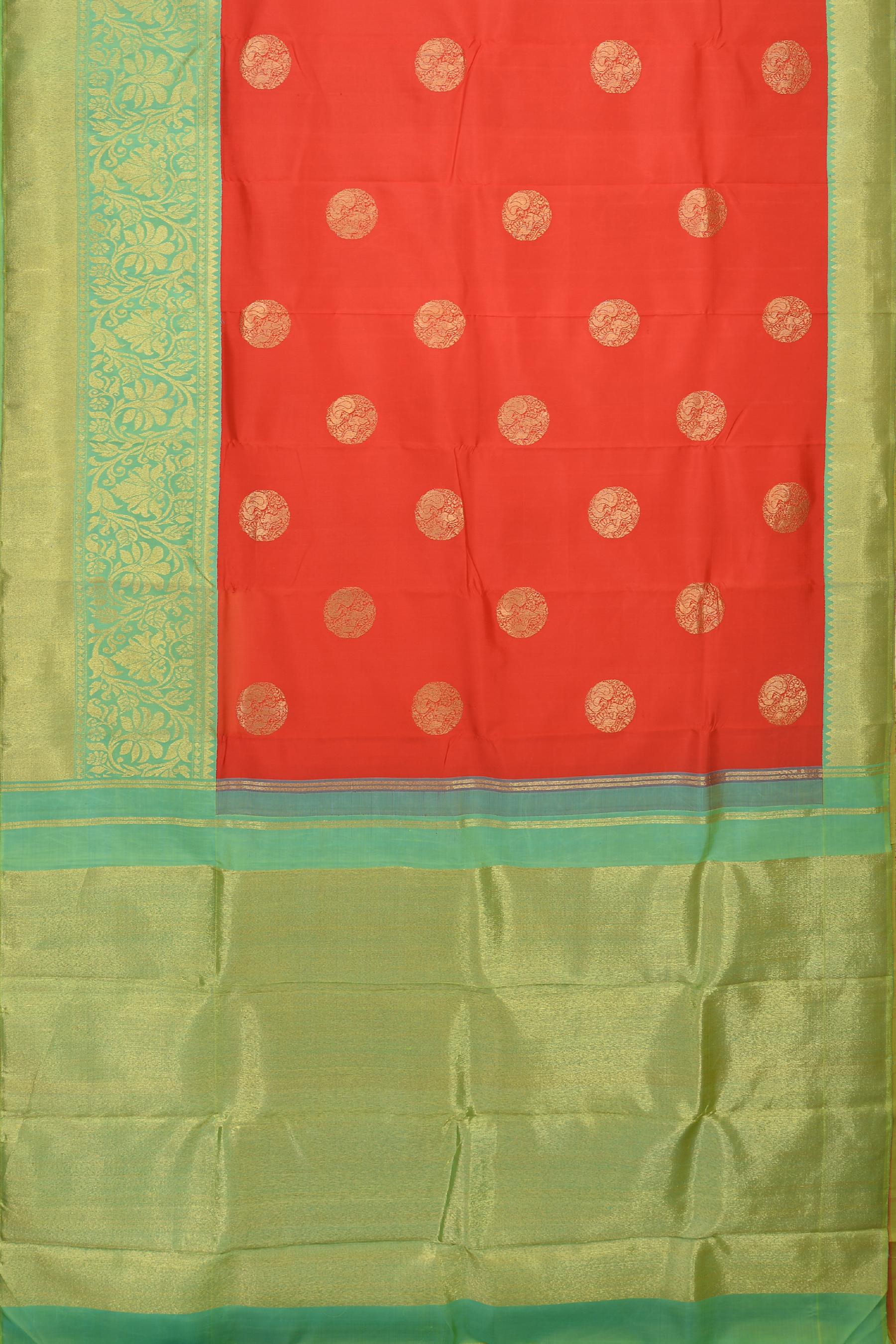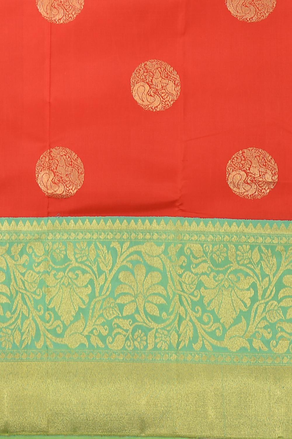 Discover the poise and panache of this peach orange Kanchipuram silk saree, brought to life with grand bavanshi motifs. The weave tells a story of sunrise and softness, of tradition adorned with modernity. The grand pallu, with its intricately woven yaali, mayil, and annapakshi, offers a dramatic narrative that cascades with elegance.