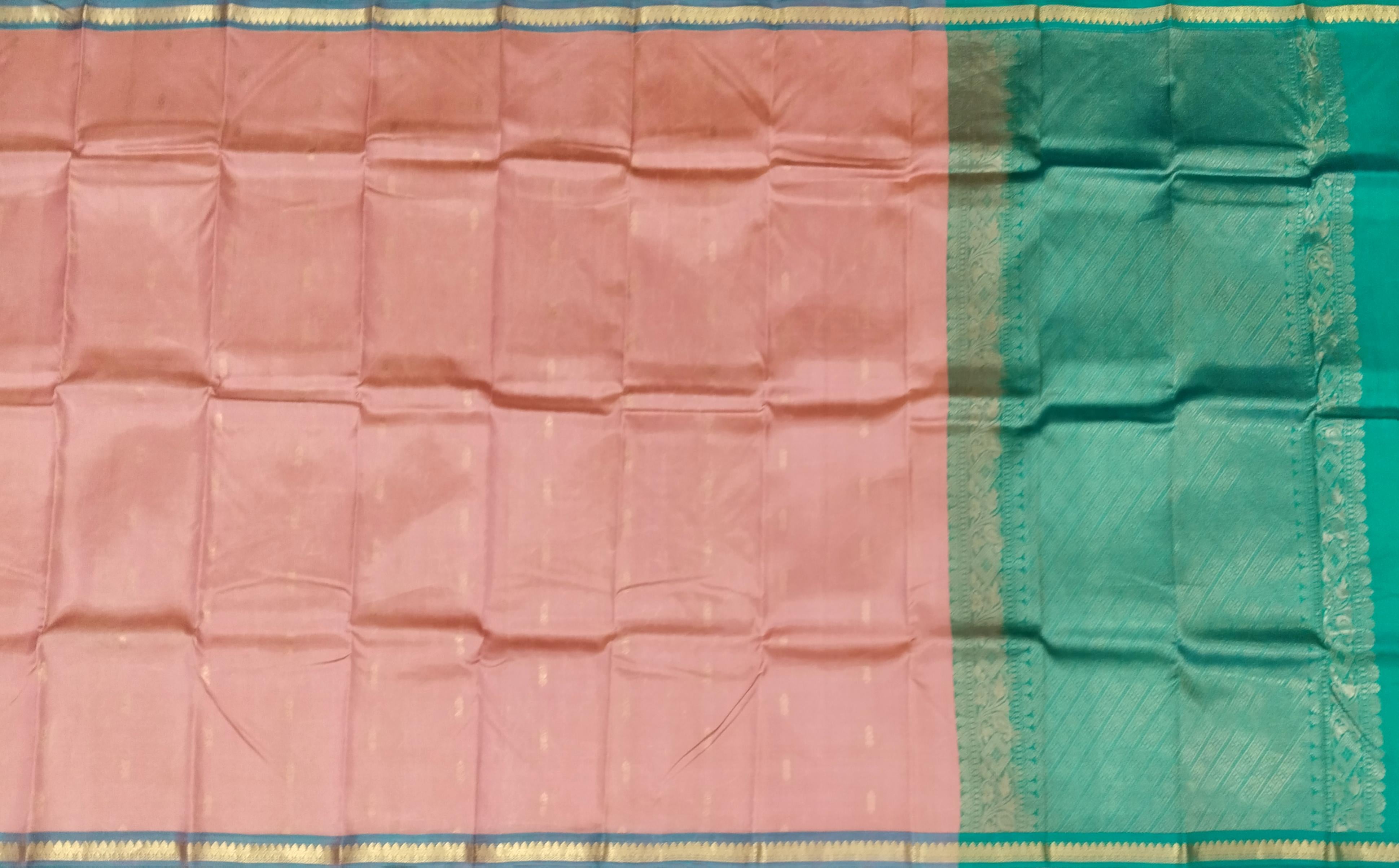 Radiating freshness and soft elegance, this Peach Kanchipuram Silk Saree with Small Butta motifs captures the charm of understated beauty. The sea-green border and pallu lend a serene contrast, while the body shimmers subtly with zari threads — a celebration of grace and sophistication. Kanchipuram Silk Sarees are woven from pure mulberry silk, symbolizing the divine connection between devotion and art. Each motif — from floral to geometric — carries centuries of symbolism rooted in South Indian temple architecture and tradition, making every drape a piece of living heritage. This peach and sea-green combination is perfect for daytime ceremonies, traditional gatherings, or festive brunches. Style it with a pastel green blouse, pearl accessories, and light makeup for a radiant, graceful look. Note: The appearance of the product’s colors may vary due to lighting conditions or your device’s screen calibration. For further assistance or additional images/videos, feel free to contact us at +91 97897 60367 or email at wecare@thesudeshiweaving.com.