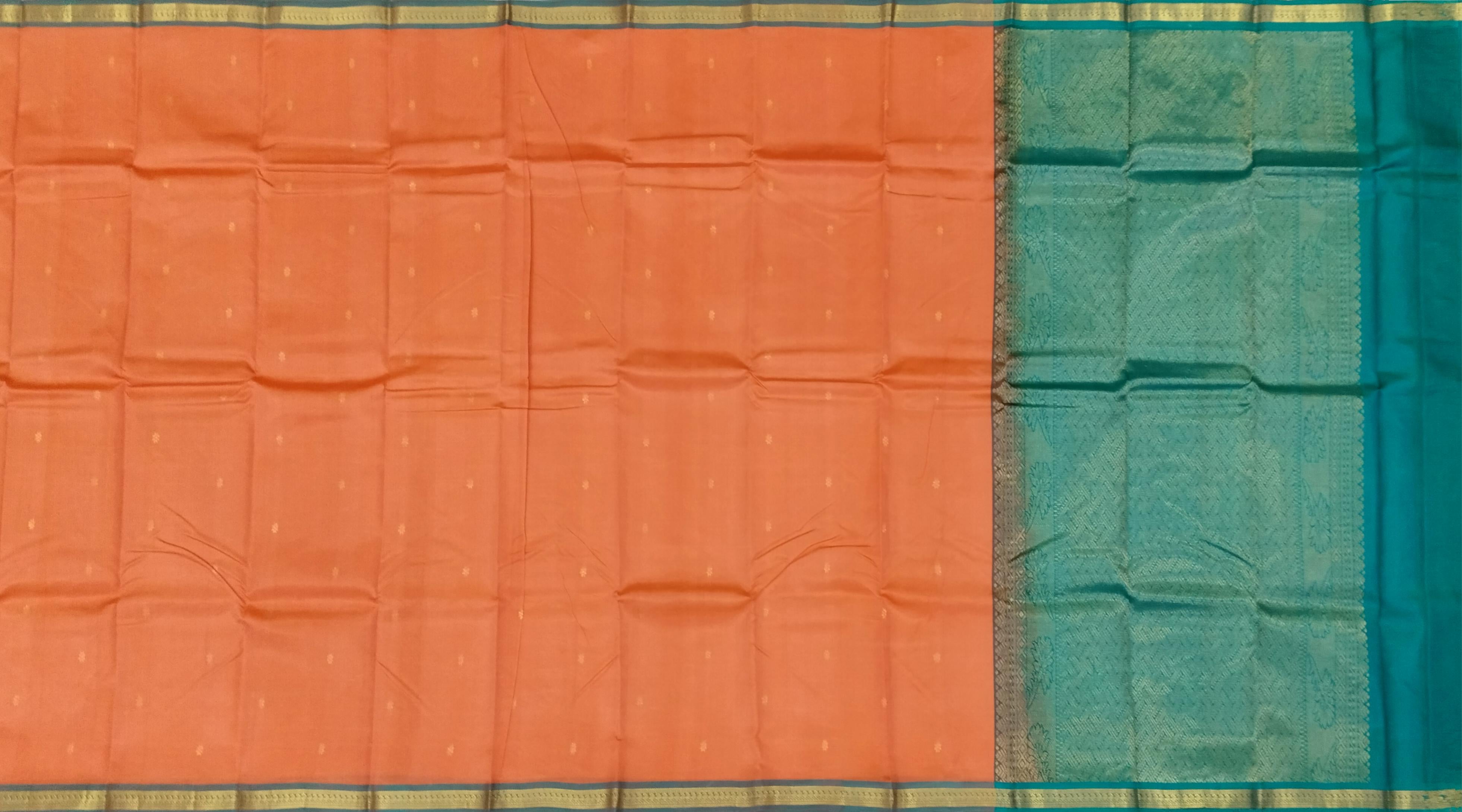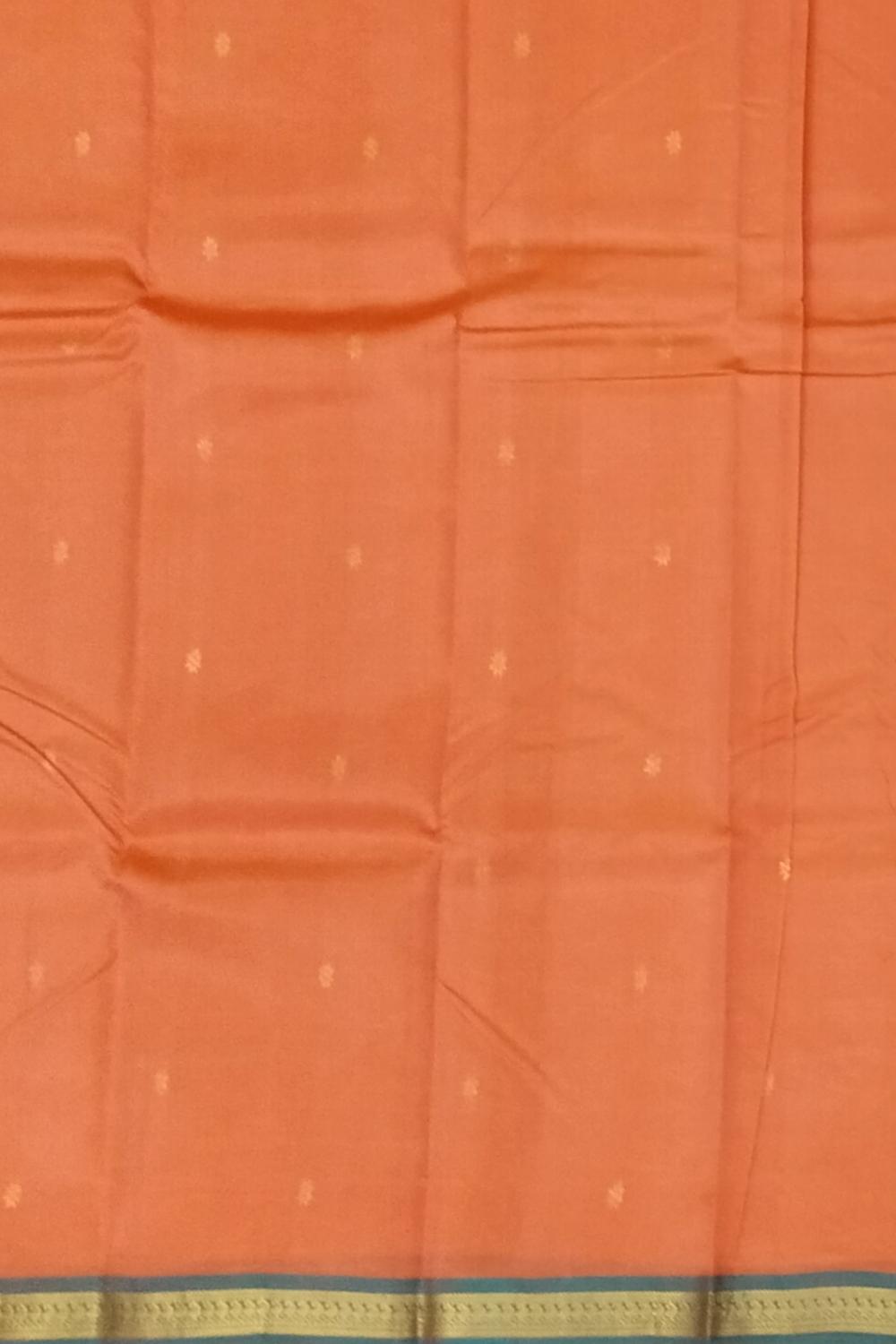 Discover the delicate charm of this Peachish Orange Kanchipuram Silk Saree, gracefully adorned with small bhuttas and charming bluish green accents. The soft peachish-orange body exudes a gentle warmth and feminine appeal, while the tiny, meticulously woven bhuttas add a touch of refined elegance. The subtle presence of bluish-green in the border and pallu creates an unexpected and delightful contrast, adding depth to this exquisite weave.