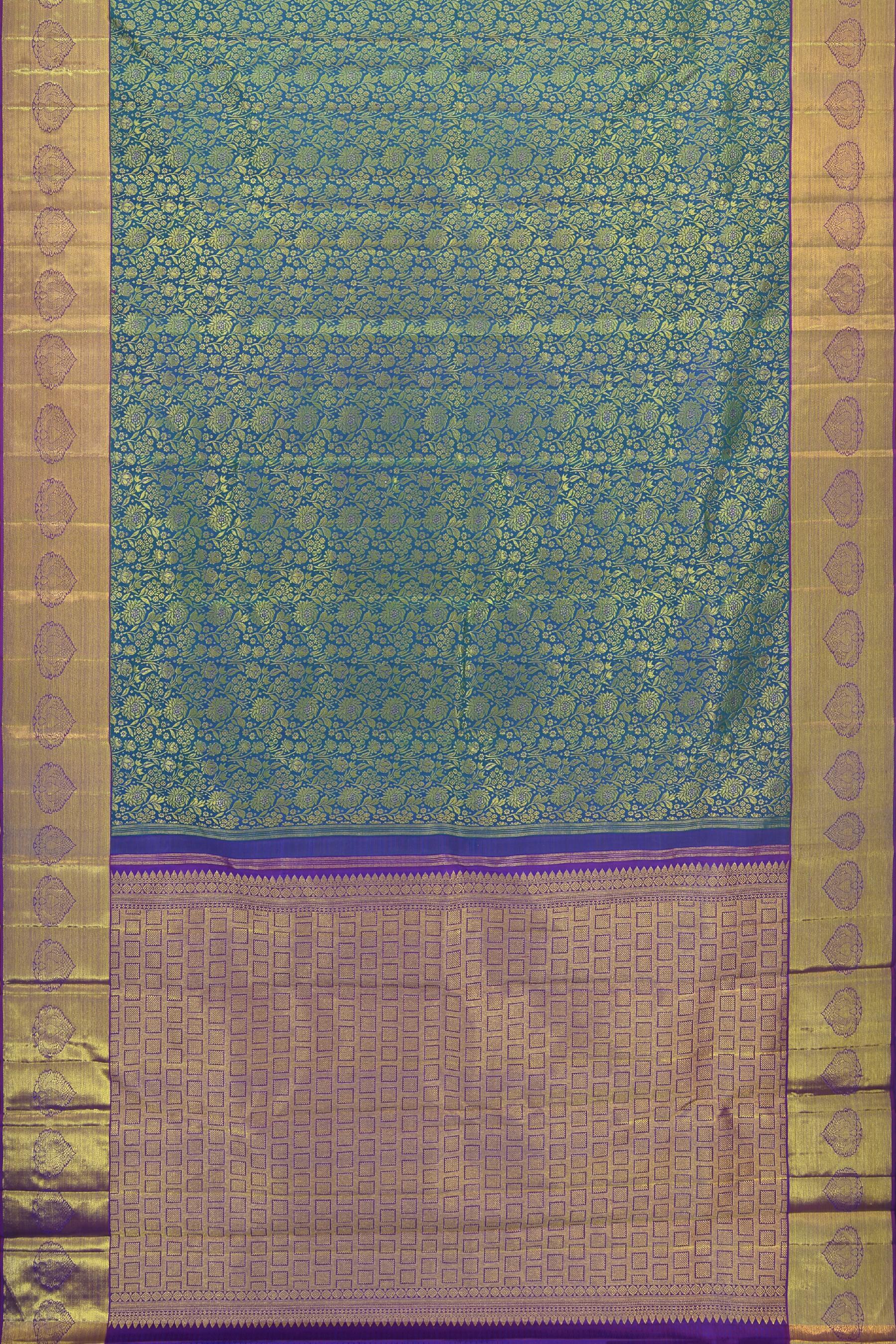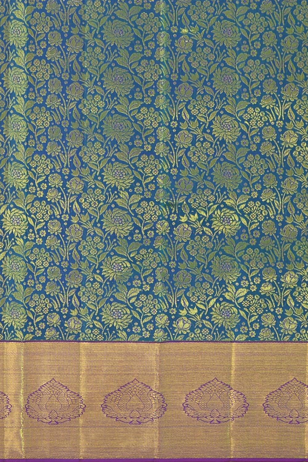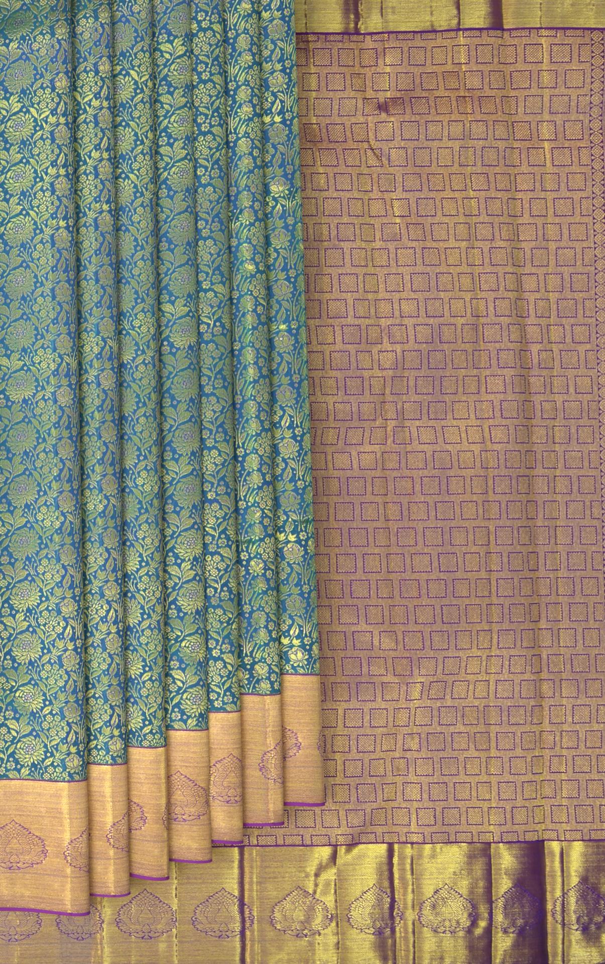 Step into the regal world with our Peacock Blue Kancheevaram silk saree. This enchanting piece is woven with a Jacquard design, featuring silver and gold floral motifs reminiscent of the lush gardens of Indian palaces. The self-colored Violet selvage border enhances the saree's majestic appeal while maintaining an air of classic elegance.