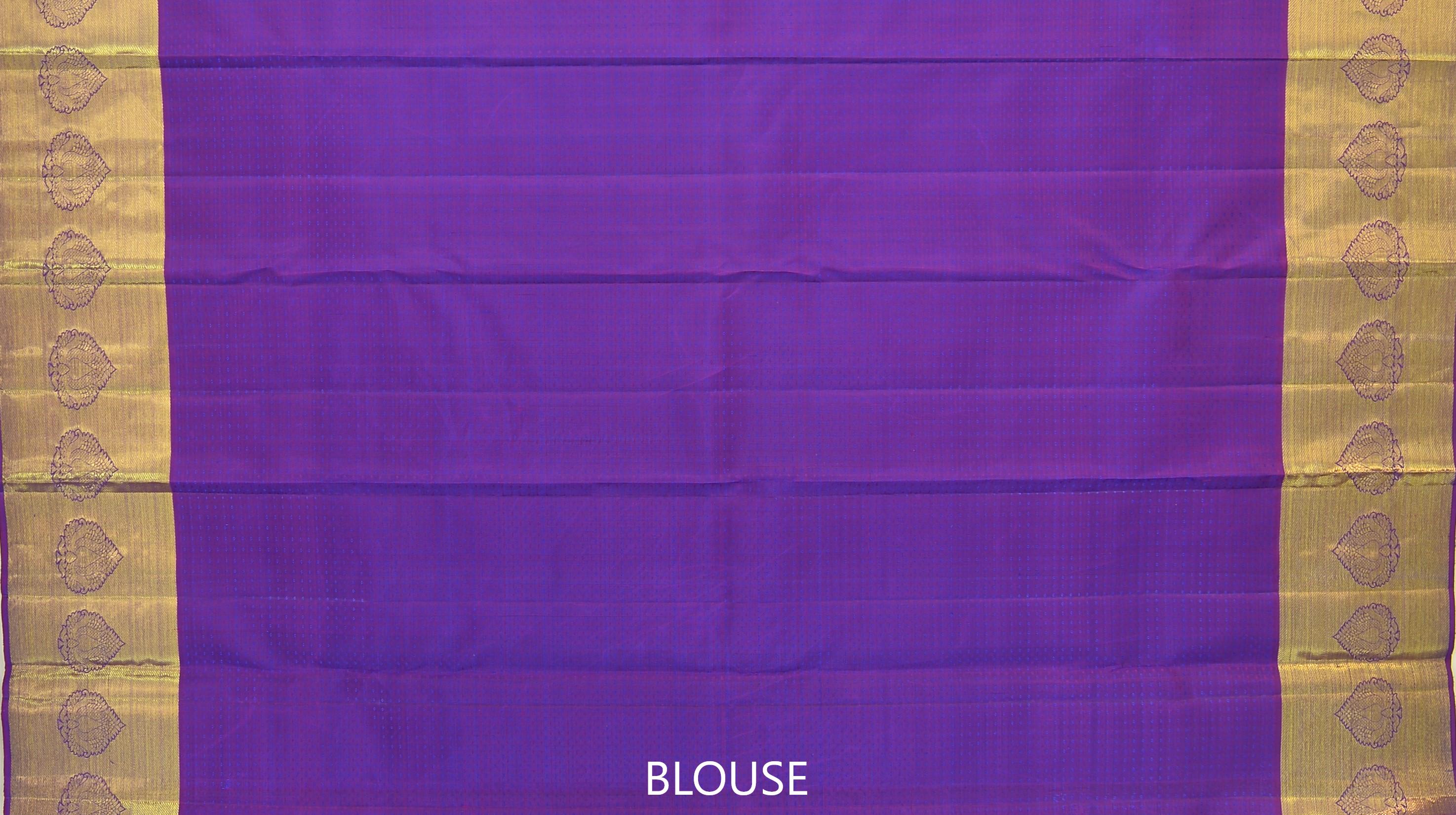 The Violet pallu, adorned with Bavinshi motifs, is a canvas of intricate geometrical checks that portray the precision and artistry of Kancheevaram weaves. Drape yourself in this luxurious creation for a look that's both opulent and tastefully refined.
