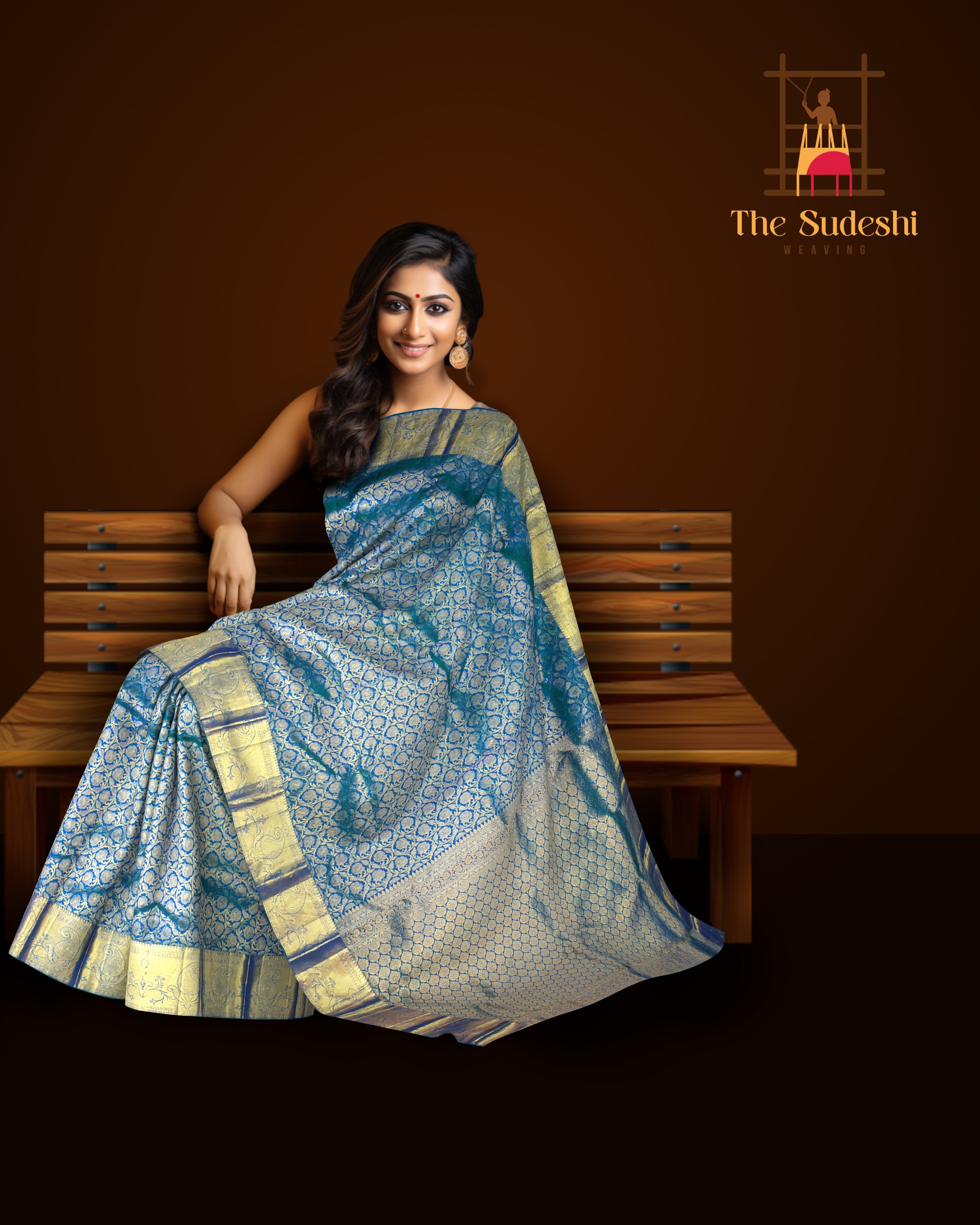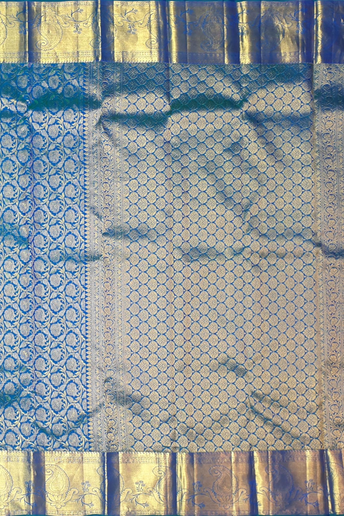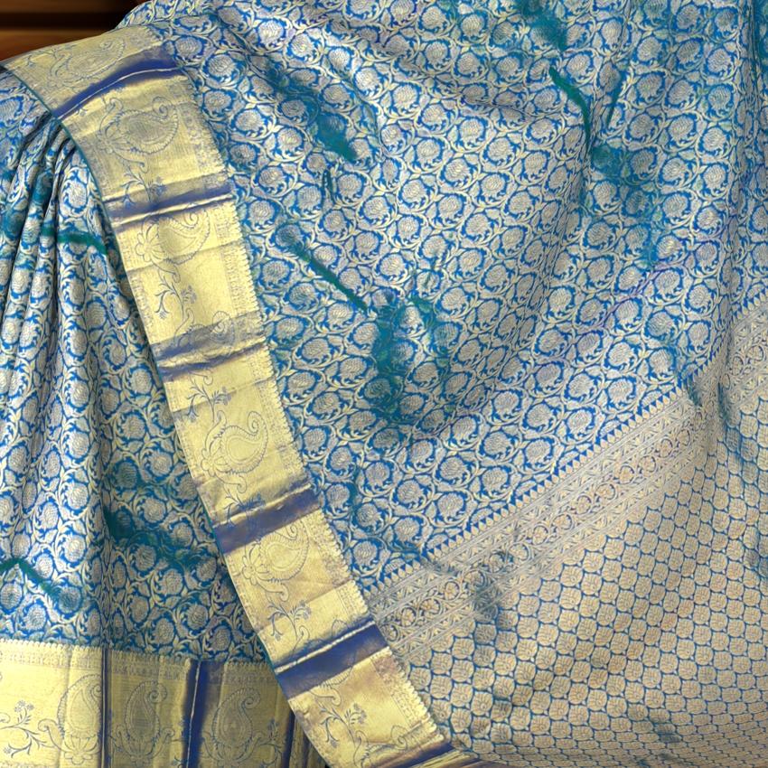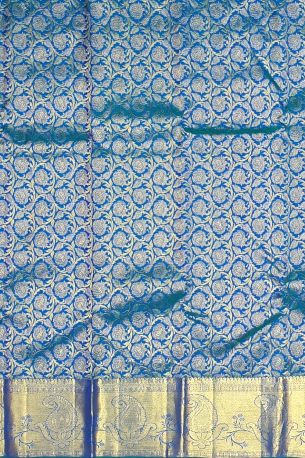 The floral motifs in this brocade represent natural beauty, renewal, and divine grace—elements often echoed in traditional South Indian artistry. The peacock green hue, reminiscent of royalty and vibrance, adds depth and richness to the saree. Woven in the historic town of Kanchipuram, this saree embodies the fusion of age-old weaving techniques and contemporary color sensibilities, making it an enduring piece of cultural heritage.