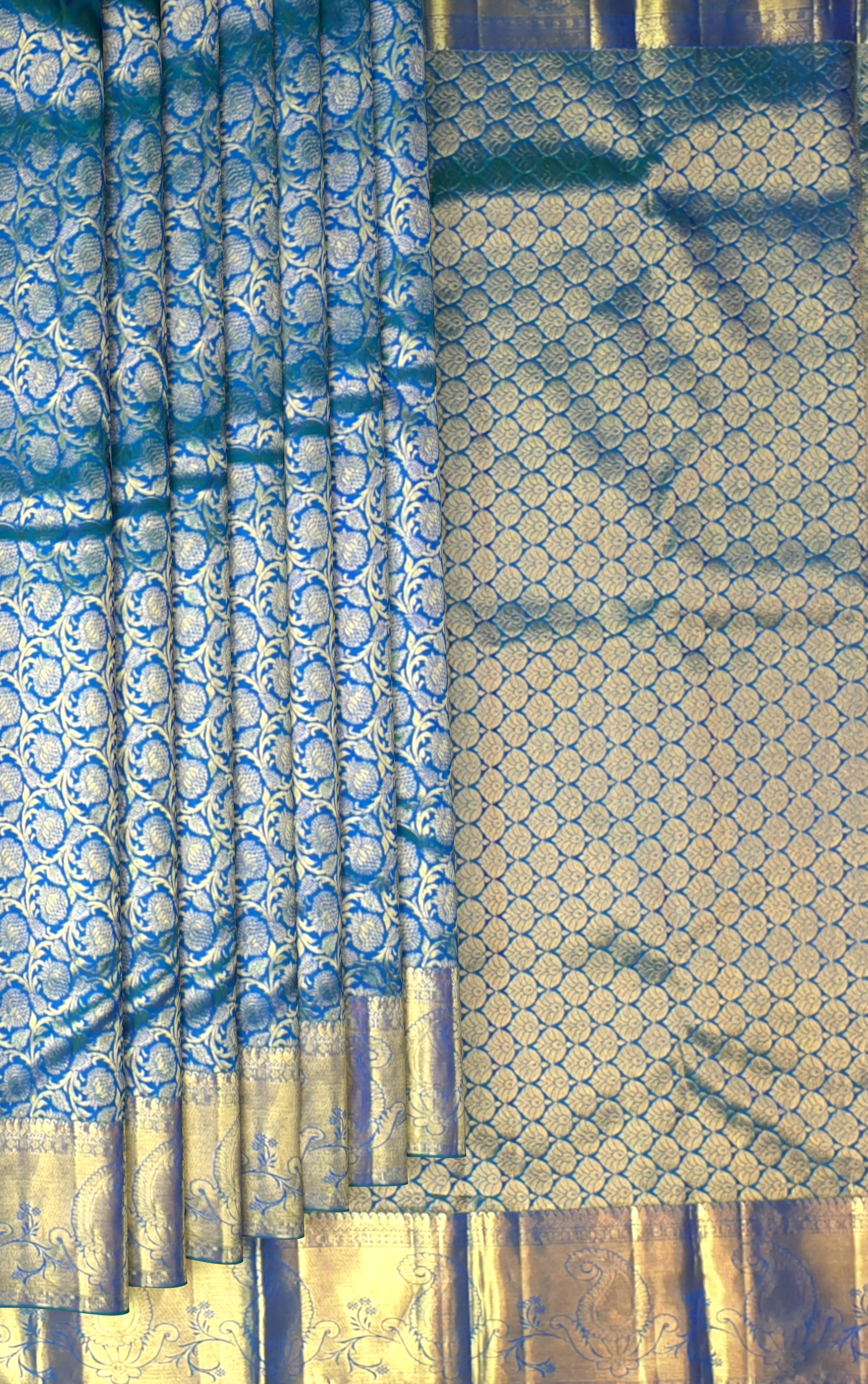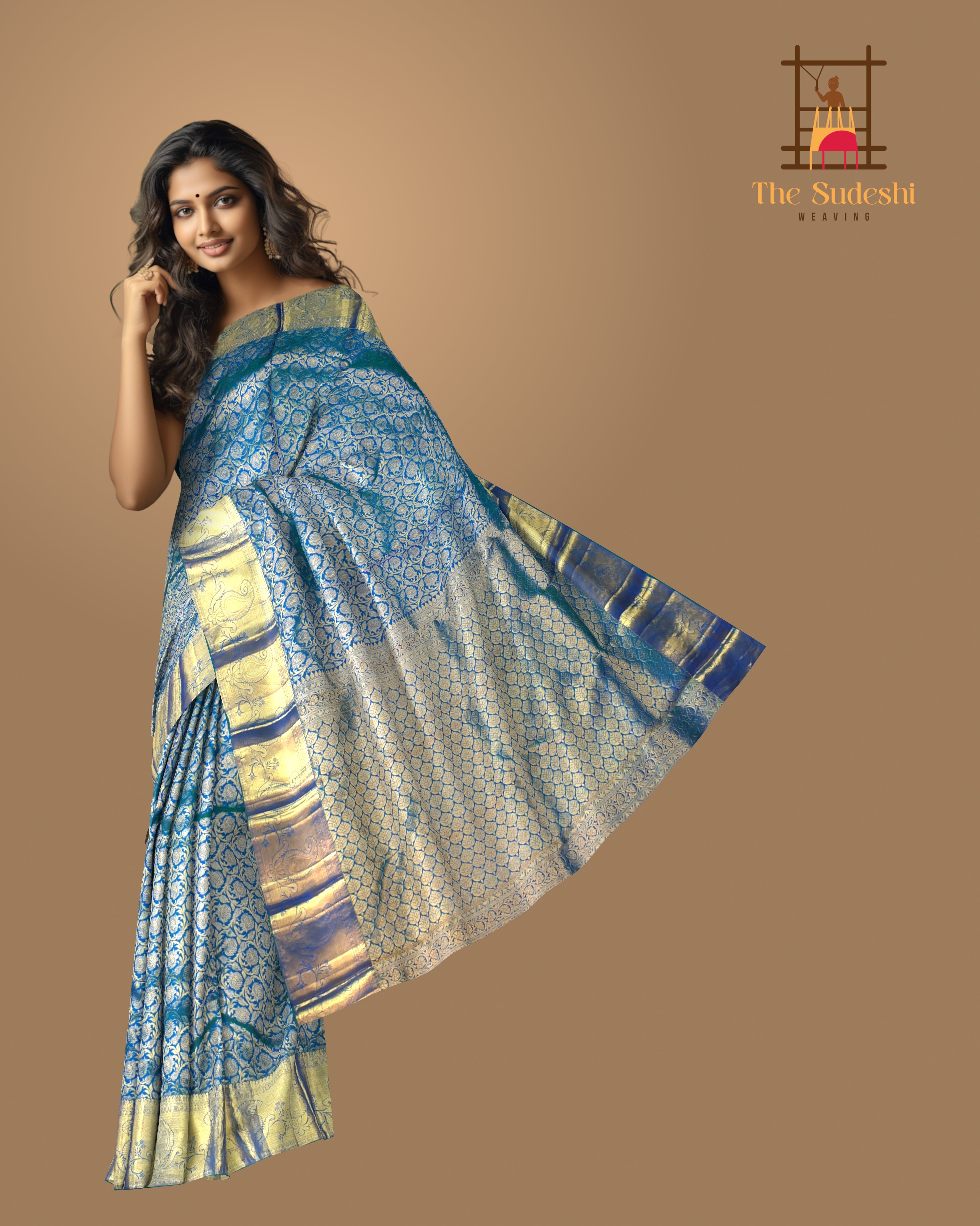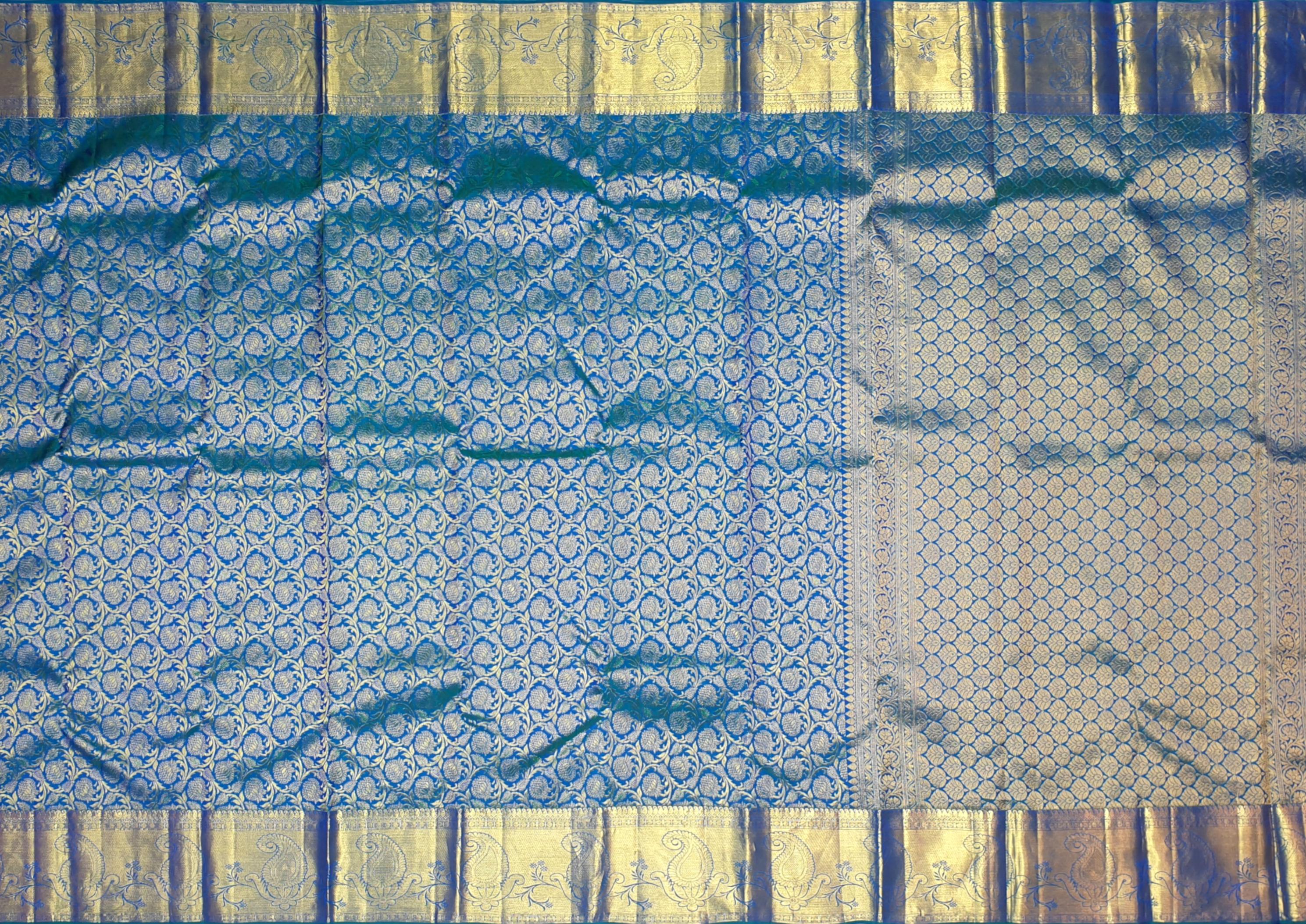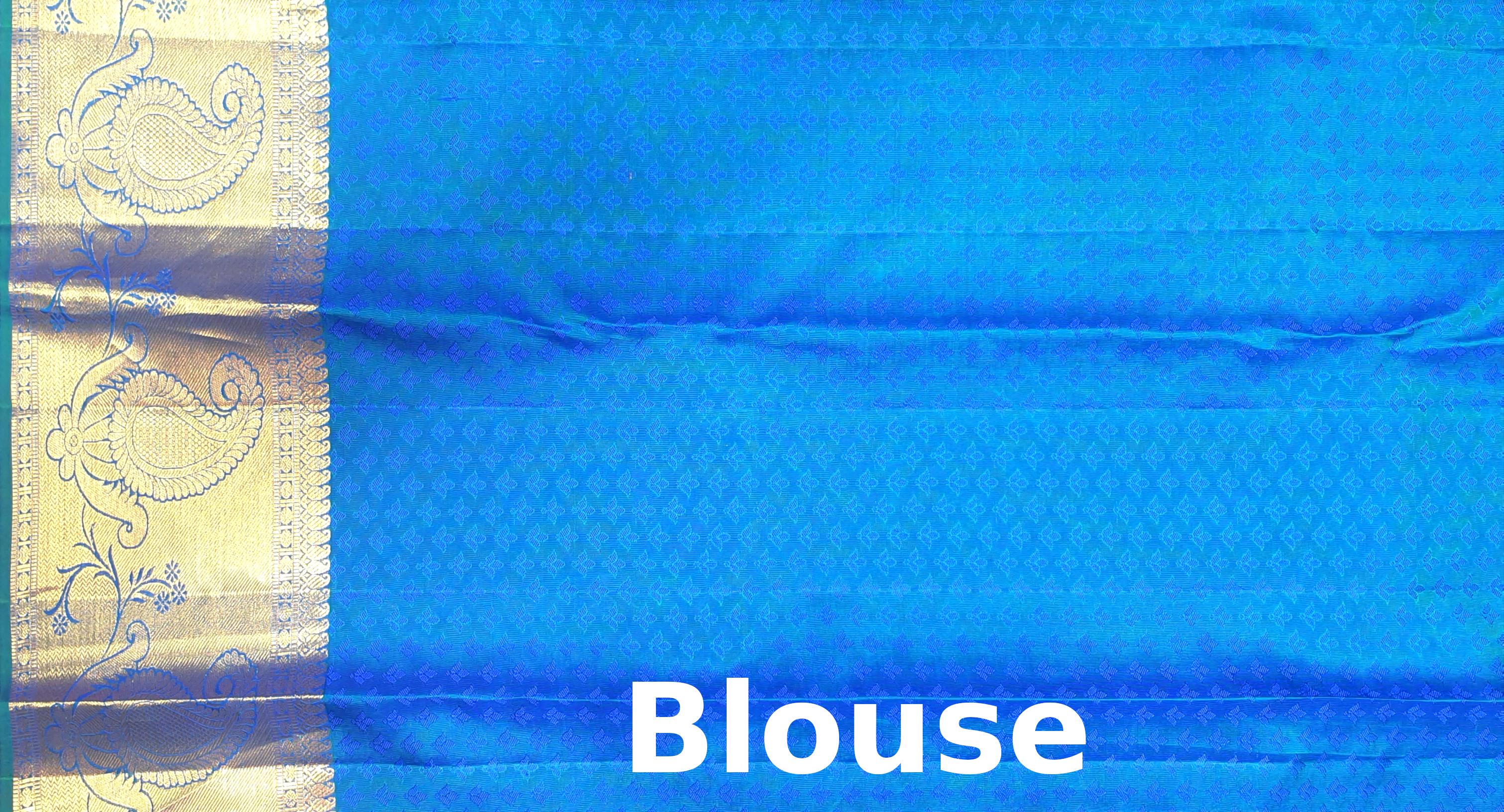The floral motifs in this brocade represent natural beauty, renewal, and divine grace—elements often echoed in traditional South Indian artistry. The peacock green hue, reminiscent of royalty and vibrance, adds depth and richness to the saree. Woven in the historic town of Kanchipuram, this saree embodies the fusion of age-old weaving techniques and contemporary color sensibilities, making it an enduring piece of cultural heritage.