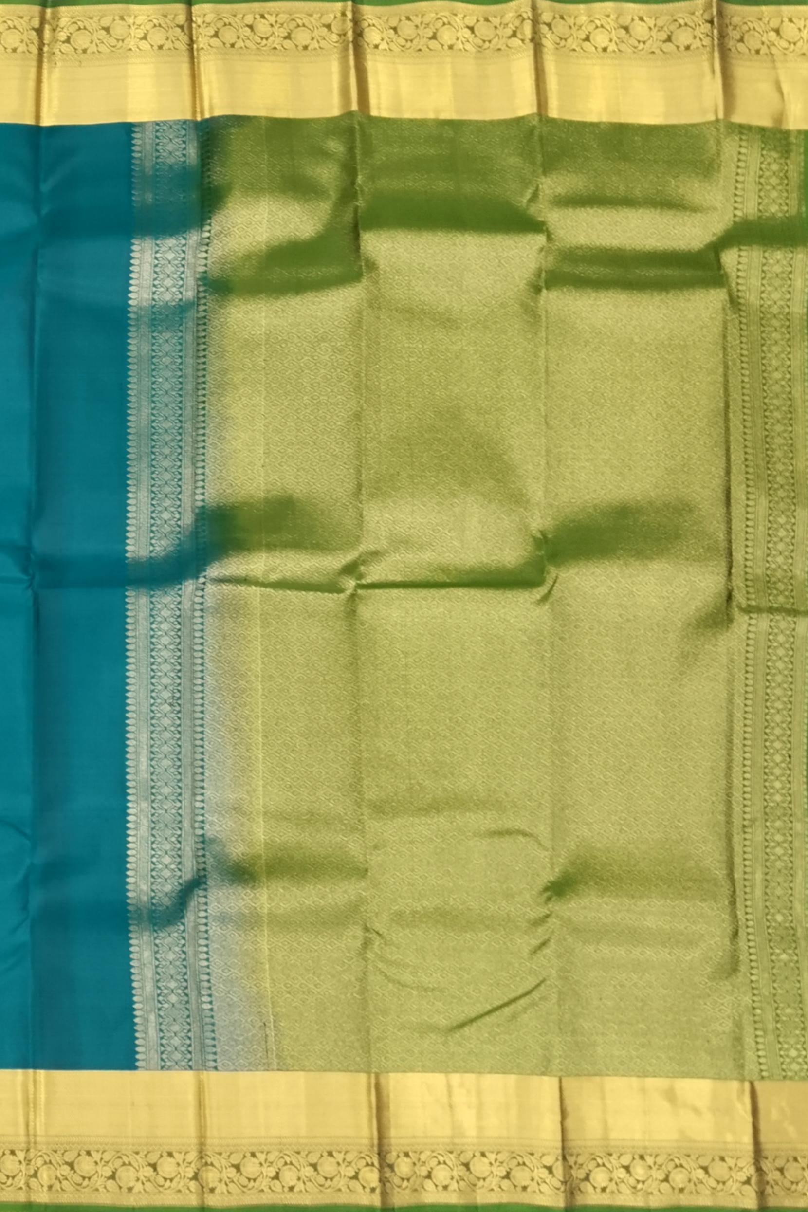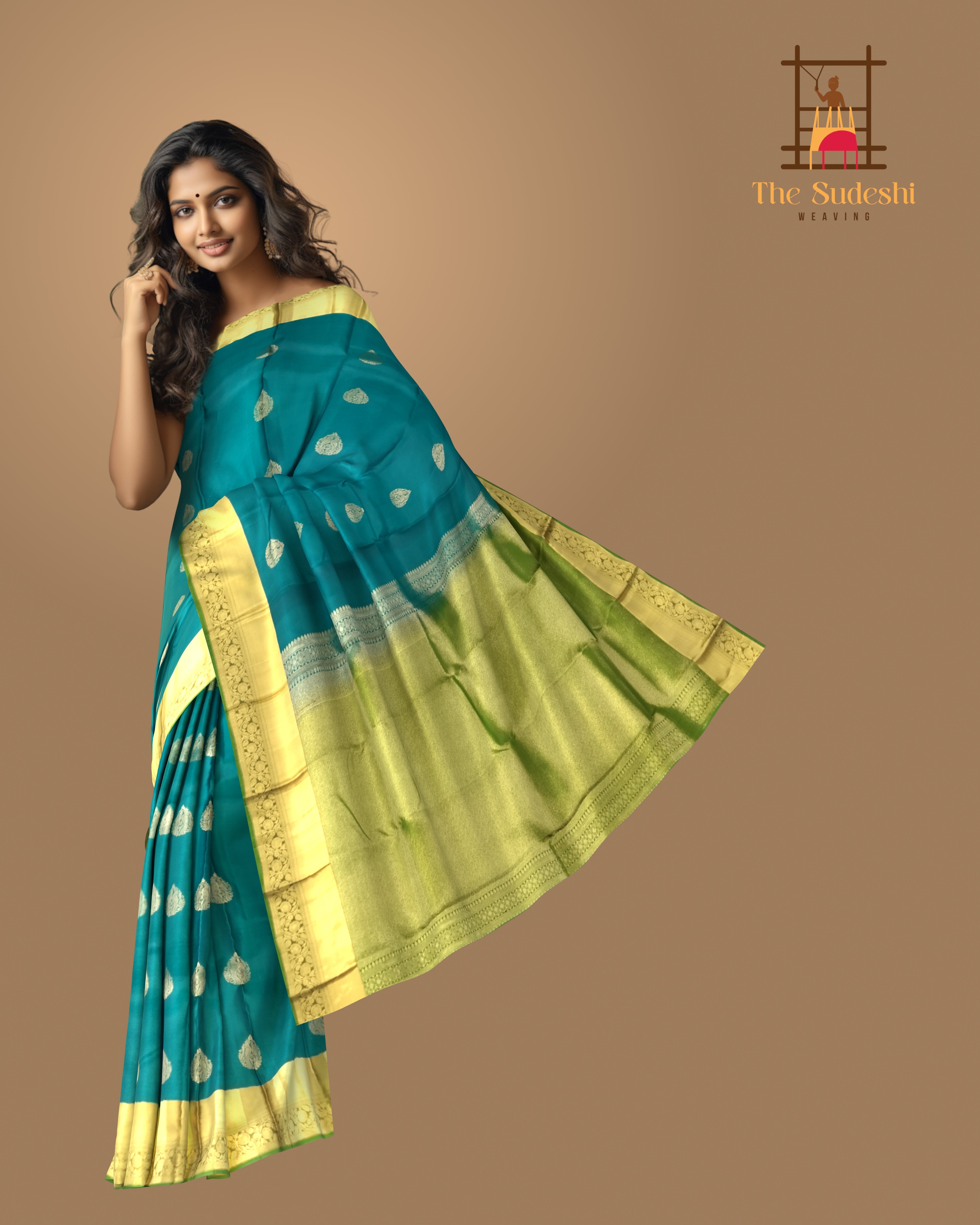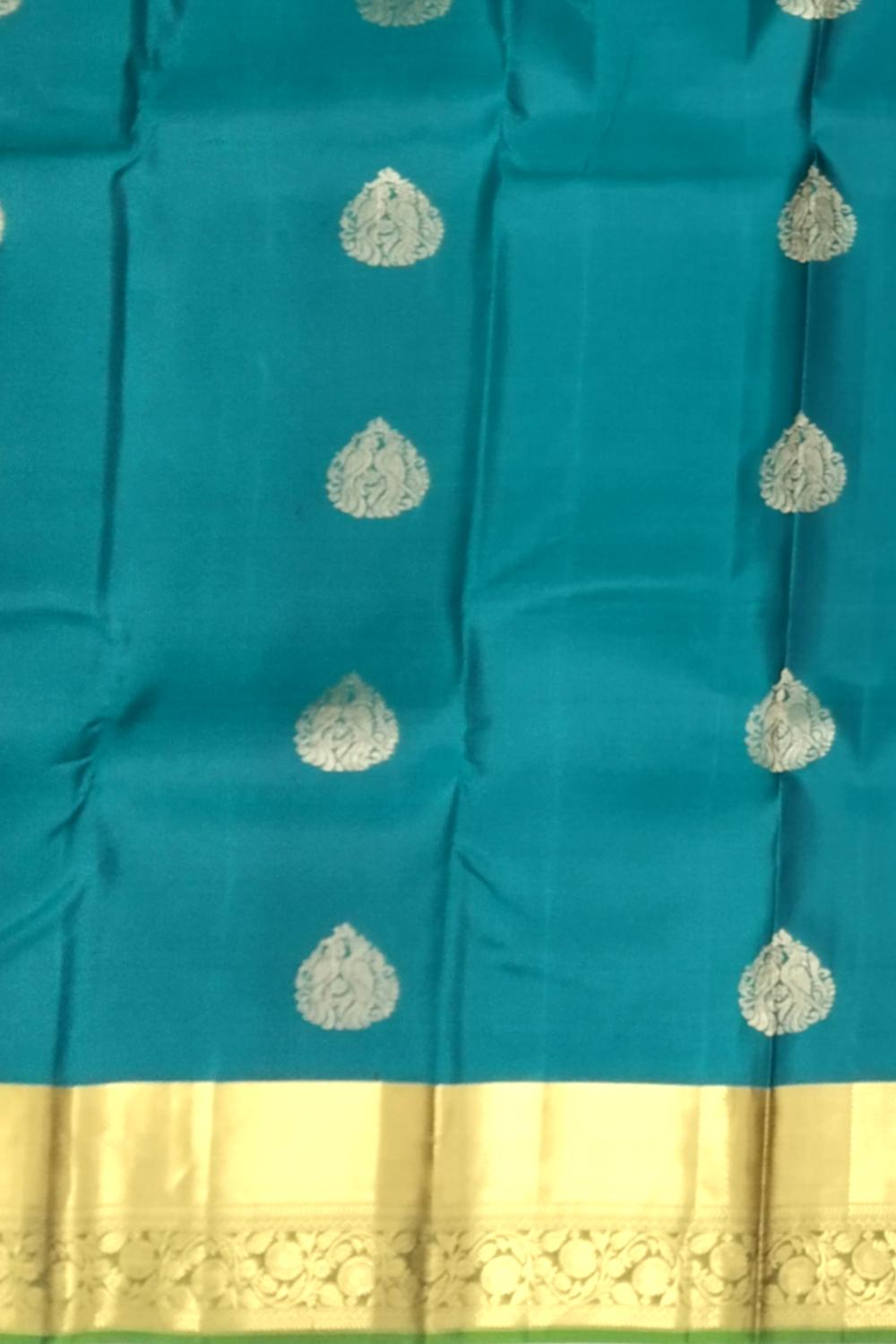 Graceful and eye-catching, this Peacock Green Kanchipuram Silk Saree features delicate tear-shaped buttas that shimmer beautifully against the lustrous silk body. The self-green border and pallu add a subtle continuity that highlights the saree’s deep and elegant tone. This drape embodies both traditional finesse and modern simplicity, making it a must-have in every saree lover’s collection. Kanchipuram sarees are crafted using the highest quality mulberry silk, known for its luster, strength, and luxurious feel. Each saree represents the skilled craftsmanship of weavers from Kanchipuram, who bring centuries of tradition alive in every weave. This saree pairs perfectly with a matching or contrast gold blouse and statement temple jewellery. Ideal for festive occasions, poojas, and weddings, it effortlessly balances heritage with contemporary elegance. Note: The appearance of the product’s colors may vary due to lighting conditions or your device’s screen calibration. For further assistance or additional images/videos, feel free to contact us at +91 97897 60367 or email at wecare@thesudeshiweaving.com.