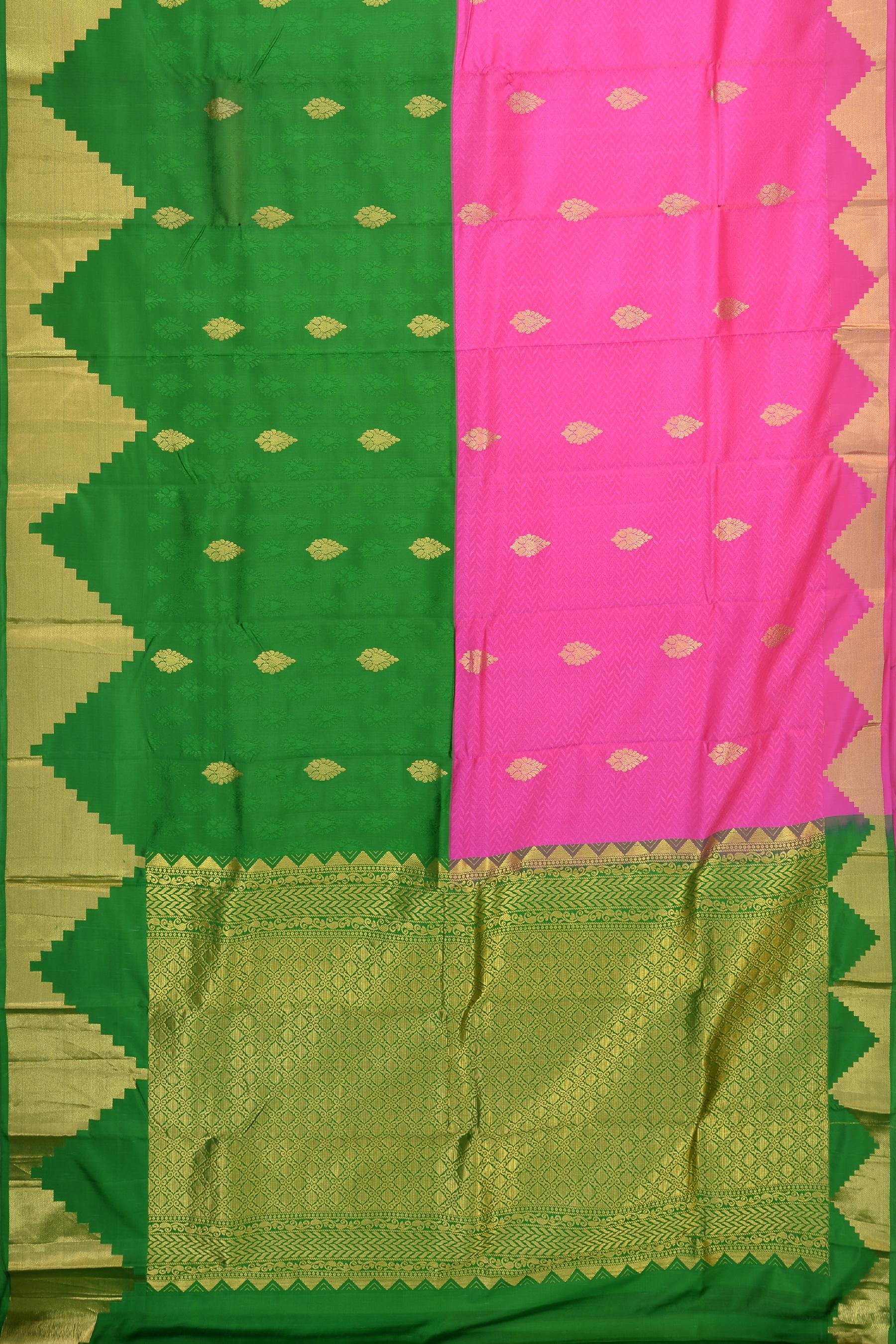 Step into a realm of natural harmony with our Pink and Green Kancheevaram silk saree. This half-and-half saree, featuring jacquard with tear-shaped butta, beautifully blends two of nature's most vibrant colors. The Green temple border adds a traditional touch, complementing the saree's dual-tone elegance.
