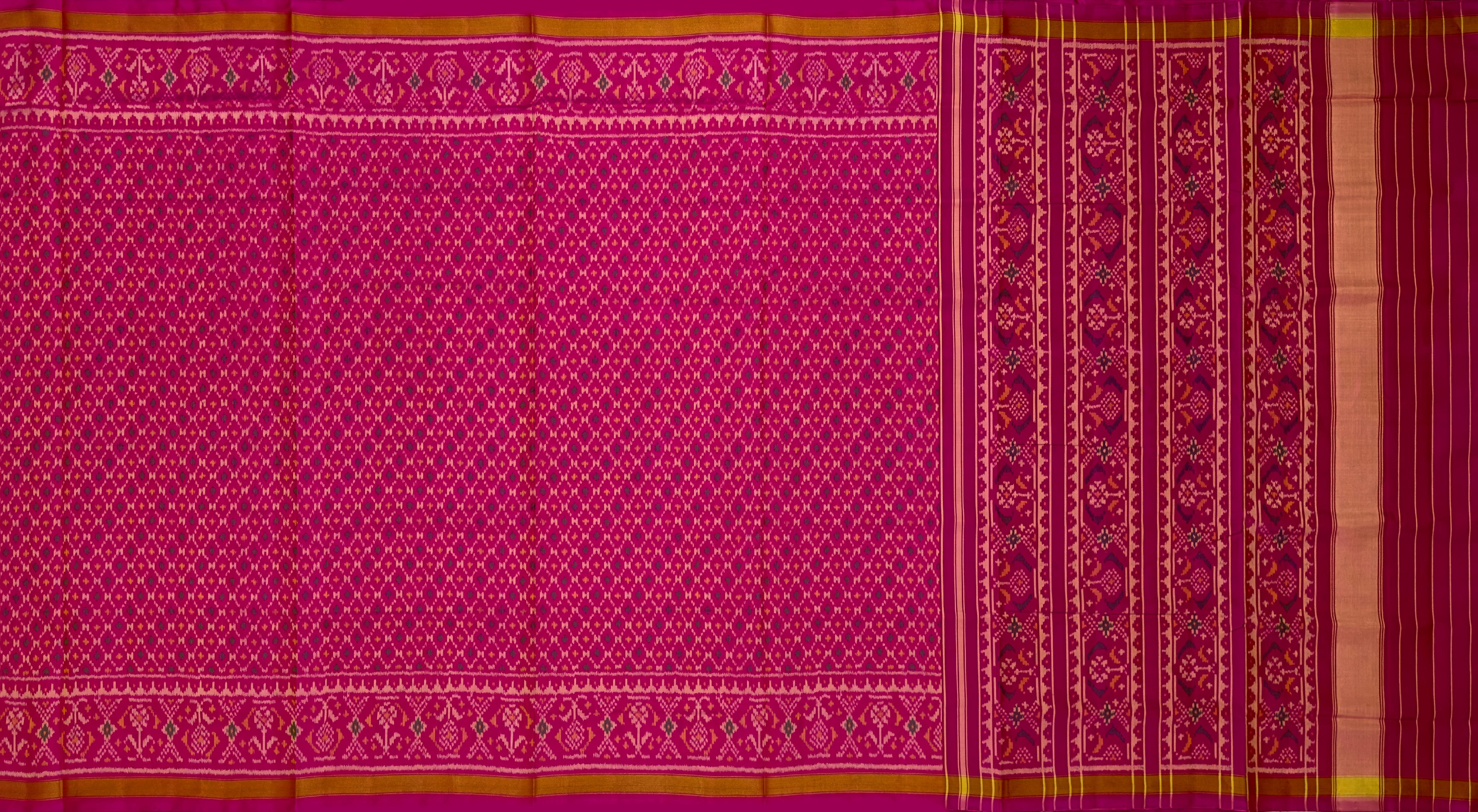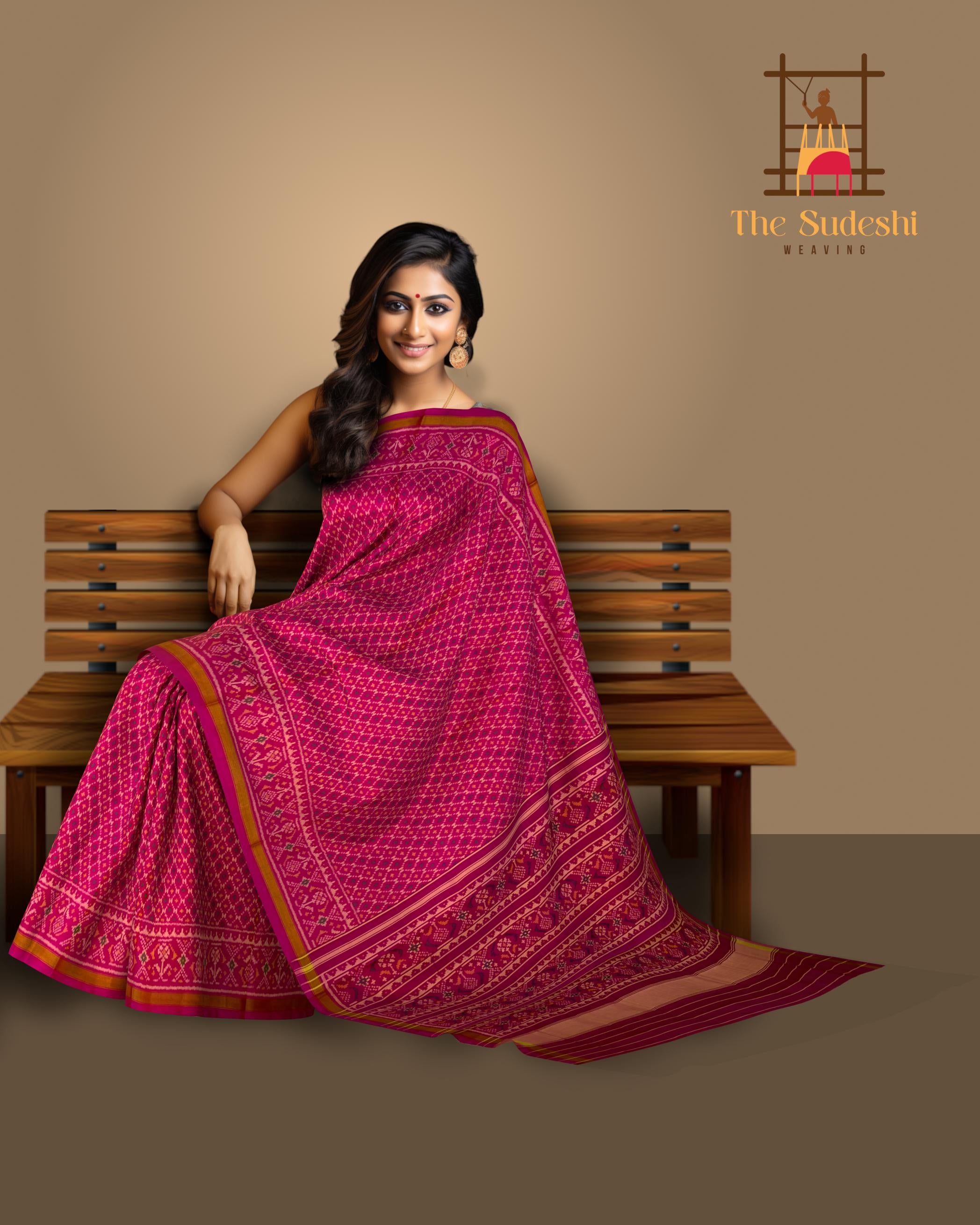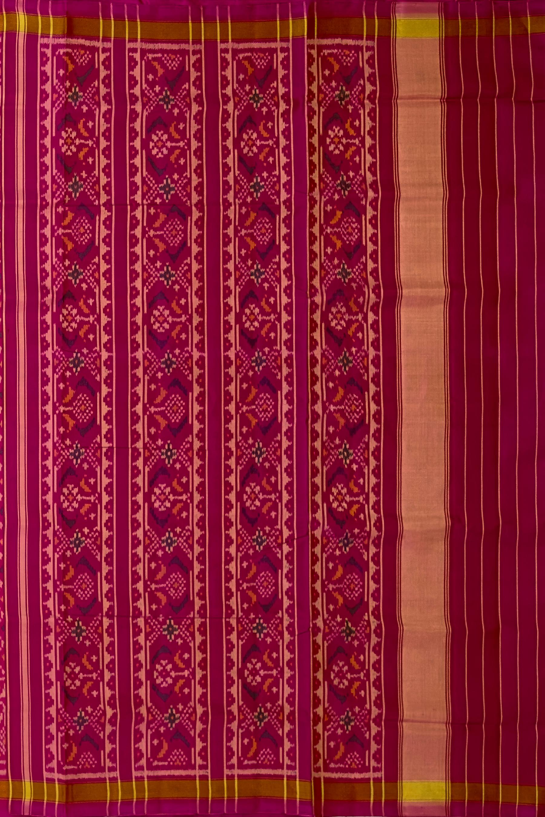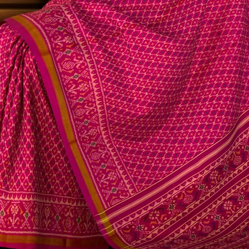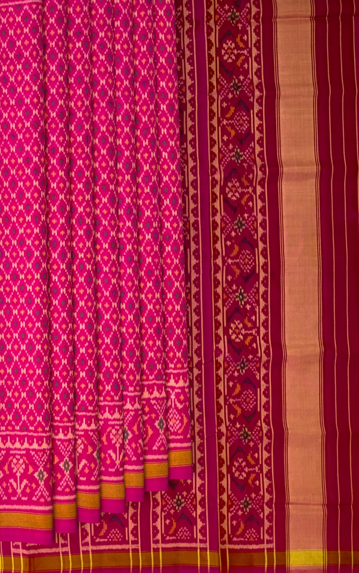 Unveil the elegance of the Pink Daliyabhat Patola Saree, a masterpiece of traditional Indian artistry. Crafted using the single ikat technique, this saree features the Daliyabhat design, showcasing intricate and luxurious patterns. The vibrant pink color enhances the beauty of the detailed motifs that flow seamlessly from the body to the pallu. The semi-lustrous finish adds a touch of modern sophistication, making it a versatile choice for various occasions. Perfect for grand weddings, cultural celebrations, and social gatherings, this saree is designed for the modern NRI woman who values her Indian heritage. It symbolizes centuries of artisan tradition, making each piece a unique work of art. Celebrate your heritage with the Pink Daliyabhat Patola Saree, a timeless piece that exudes tradition and elegance.