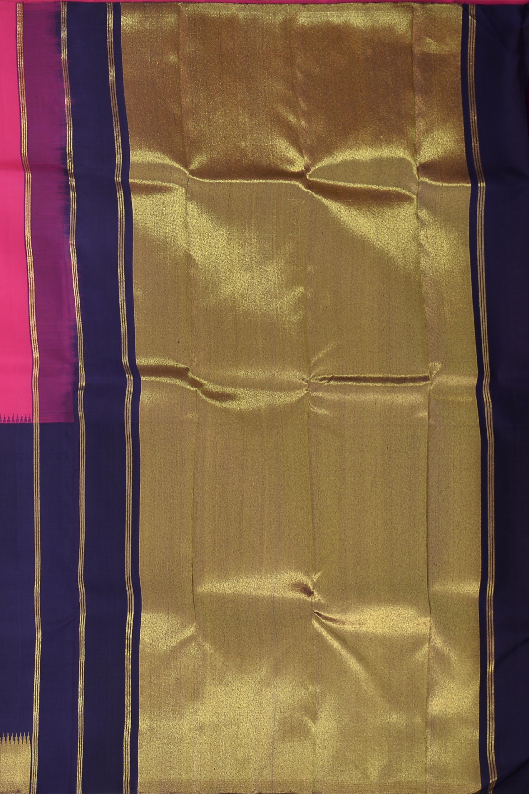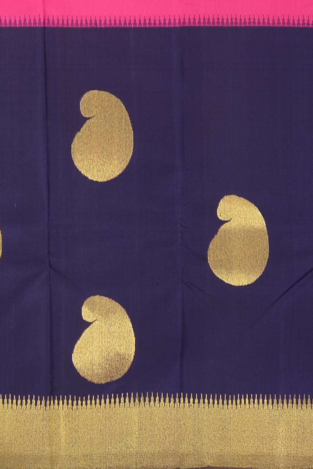 This pink Kanchipuram silk saree whispers tales of romance and elegance, woven with the utmost care and skill. The long blue border, adorned with mango butta and seep reku, frames the saree in a narrative of serene beauty and sophisticated charm. The navy blue grand tissue pallu unfolds like a dream, complemented by the delicate texture of the silk, creating an ensemble that is both enchanting and majestic.