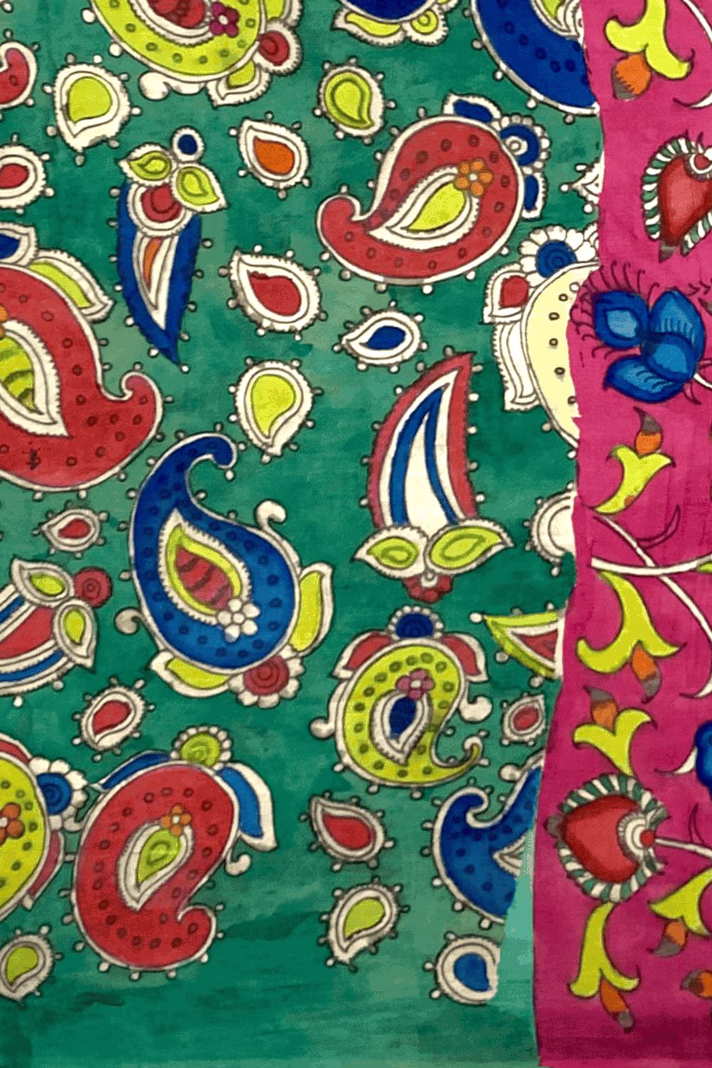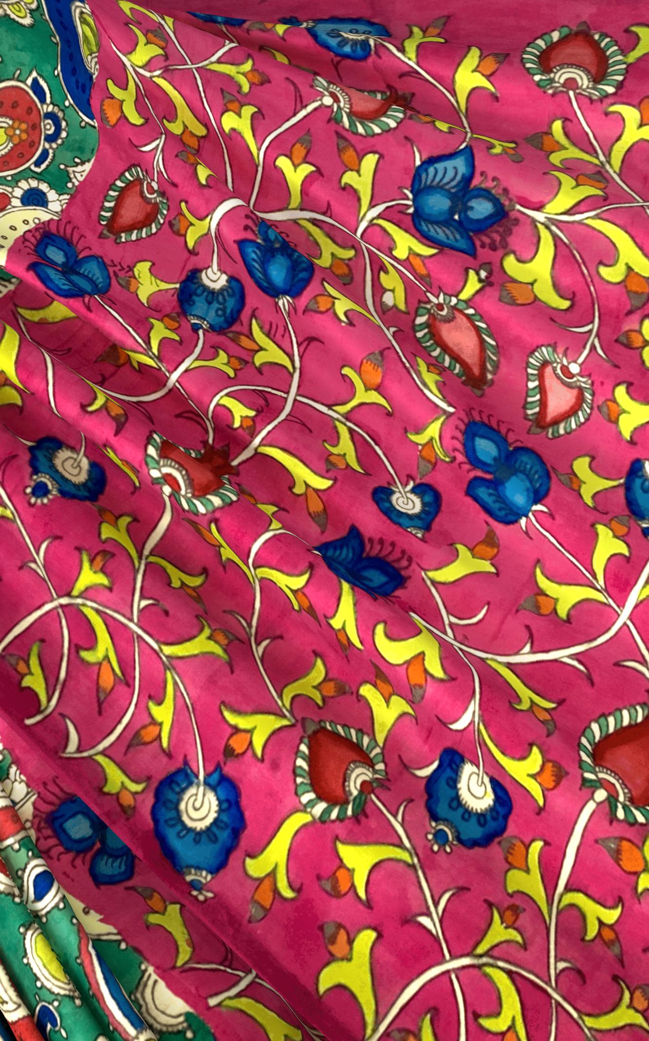 Radiate elegance with this stunning Pink Green Kalamkari saree, featuring a single-side design. The dual-tone pink and green hues create a striking contrast, while the green accents add a touch of nature.