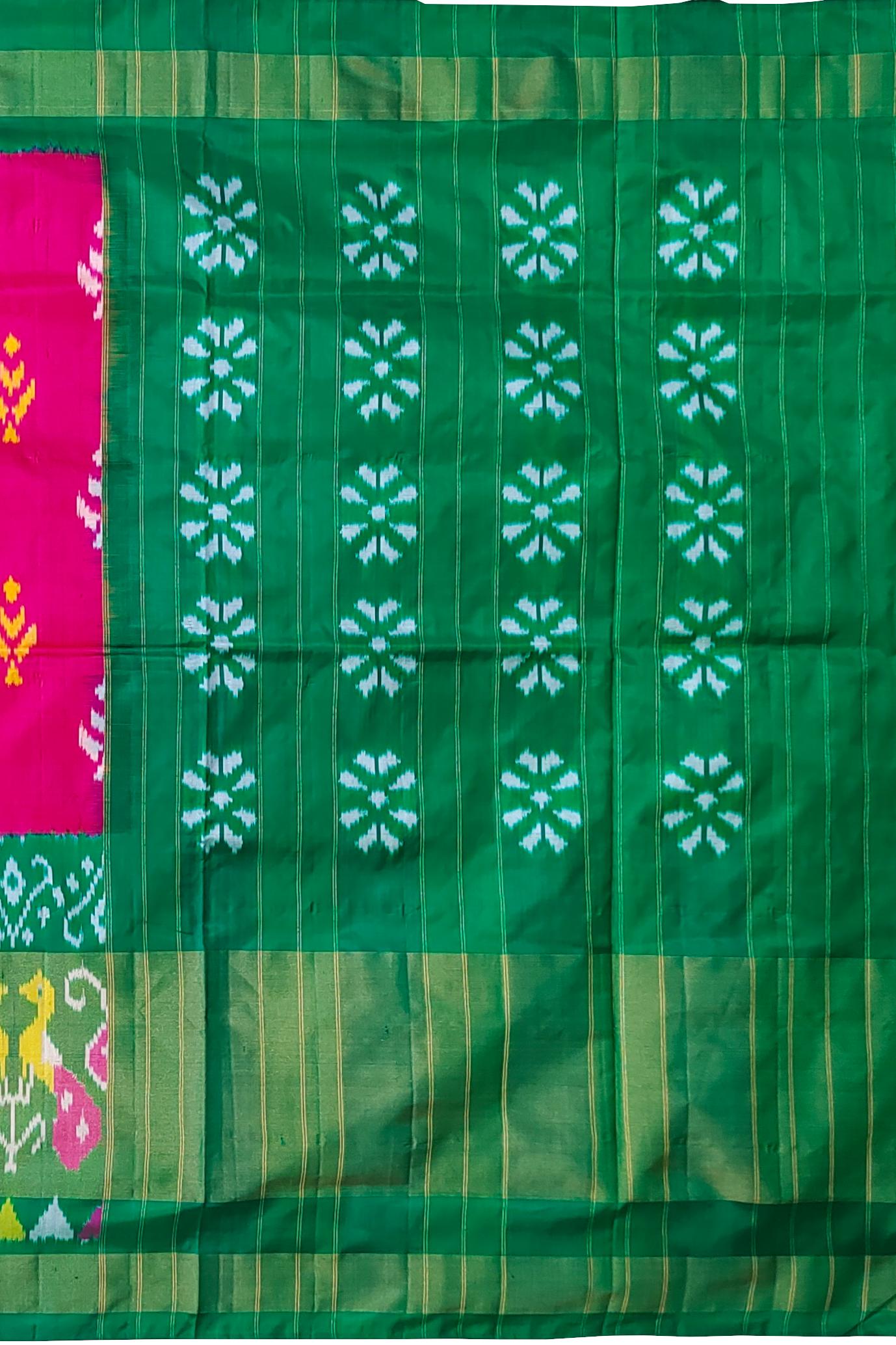 This stunning Pink Green Pochampally Single Ikat Handloom Saree is a beautiful piece that showcases the artistry of traditional Indian craftsmanship. The saree features intricate gold zari work on a pink and green background, creating a striking contrast that exudes elegance and sophistication.