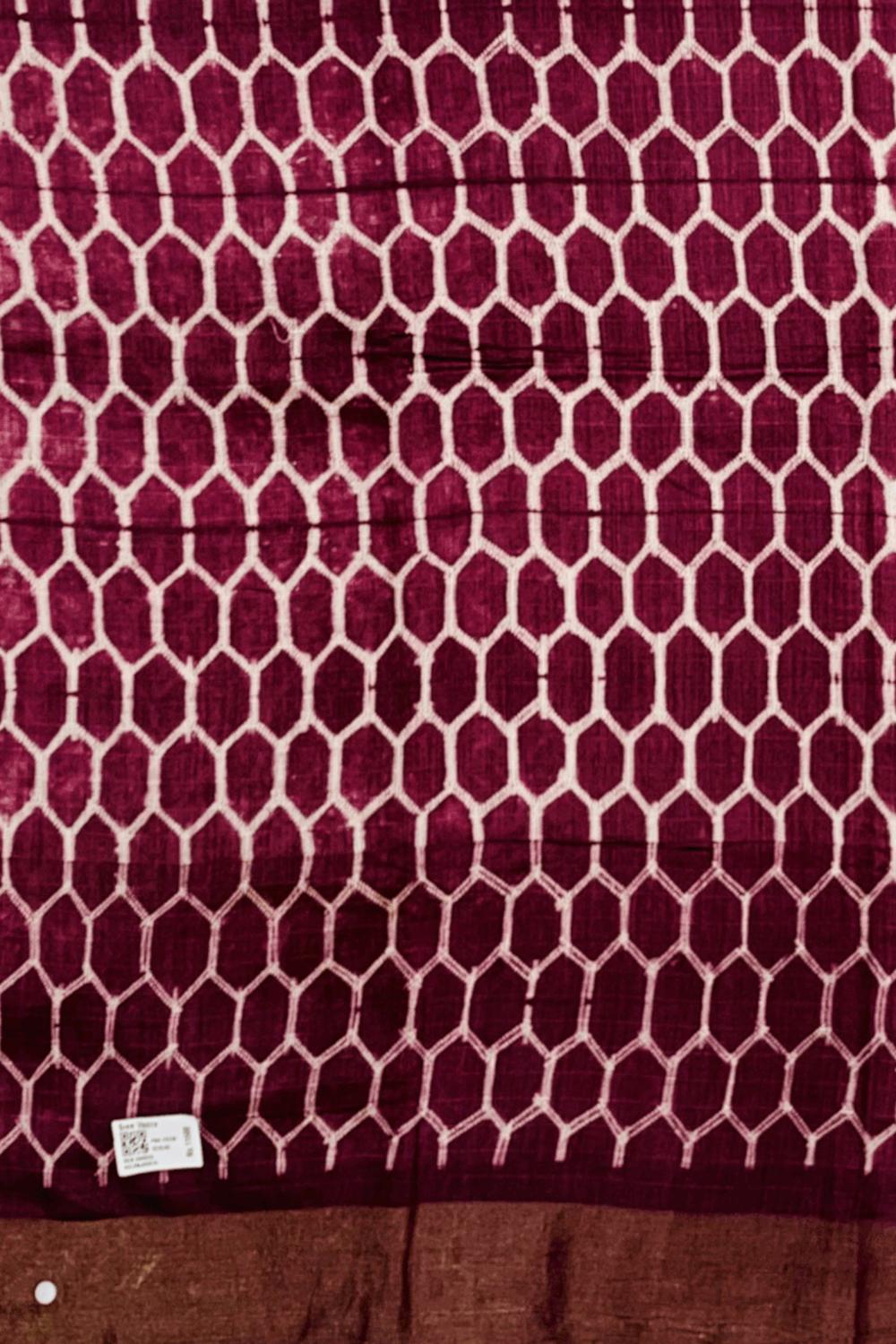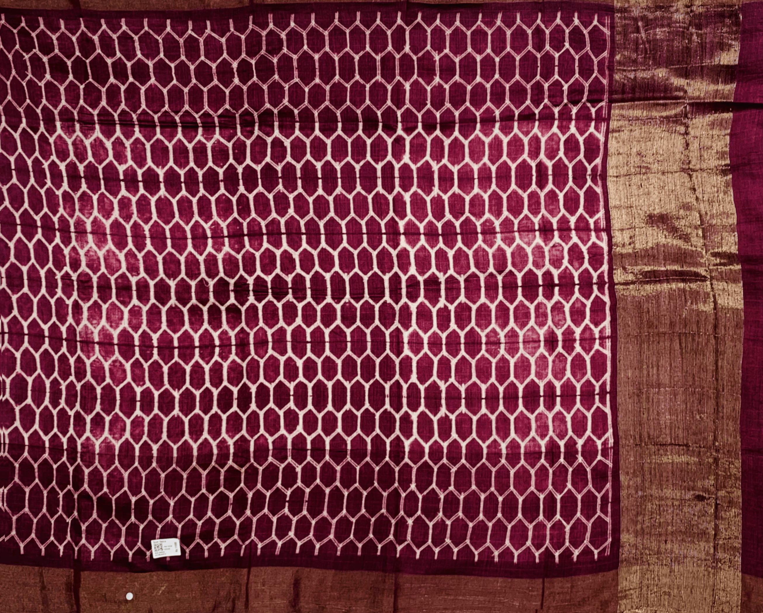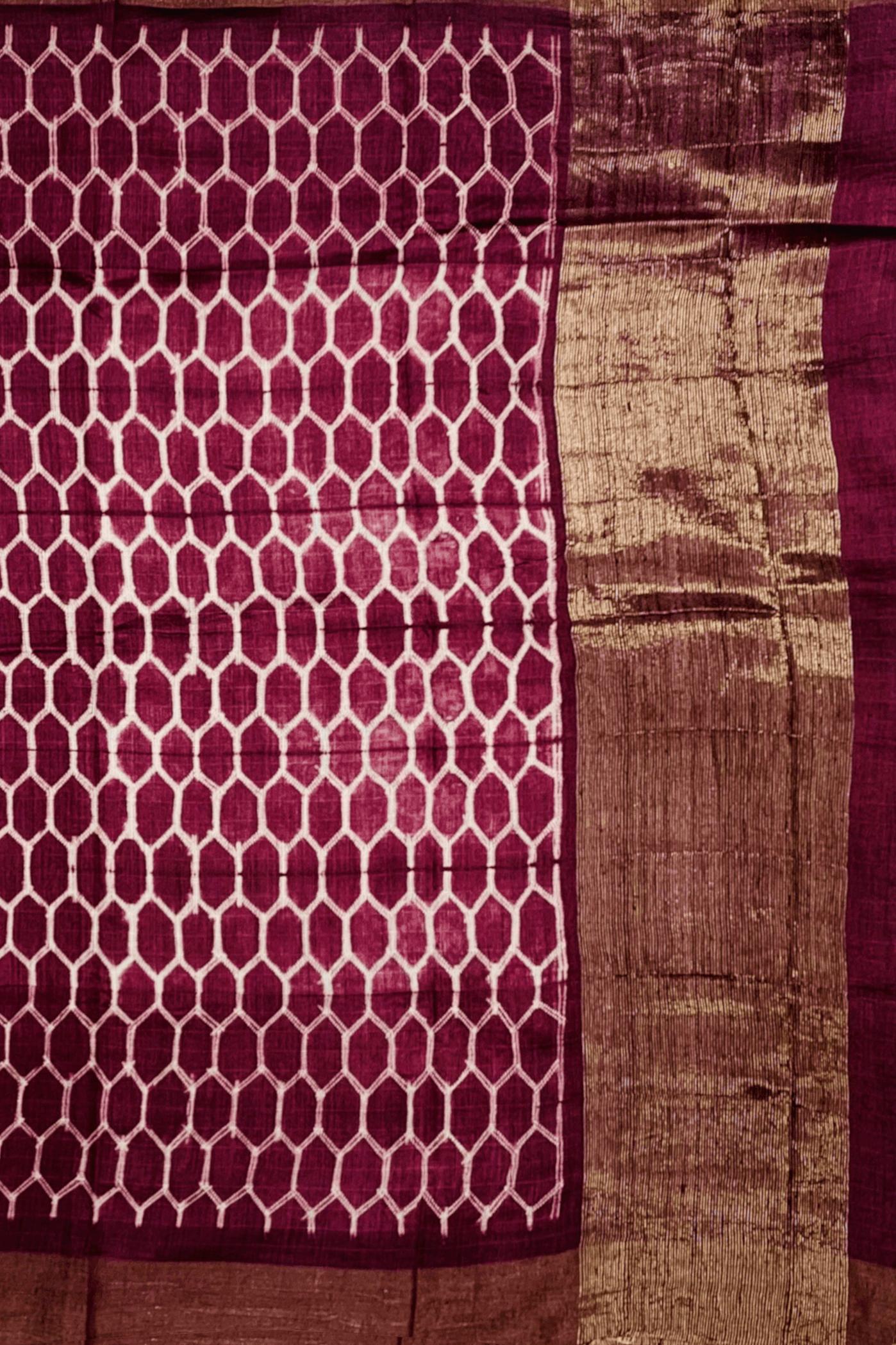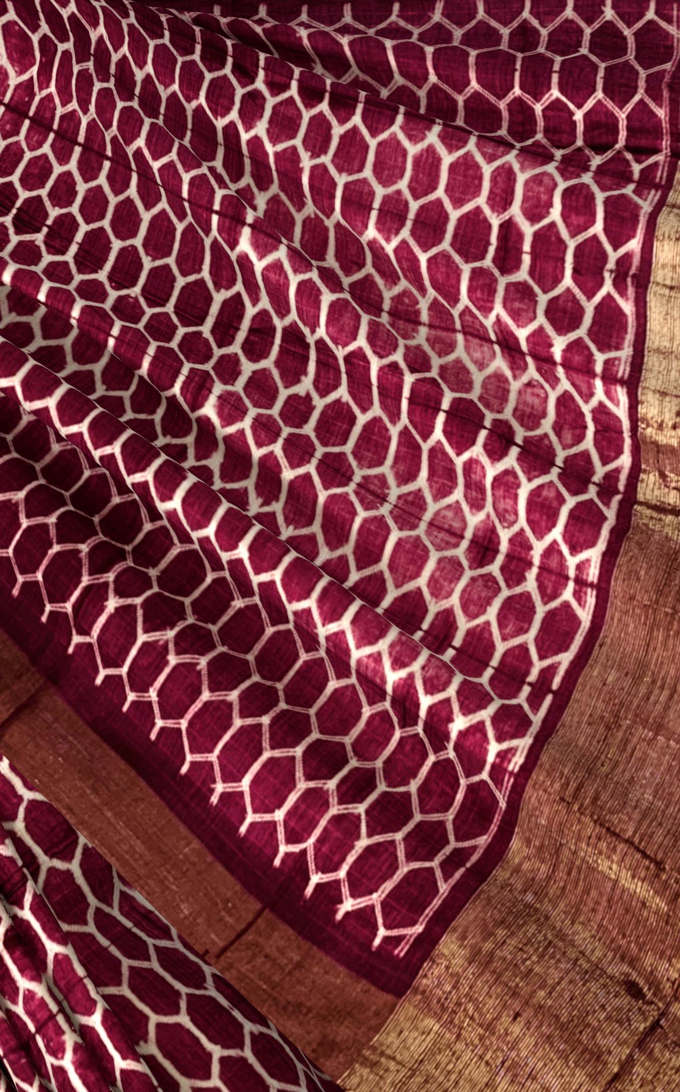 Make a statement with this vibrant Pink Hexagon Tussar saree, featuring a single-side design. The dual-tone pink and Hexagon hues create a striking contrast, while the gold accents add a touch of elegance.