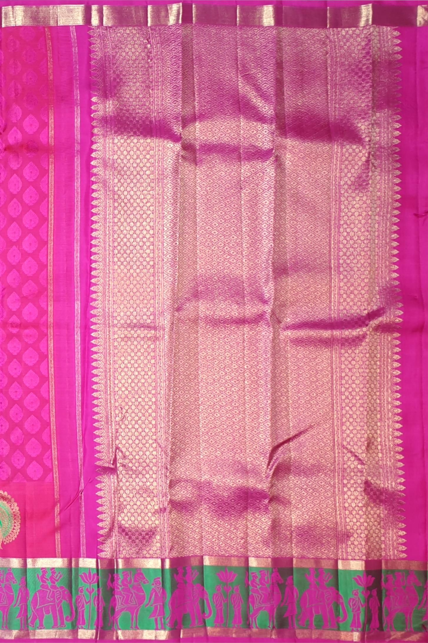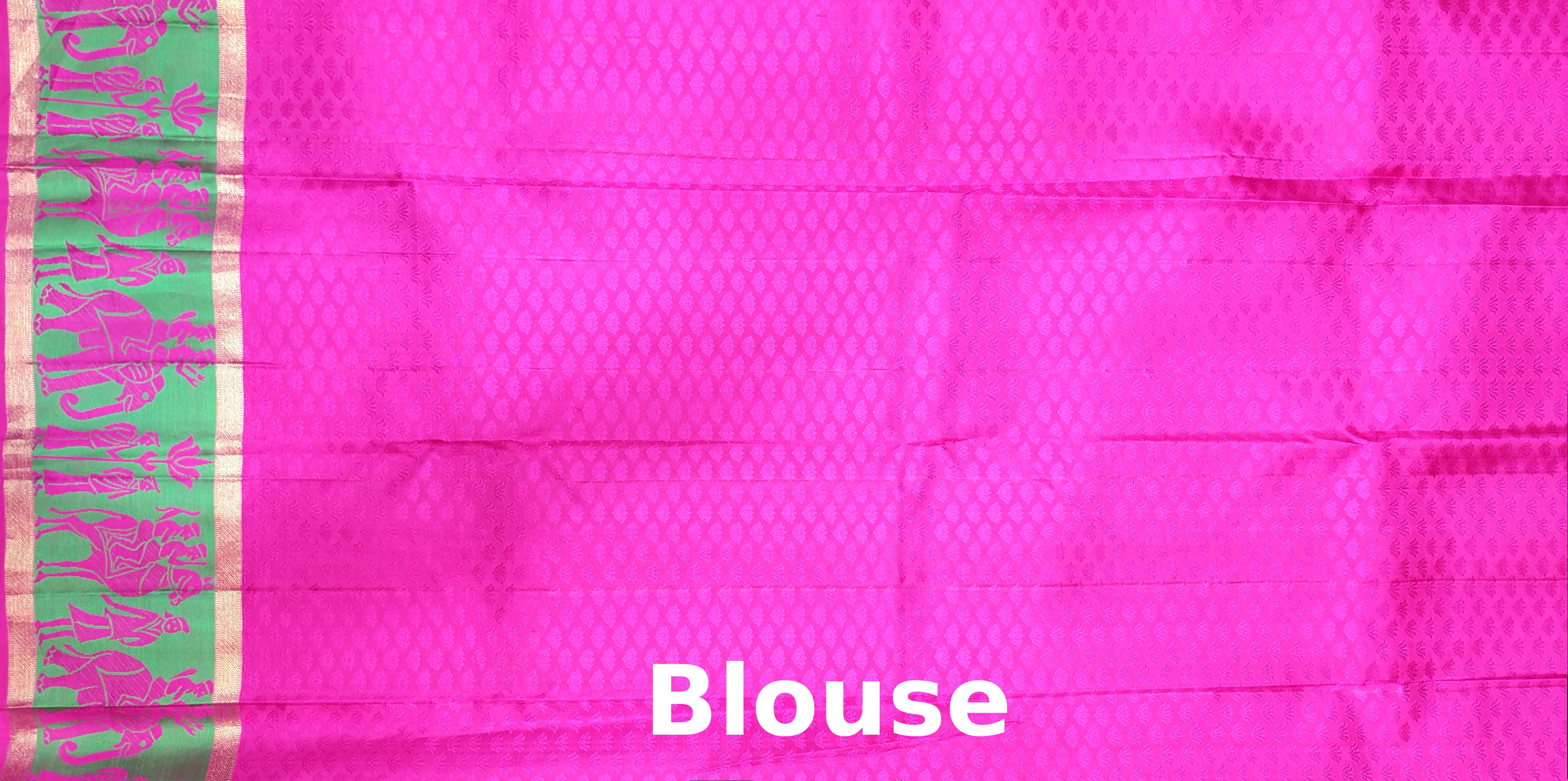 This soft pink Kanchipuram silk saree is a vision of quiet grandeur, brought to life by a jacquard weave that glimmers with every step. The highlight lies in its intricately woven elephant border in rich green threadwork, a symbol of strength, wisdom, and royal charm. The self-colored pallu and blouse allow the body’s design and craftsmanship to take the spotlight, making this a timeless pick for women who appreciate detail in every thread.