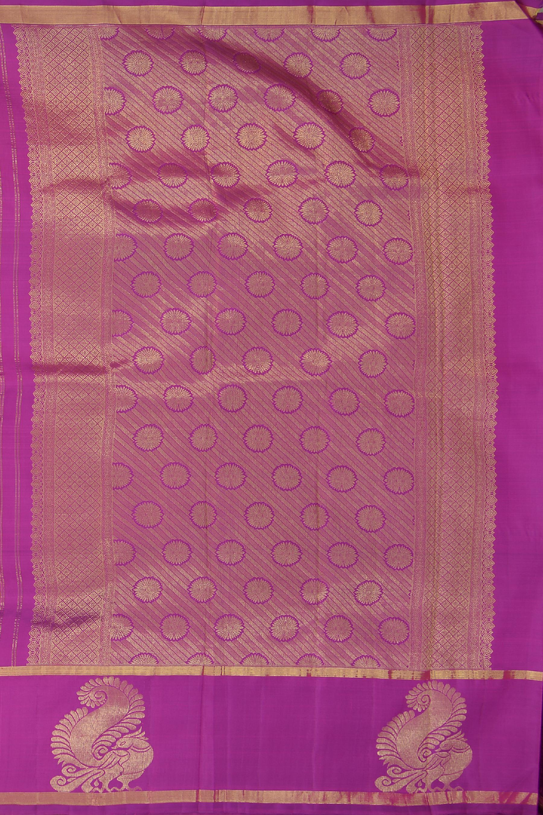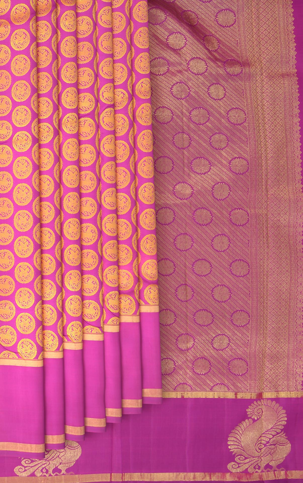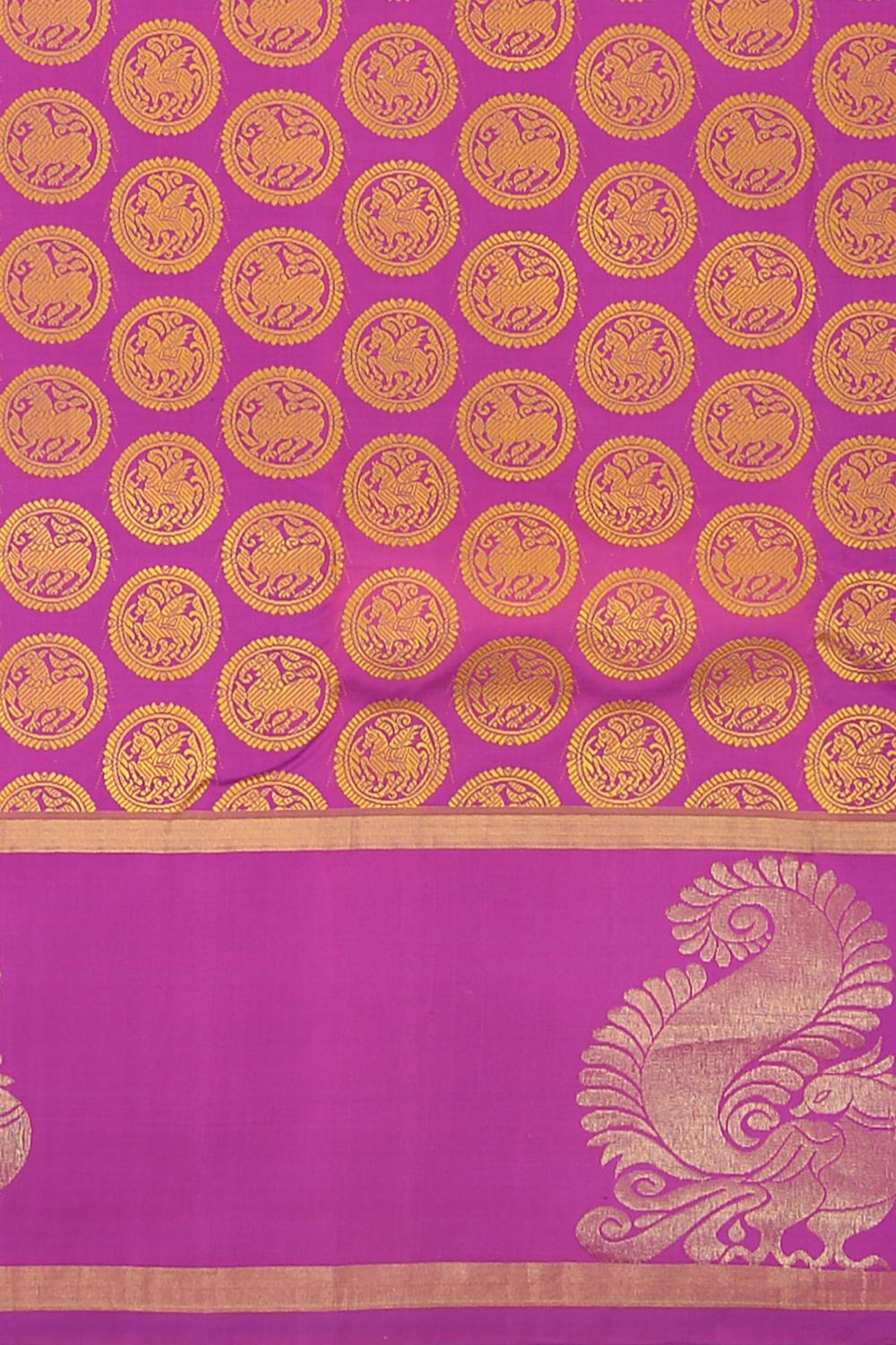 Celebrate the bloom of elegance with our Pink Kancheevaram silk saree. Threadwork jacquard with round buttas and adorned with Yaali and flying horse motifs, this saree is a testament to the intricate artistry of Kancheevaram weavers. The self-color border and pallu, featuring large Peacock motifs and grand Kamalam buttas with cross zari lines, add a majestic touch to the saree.