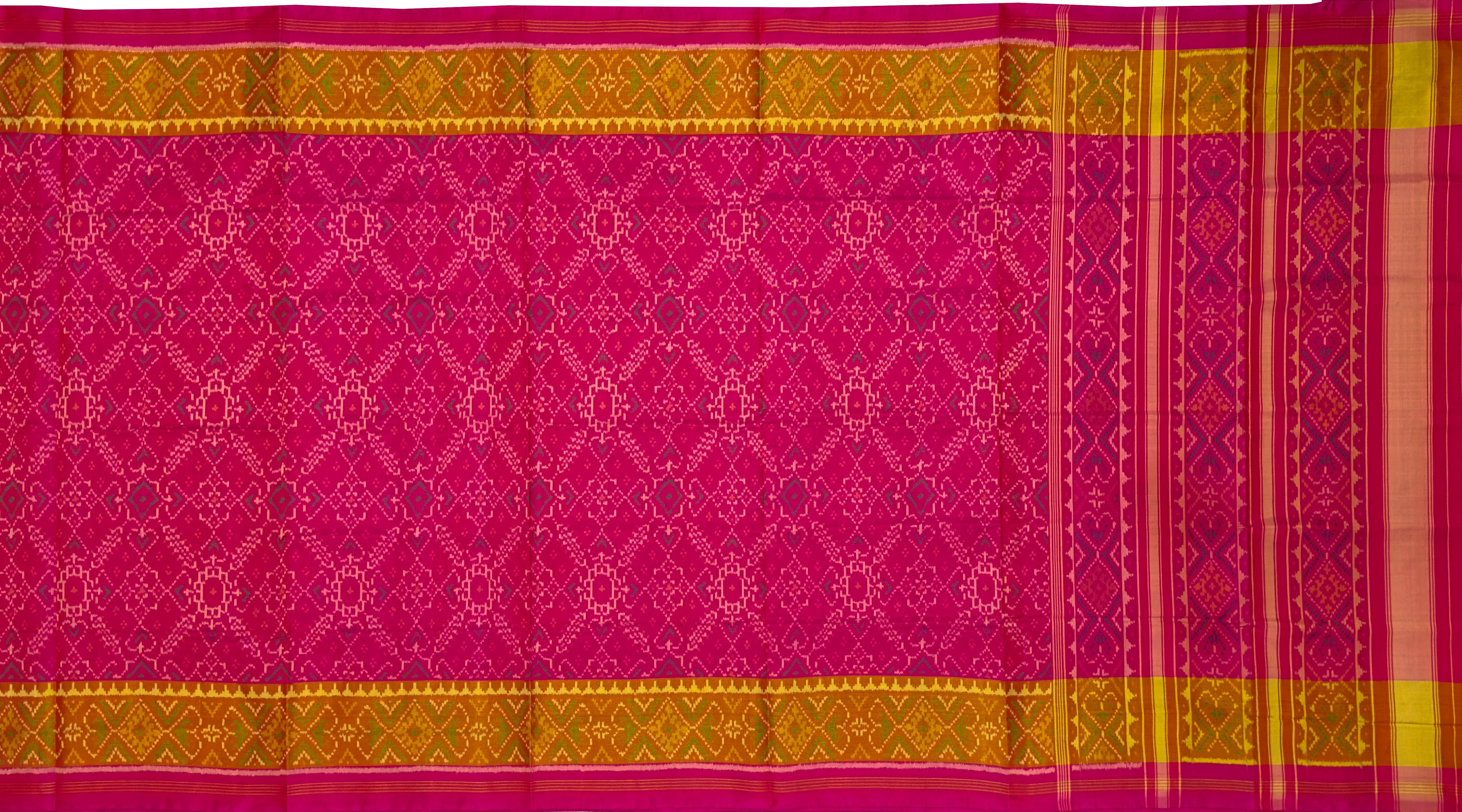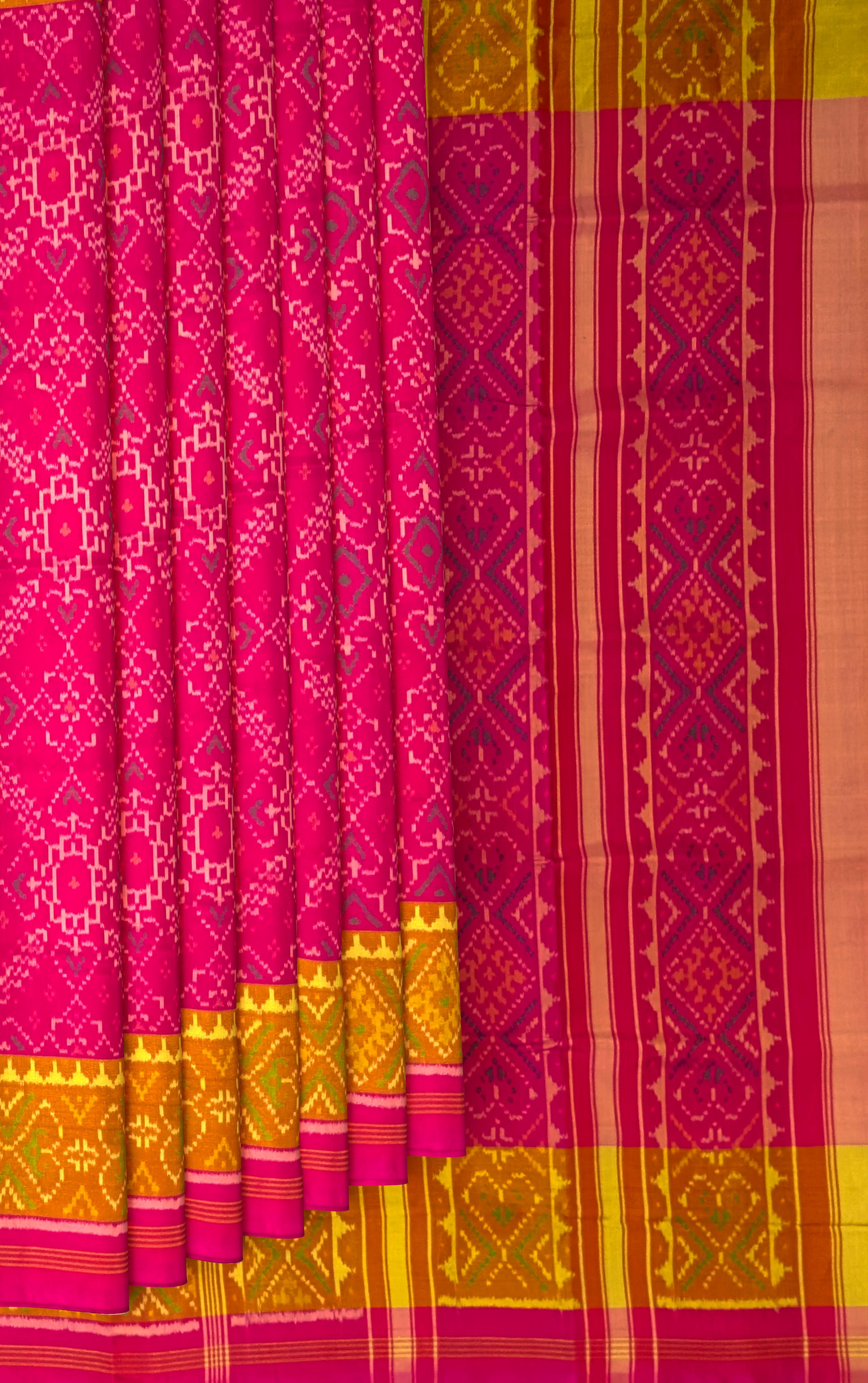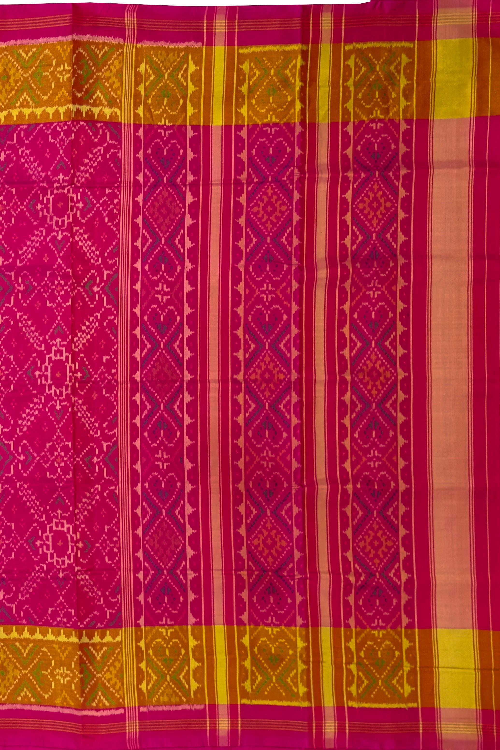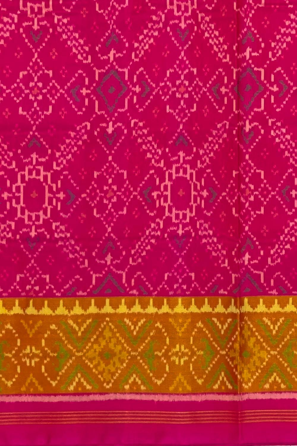 The Pink Manekchowk Border Pallu Chelari Single Ikat Rajkot Patola Saree is a celebration of vibrant color and intricate design. The vibrant pink base, adorned with the traditional Manekchowk motifs, exudes femininity and grace. The detailed work on the border and pallu showcases the artistry that goes into creating each Rajkot Patola saree, making it a timeless piece of wearable art.
