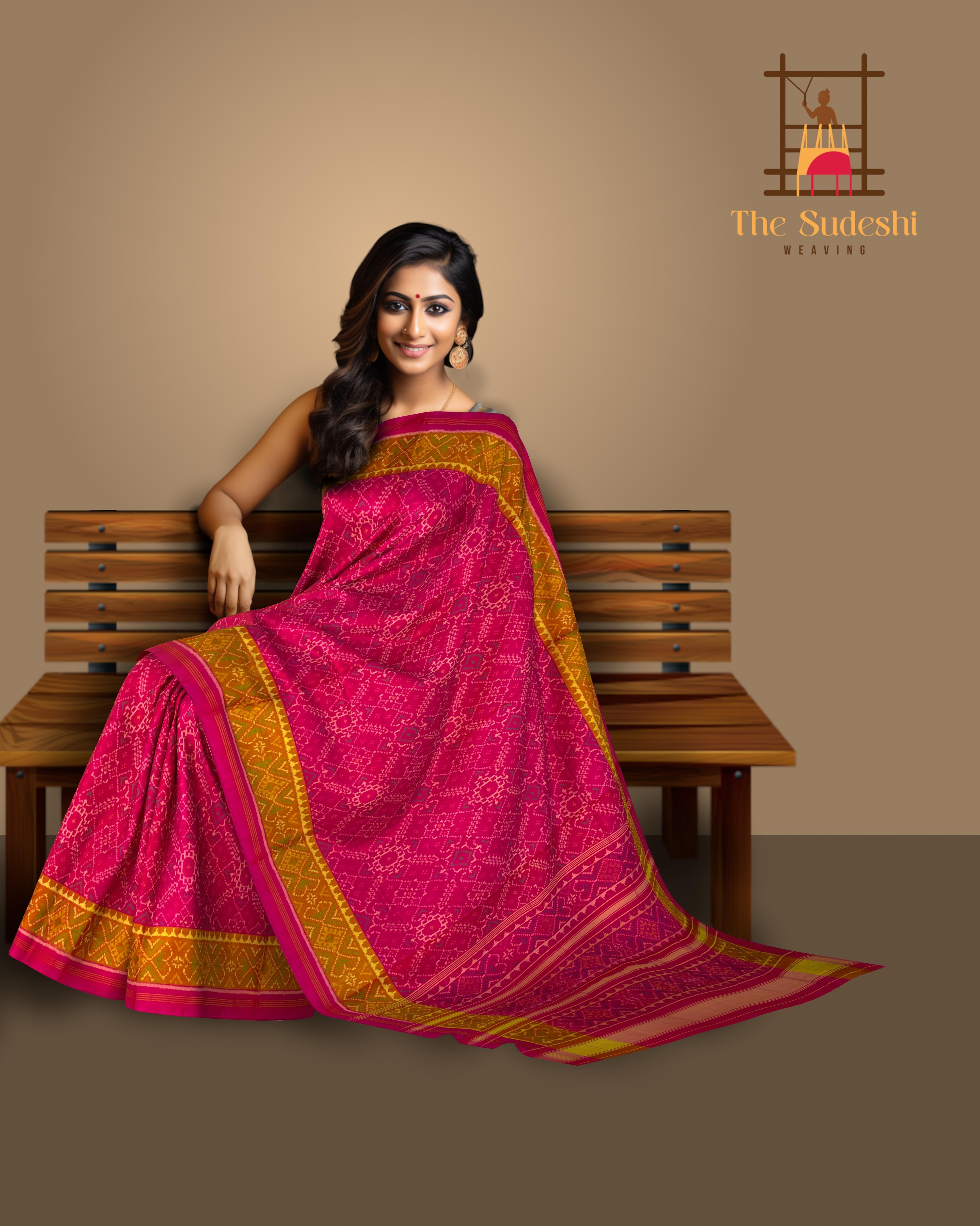 Rajkot Patola sarees are known for their distinctive patterns and vibrant colors, all achieved through the Single Ikat technique. This method involves dyeing the yarn before it is woven, ensuring that each design is perfectly aligned on the fabric. The result is a saree that is both striking in appearance and rich in cultural significance.