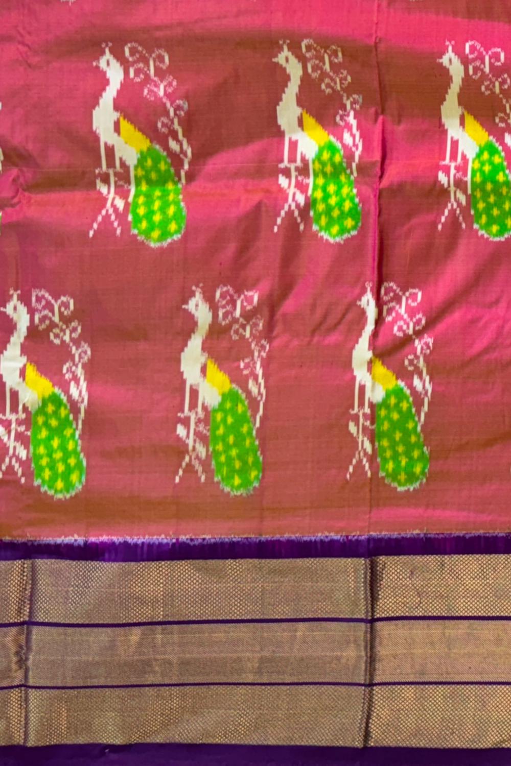 Radiant and refreshing, the Pink Pochampally Ikat Saree is beautifully contrasted with a deep purple border and pallu. The bright pink body symbolizes youth and joy, while the purple accents add a sense of depth and richness. The saree’s striking color combination is perfect for those who love vibrant and lively attire. Crafted in Pochampally, Telangana, these ikat sarees showcase the meticulous double ikat weaving technique. The motifs, inspired by nature and cultural symbols, convey themes of prosperity, harmony, and creativity. The blend of pink and purple reflects playfulness balanced with sophistication. This saree is ideal for festive functions, cultural programs, and celebratory occasions. Pair it with a purple blouse for continuity or a gold blouse for contrast. Accessorize with gold jewelry, jhumkas, and a vibrant clutch to complete the festive look. Note: The appearance of the product’s colors may vary due to lighting conditions or your device’s screen calibration. For further assistance or additional images/videos, feel free to contact us at +91 97897 60367 / +1 (945) 308-5962 or email at wecare@thesudeshiweaving.com.