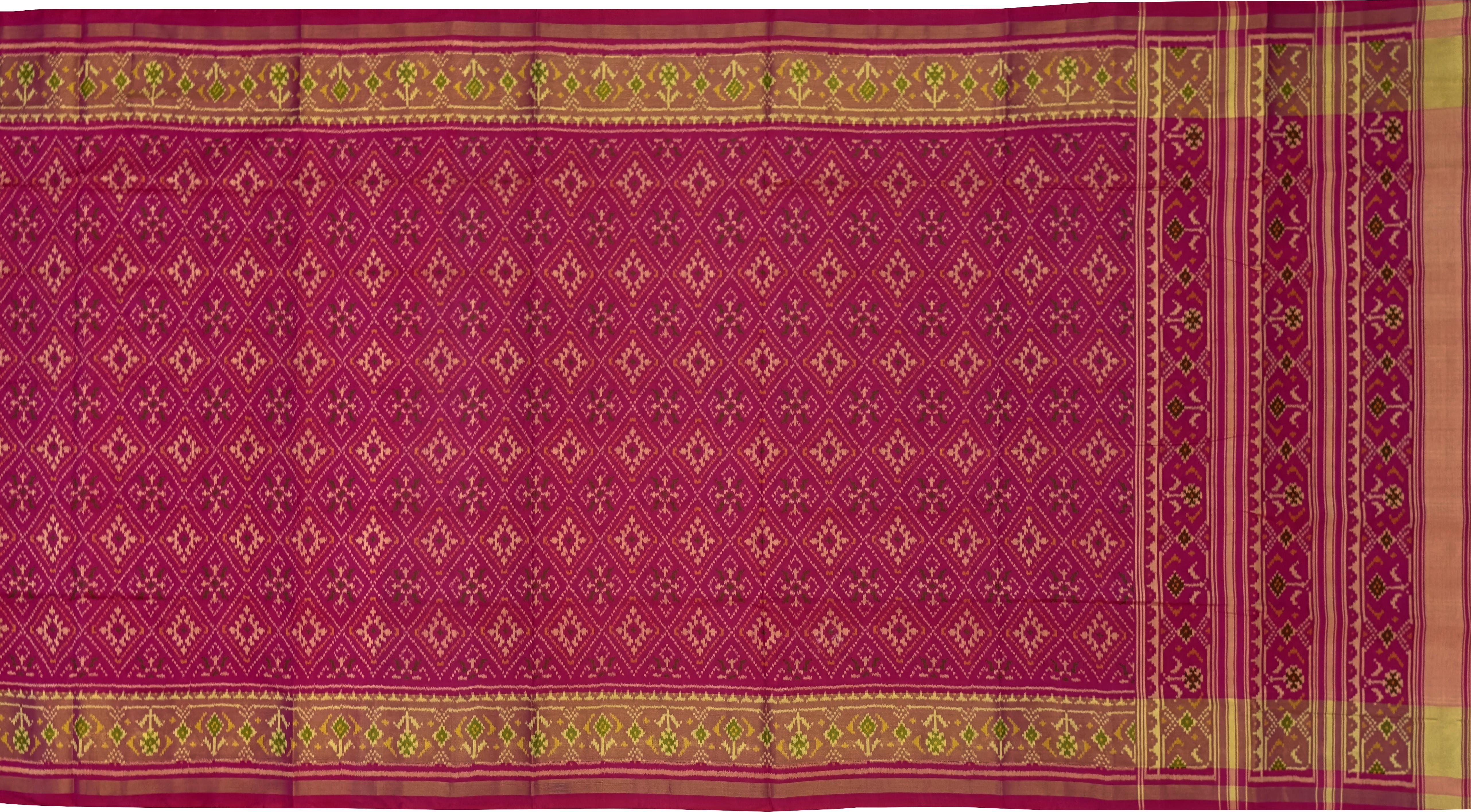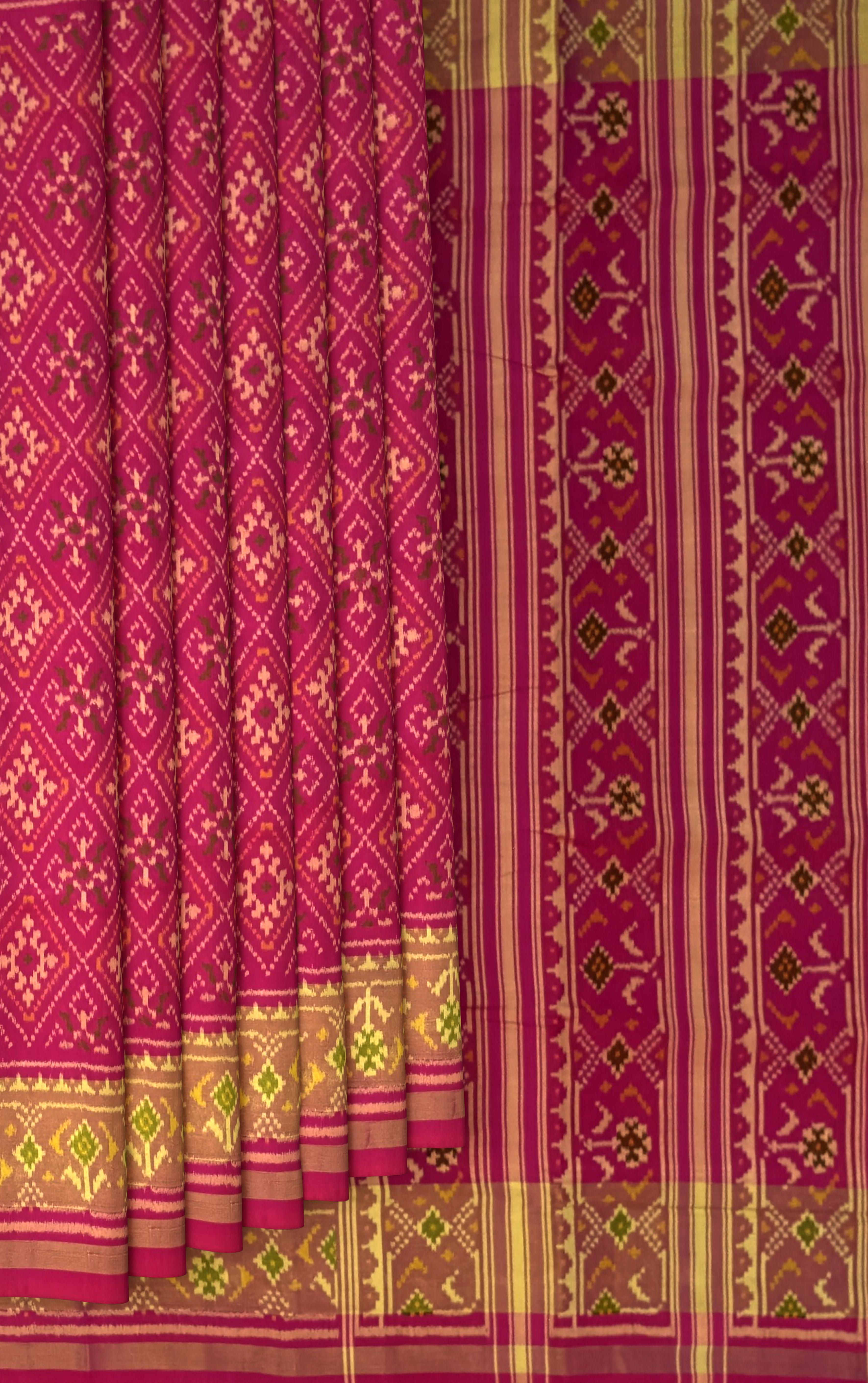 The Patola technique used in this saree is a traditional method of weaving, originating from the state of Gujarat. The technique involves weaving silk threads to create intricate designs and patterns.
