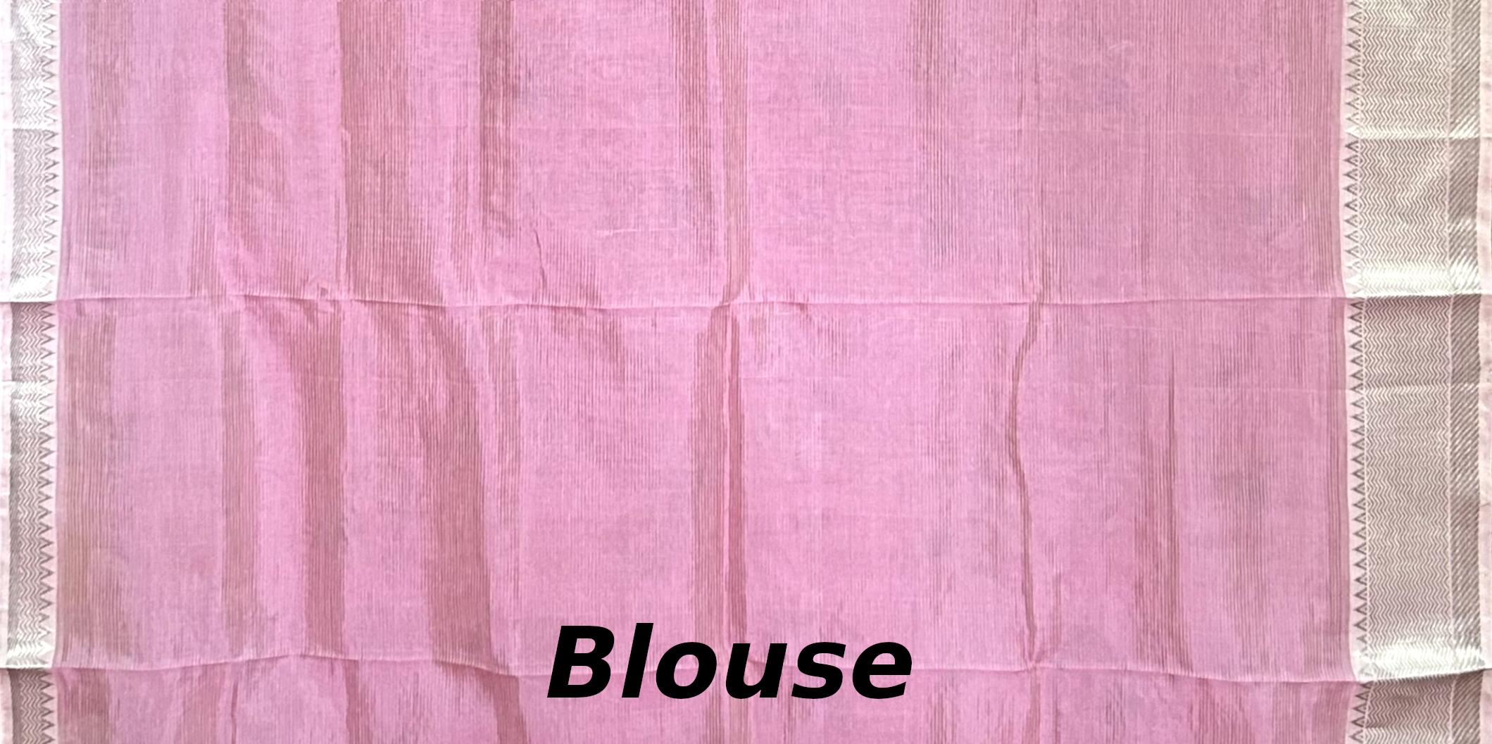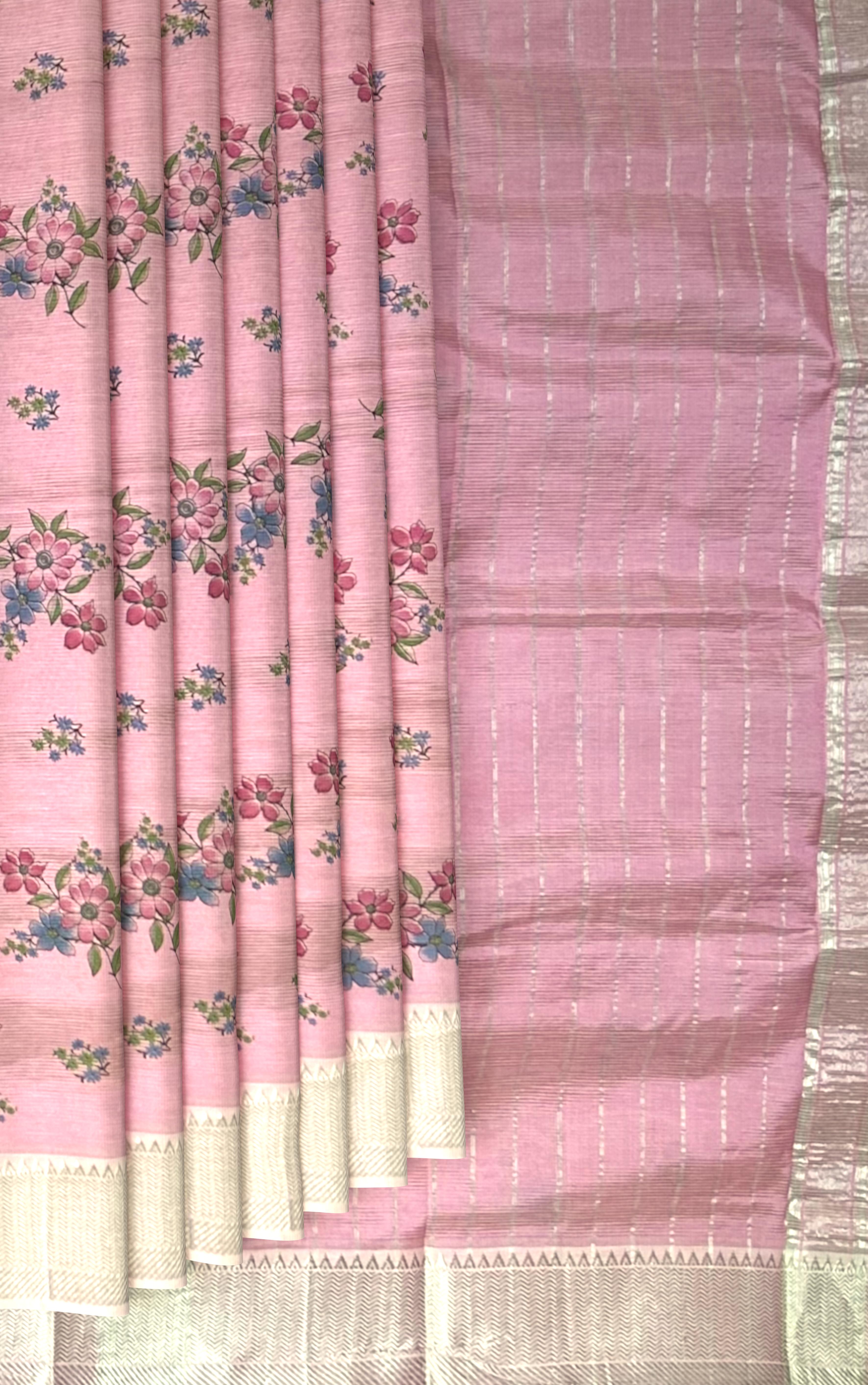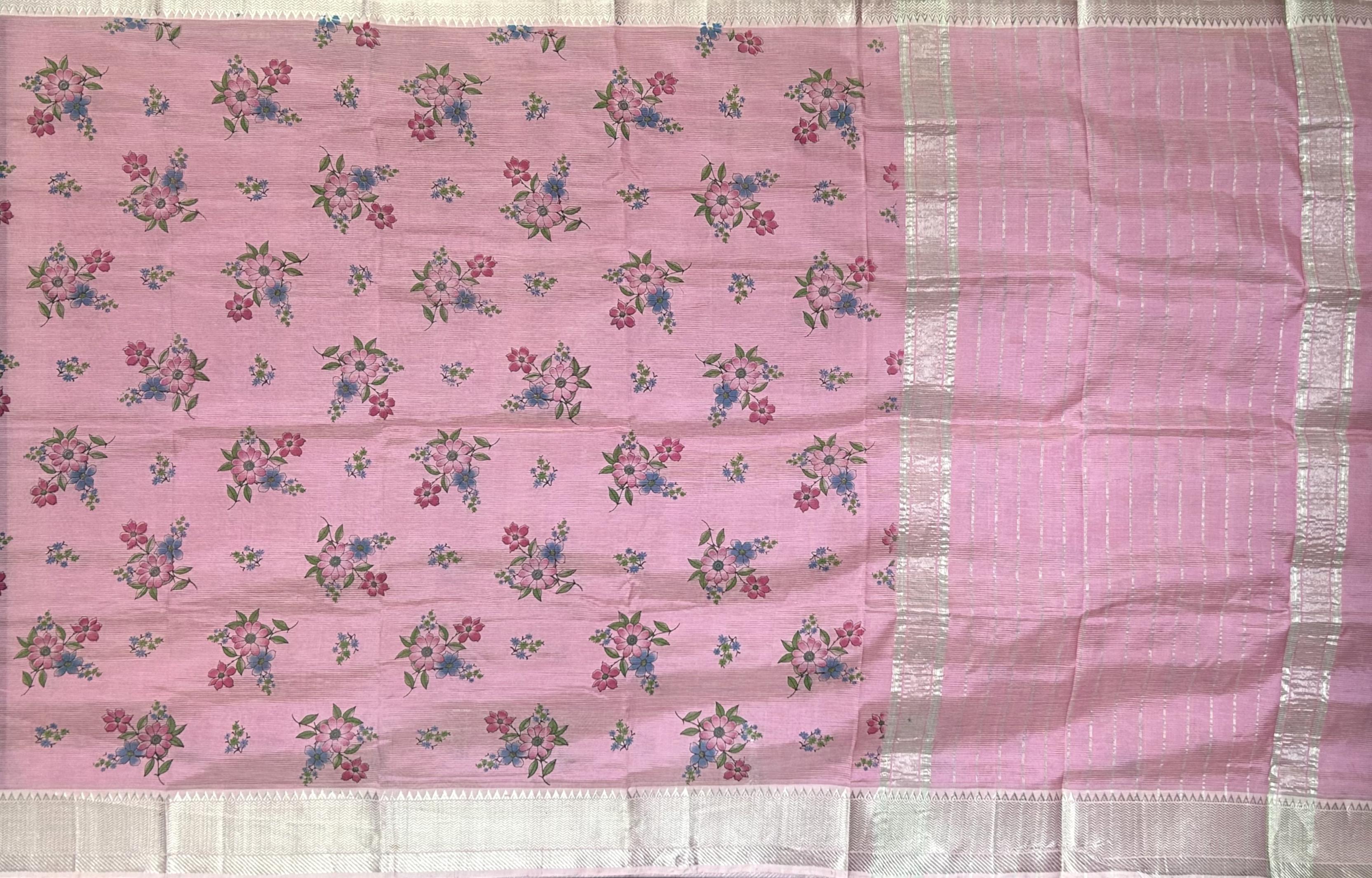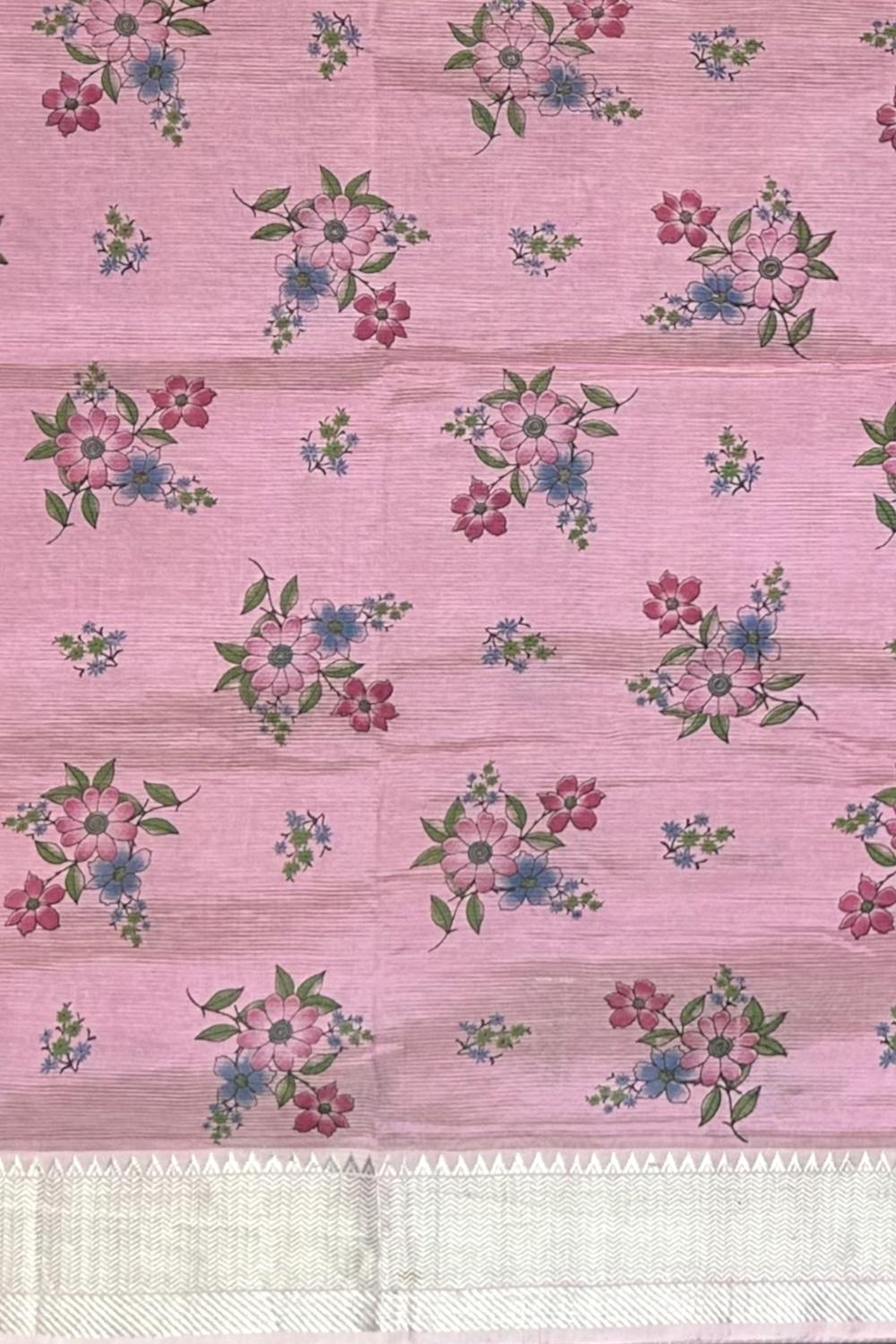 Experience the beauty of floral patterns on this stunning Pink Silver Mangalagiri saree, featuring a flower motif. The single-side design adds a touch of playfulness, while the silver accents create a luxurious ambiance.