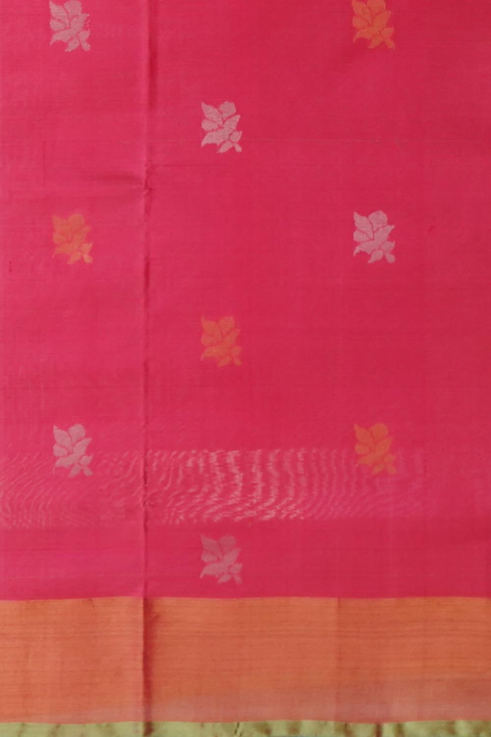This Pink Uppada Saree is a harmonious blend of soft pink with a contrasting green border, creating a captivating visual appeal. The saree features exquisite gold jari buttas, adding a refined shimmer that enhances its traditional charm. The combination of pink and green signifies joy and prosperity, making this saree a symbol of celebration.