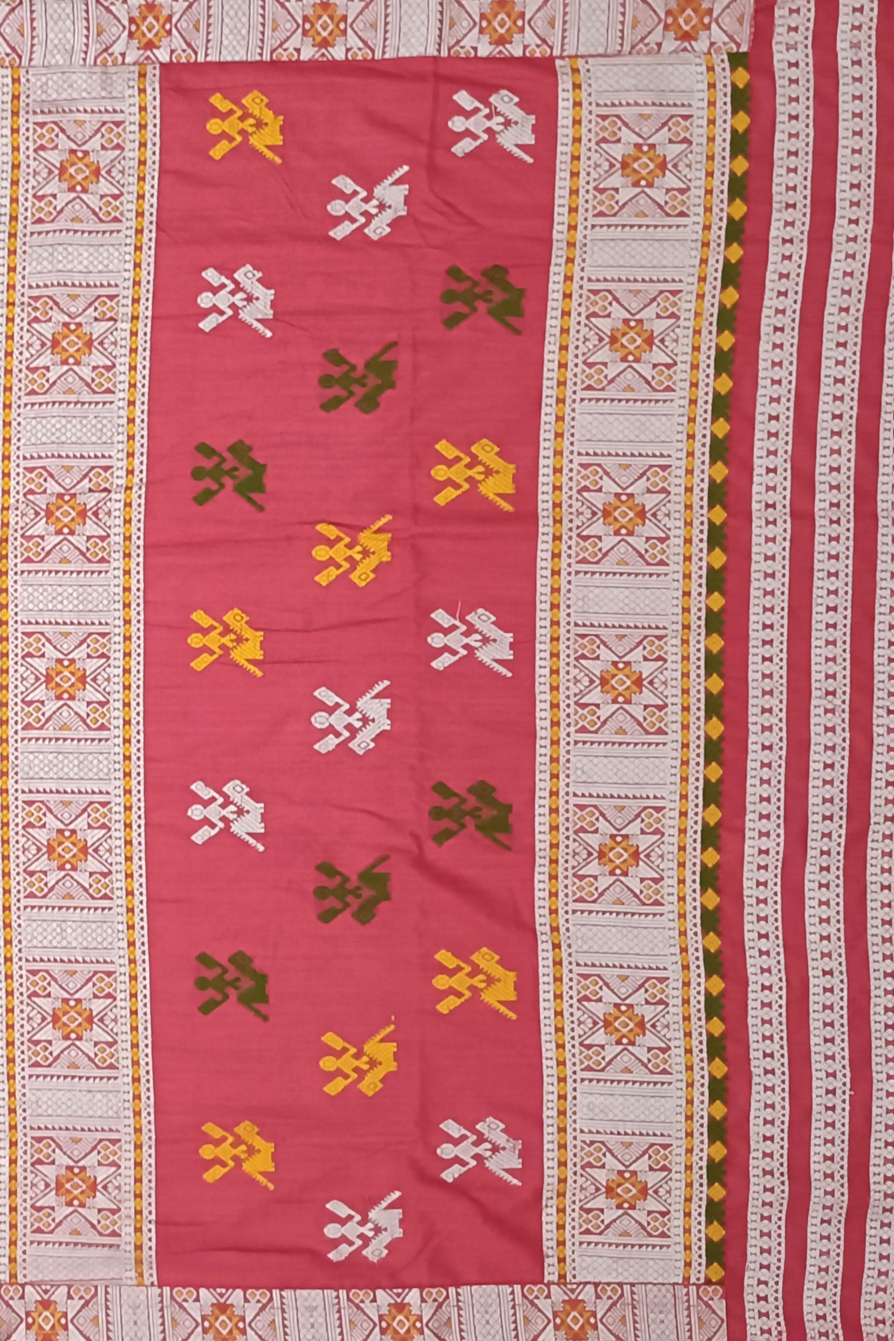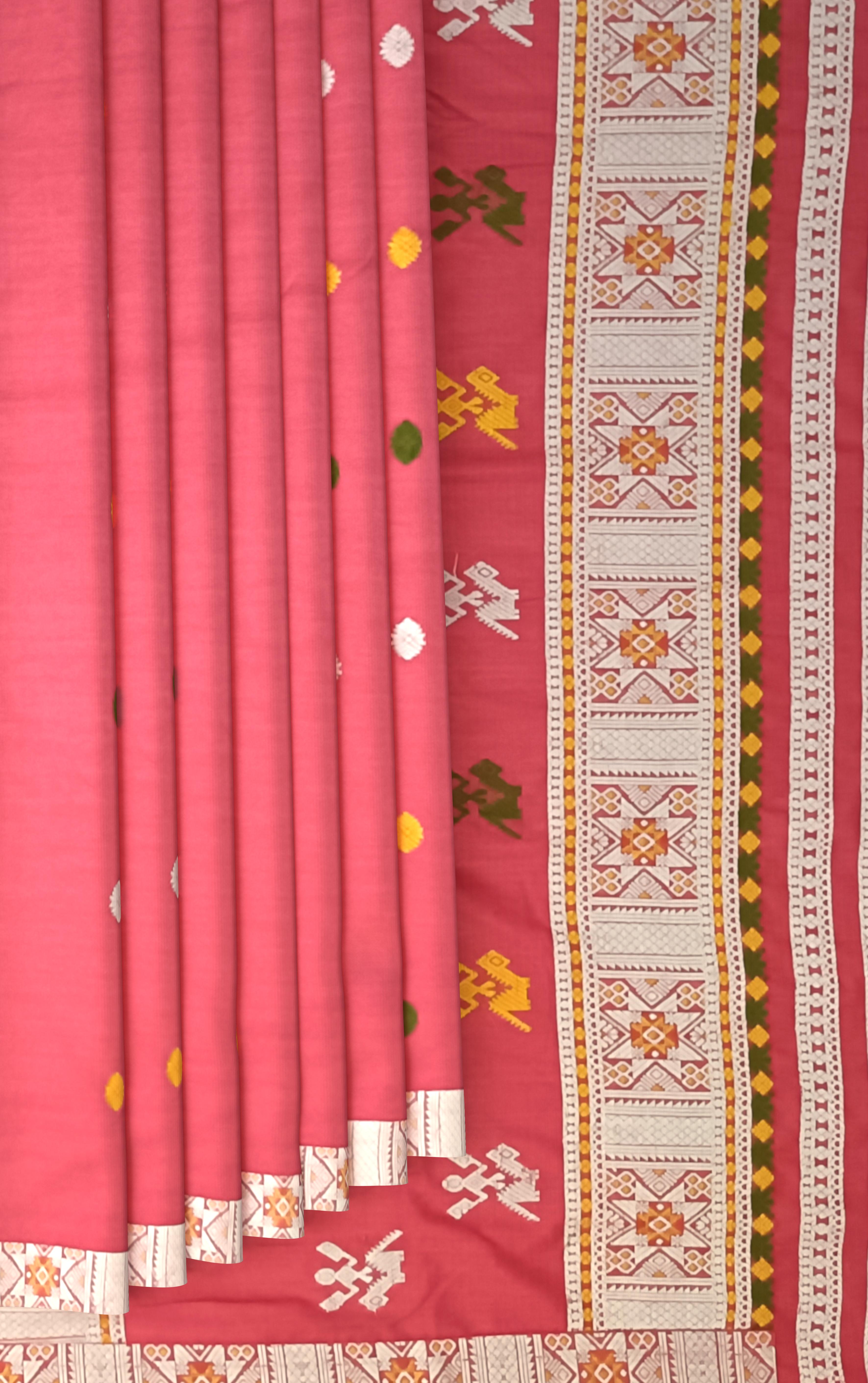 Perfect for weddings, festive celebrations, or family gatherings, this saree can be styled with a matching pinkish red or light pink blouse. Accessorize with pearl or diamond jewelry to elevate its sophistication. Its vibrant charm also makes it an ideal gift for someone who loves traditional handloom sarees.