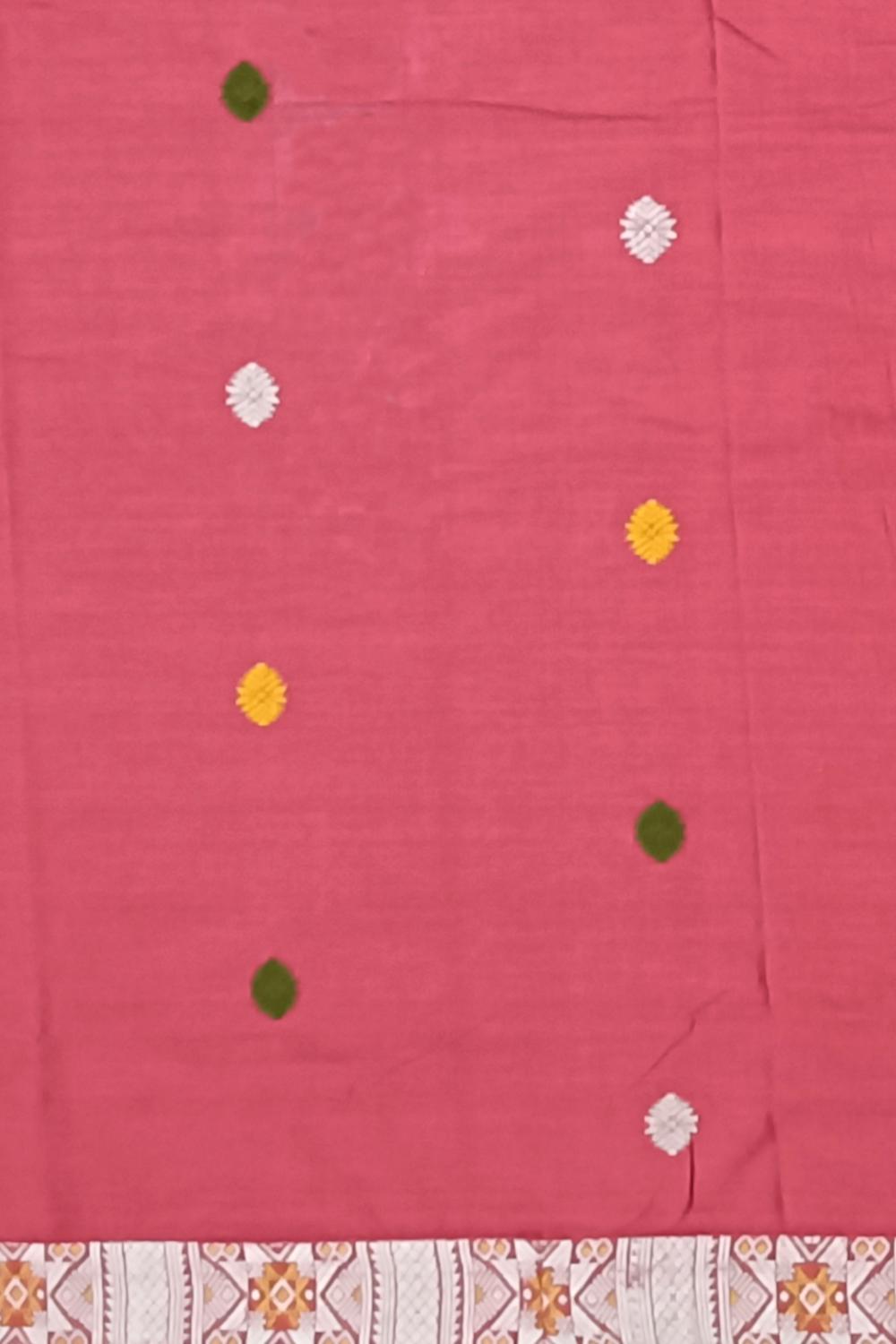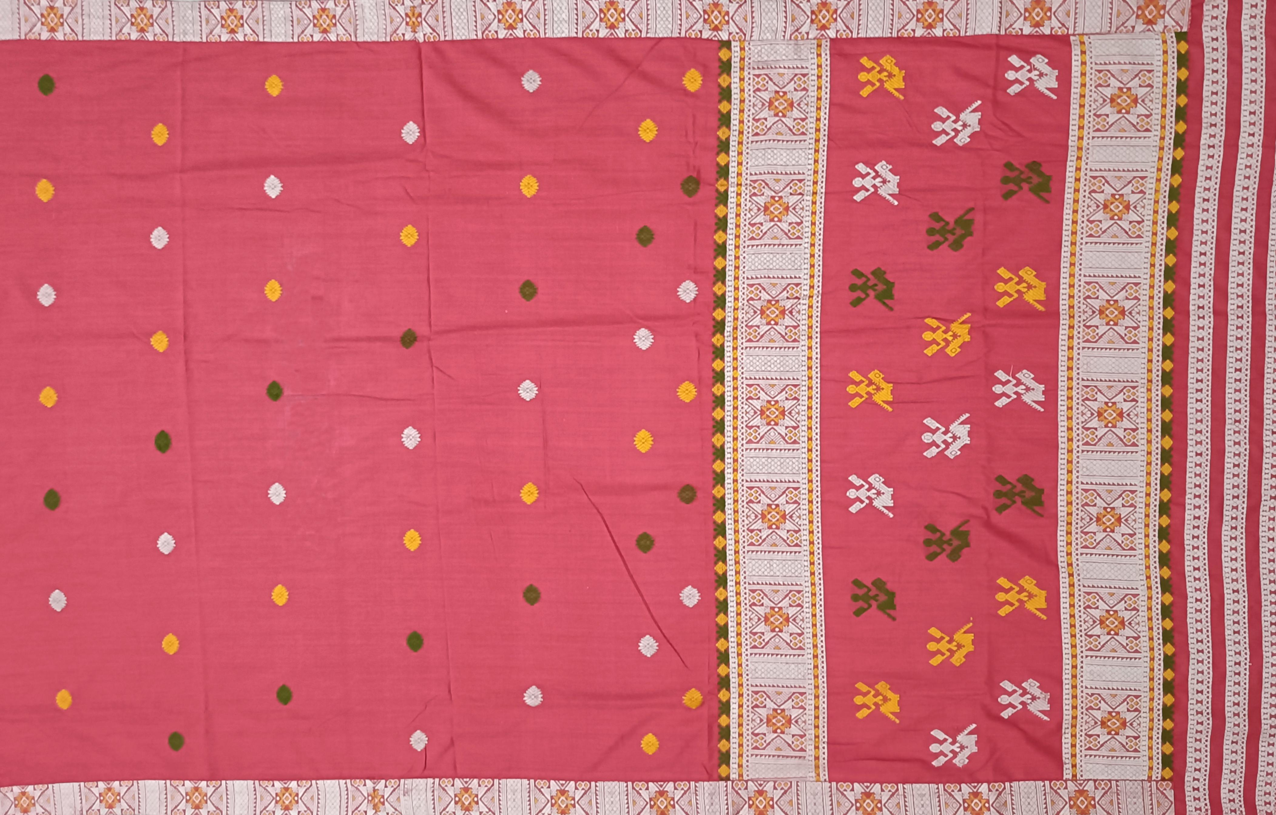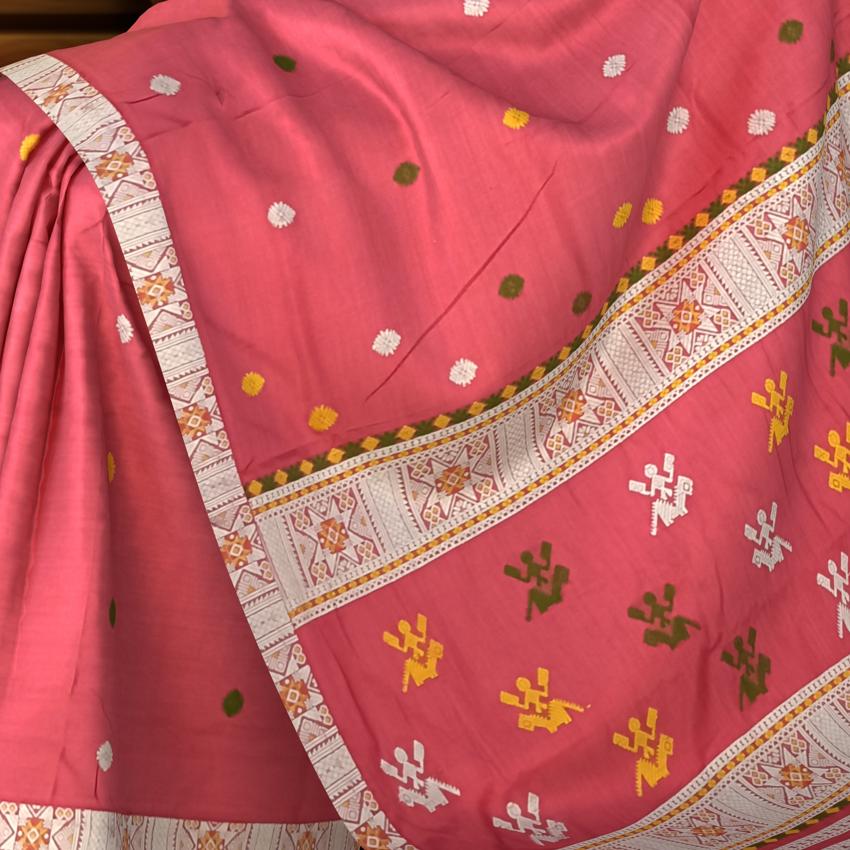 Celebrate the vibrancy of tradition with this pinkish red Eri saree from Assam. The saree’s body, beautifully embellished with buttis and motifs, is perfectly complemented by a soft light pink border and pallu. The lively yet elegant color palette makes this saree an exquisite choice for festive occasions.