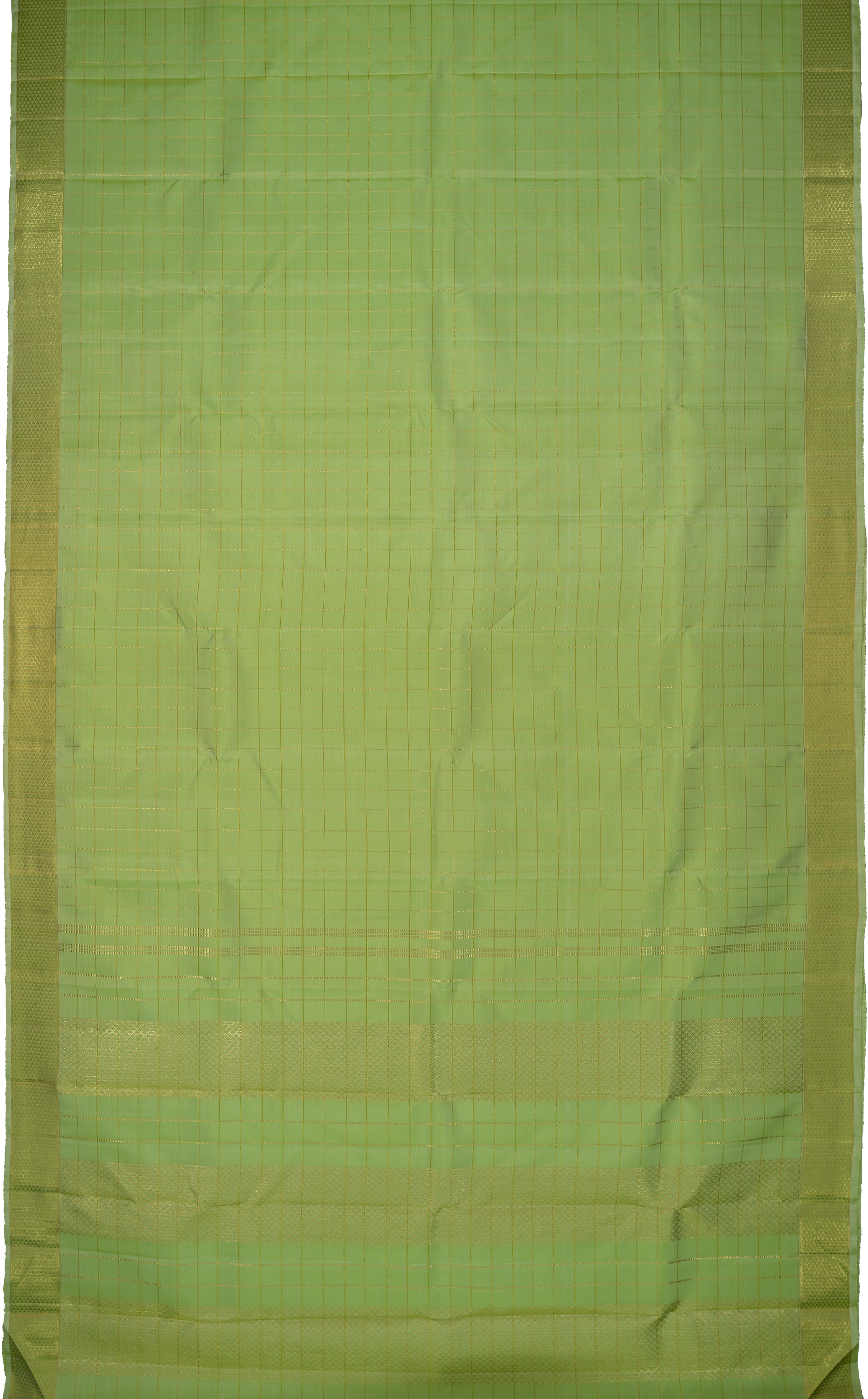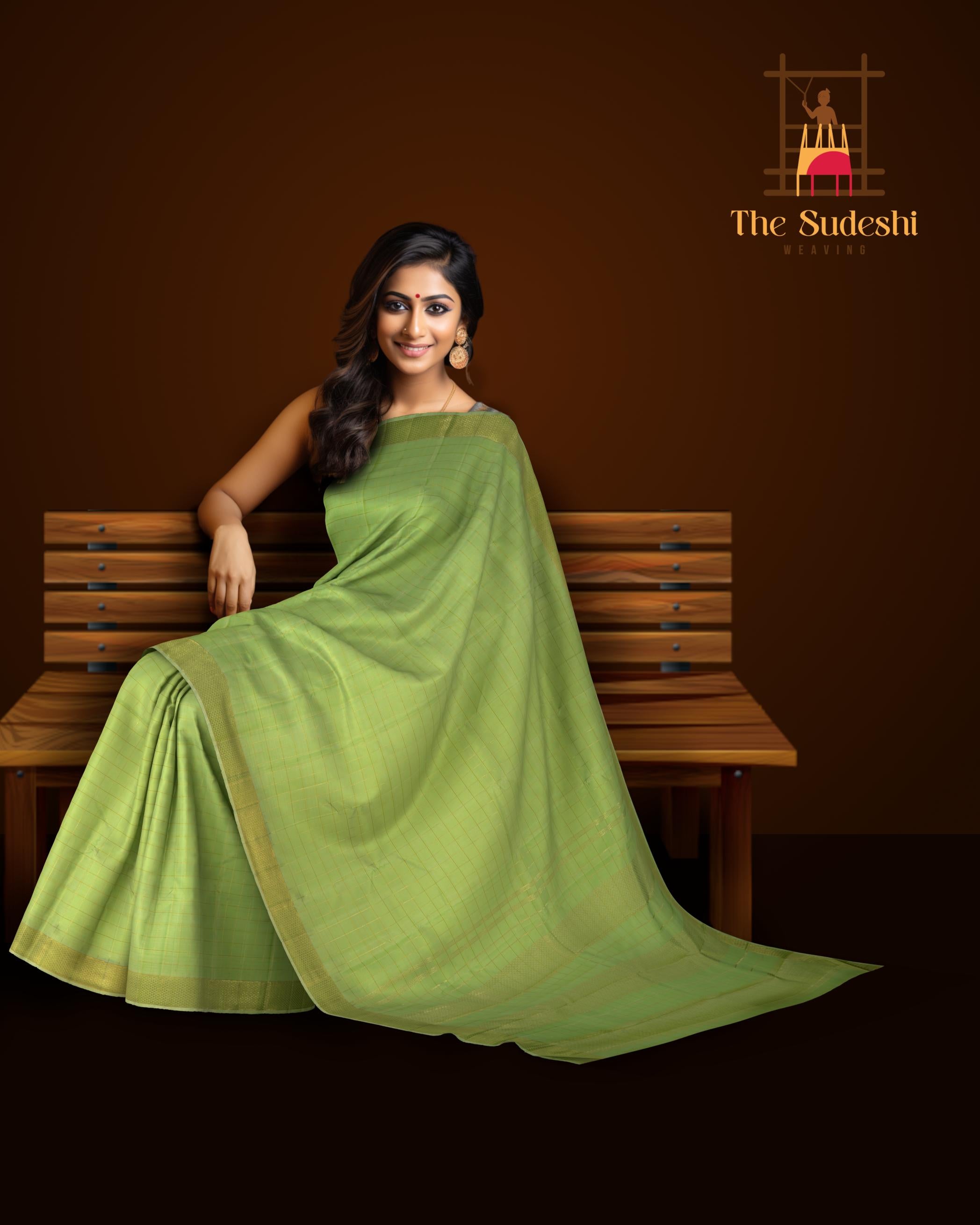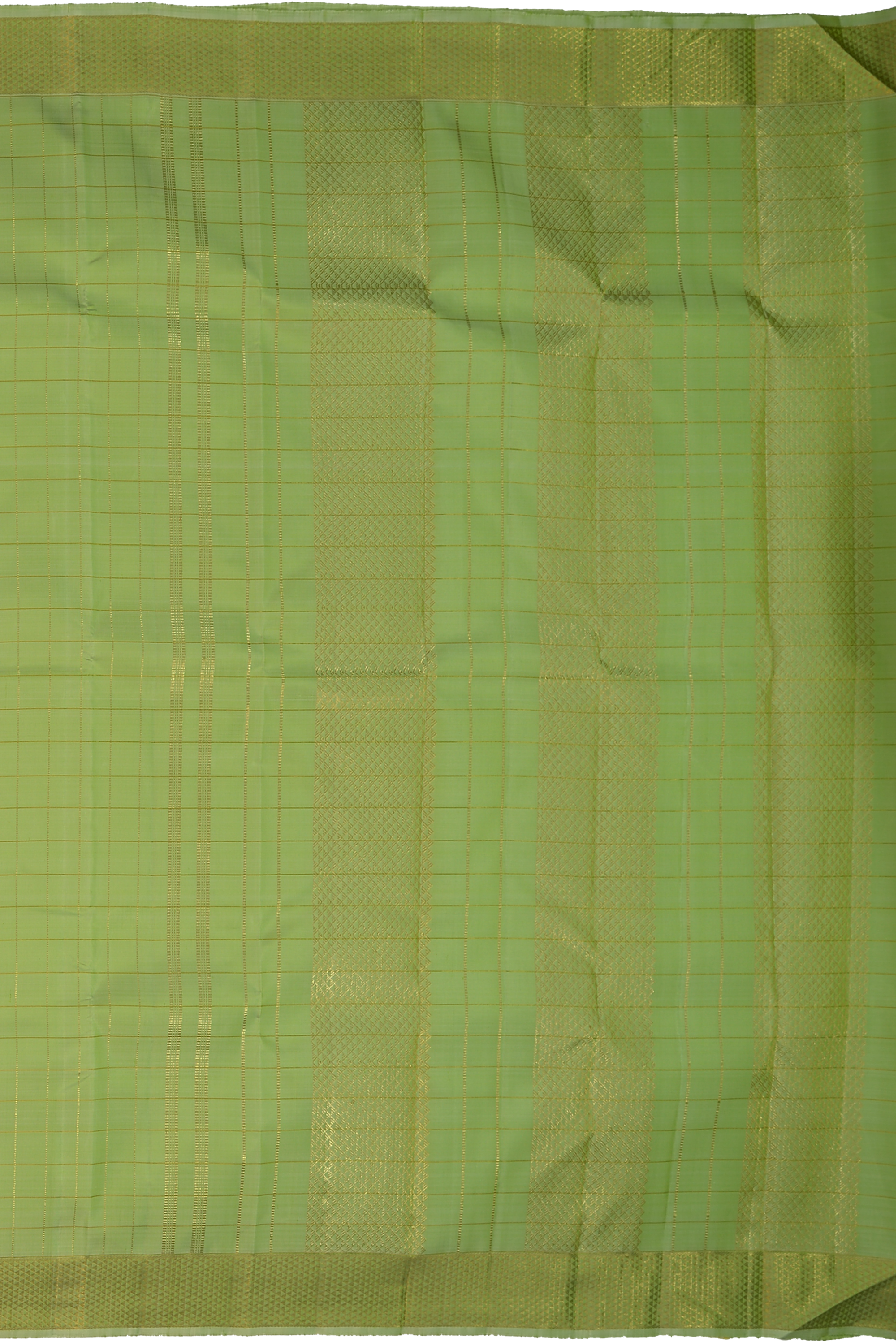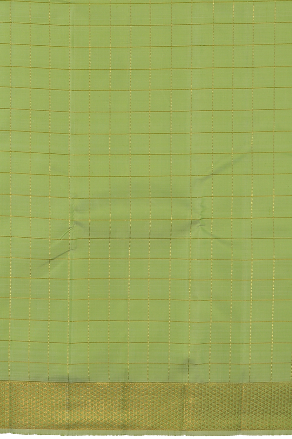 The self-border continues the narrative, bringing to the forefront the majestic Mayil Kann design, an ode to beauty and grace. The pallu, also in pista green, echoes the Seer Mundhi pattern, uniting the saree in its theme and purpose.