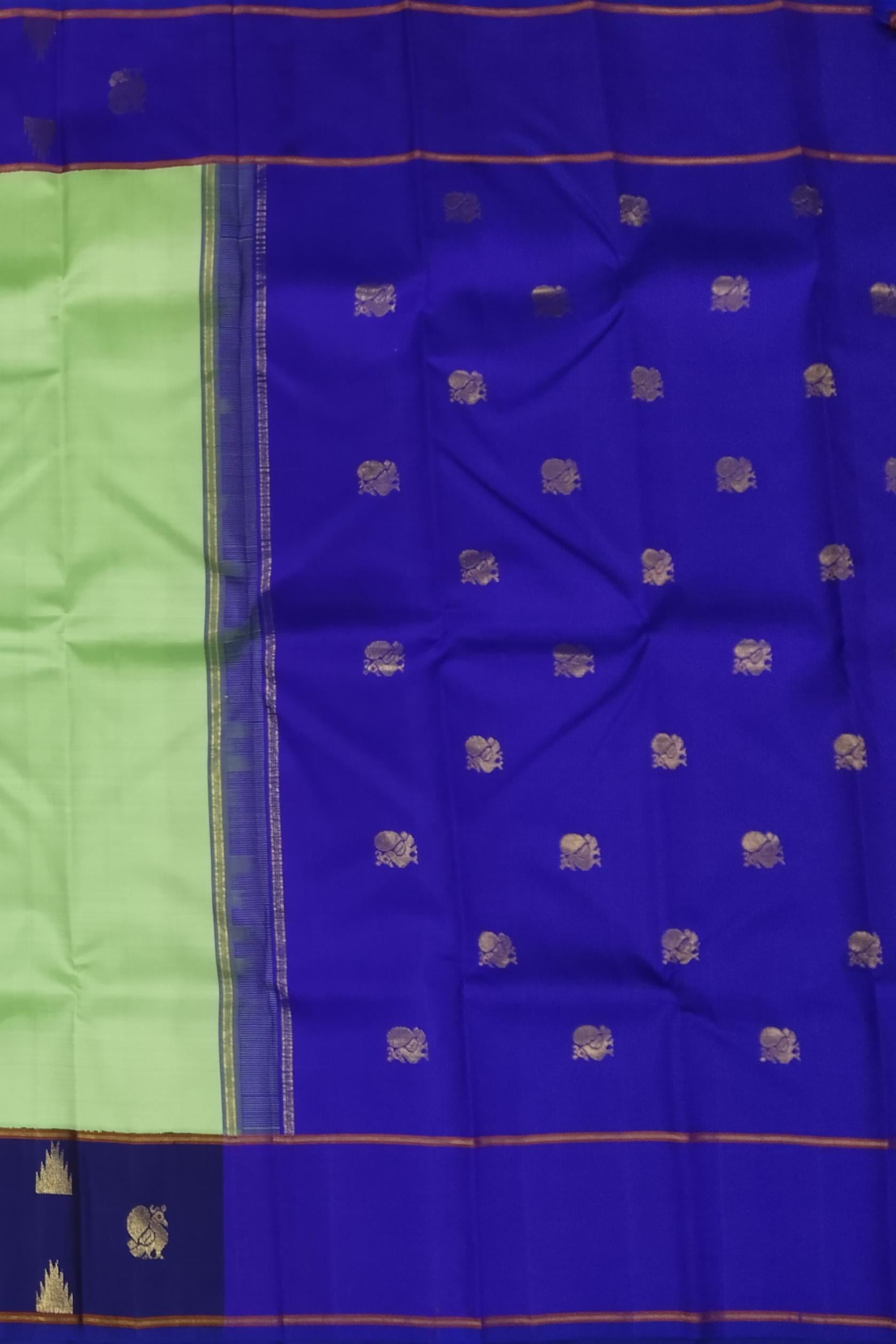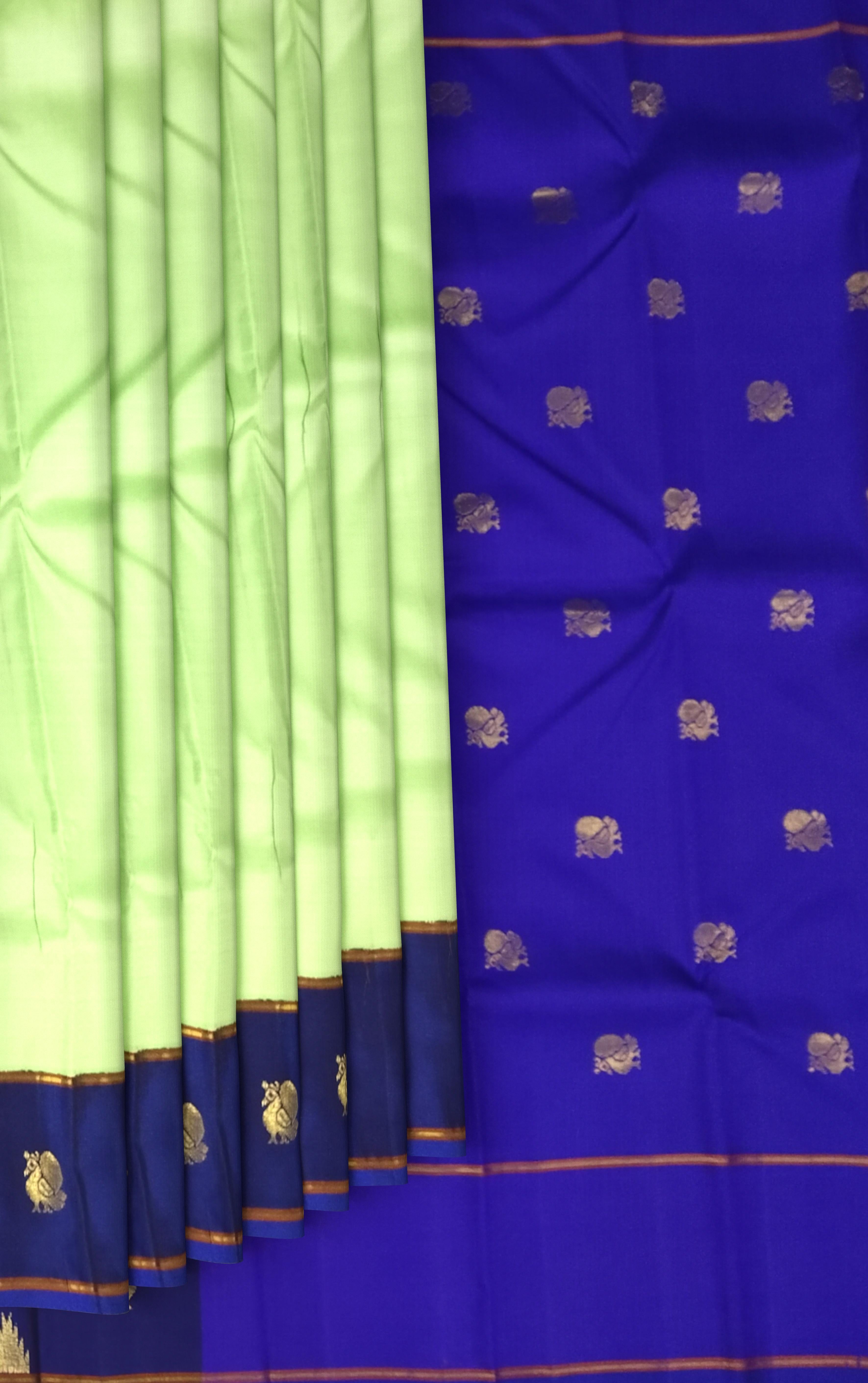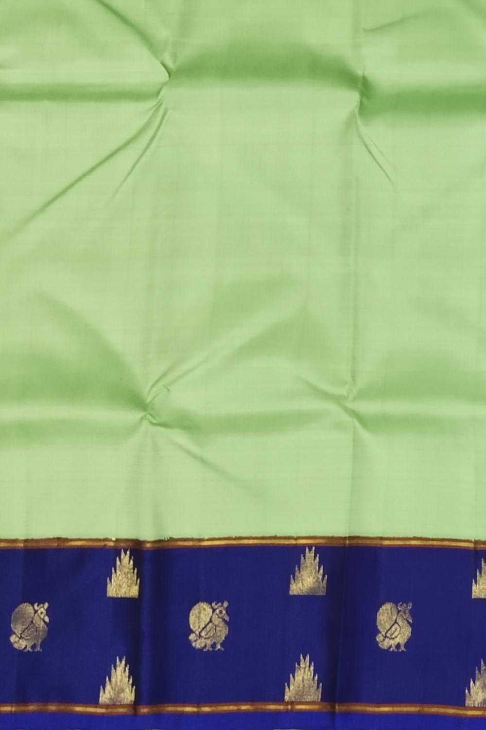 Refreshing and graceful, this Pista Green Kanchipuram Silk Saree with a Royal Blue border and pallu is the perfect embodiment of subtle sophistication. The plain silk body allows the luxurious sheen and fine weave to stand out, while the contrast of royal blue adds a regal touch that enhances its modern appeal. Woven in the sacred looms of Kanchipuram, these Pure Silk Sarees are cherished for their durability and rich texture. Every weave tells a story of devotion, inspired by temple art and the grandeur of South Indian heritage. The purity of silk and precision in zari weaving make each saree a treasured piece for generations. This elegant drape is ideal for formal occasions, cultural events, or festive gatherings. Pair it with a royal blue blouse, statement earrings, and a delicate gold waistbelt to create an effortlessly elegant look. Note: The appearance of the product’s colors may vary due to lighting conditions or your device’s screen calibration. For further assistance or additional images/videos, feel free to contact us at +91 97897 60367 or email at wecare@thesudeshiweaving.com.