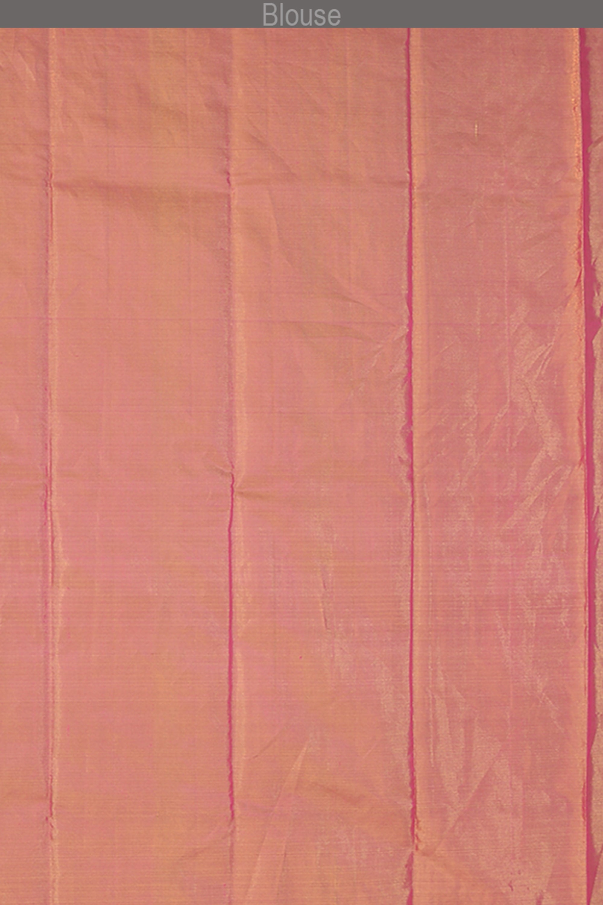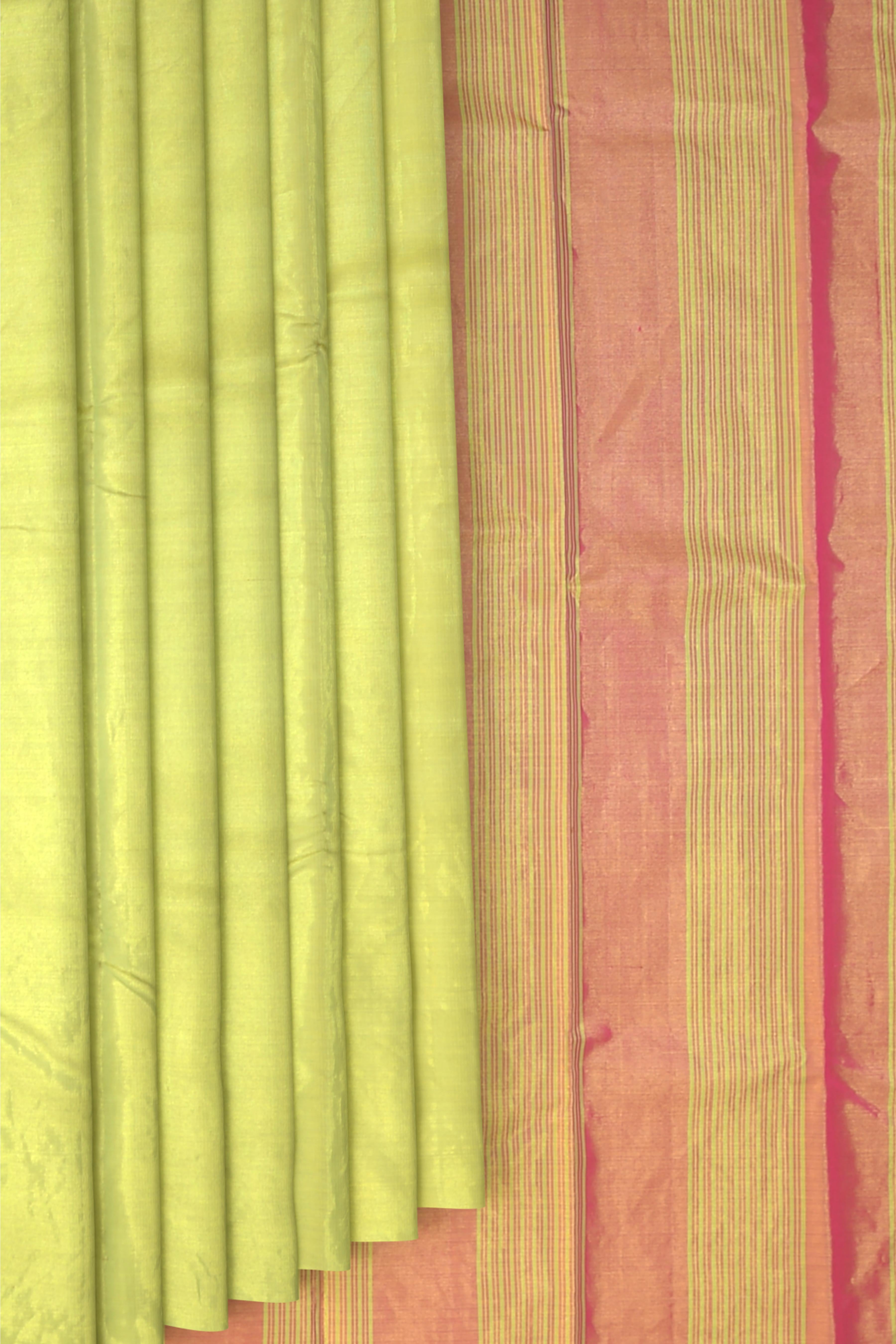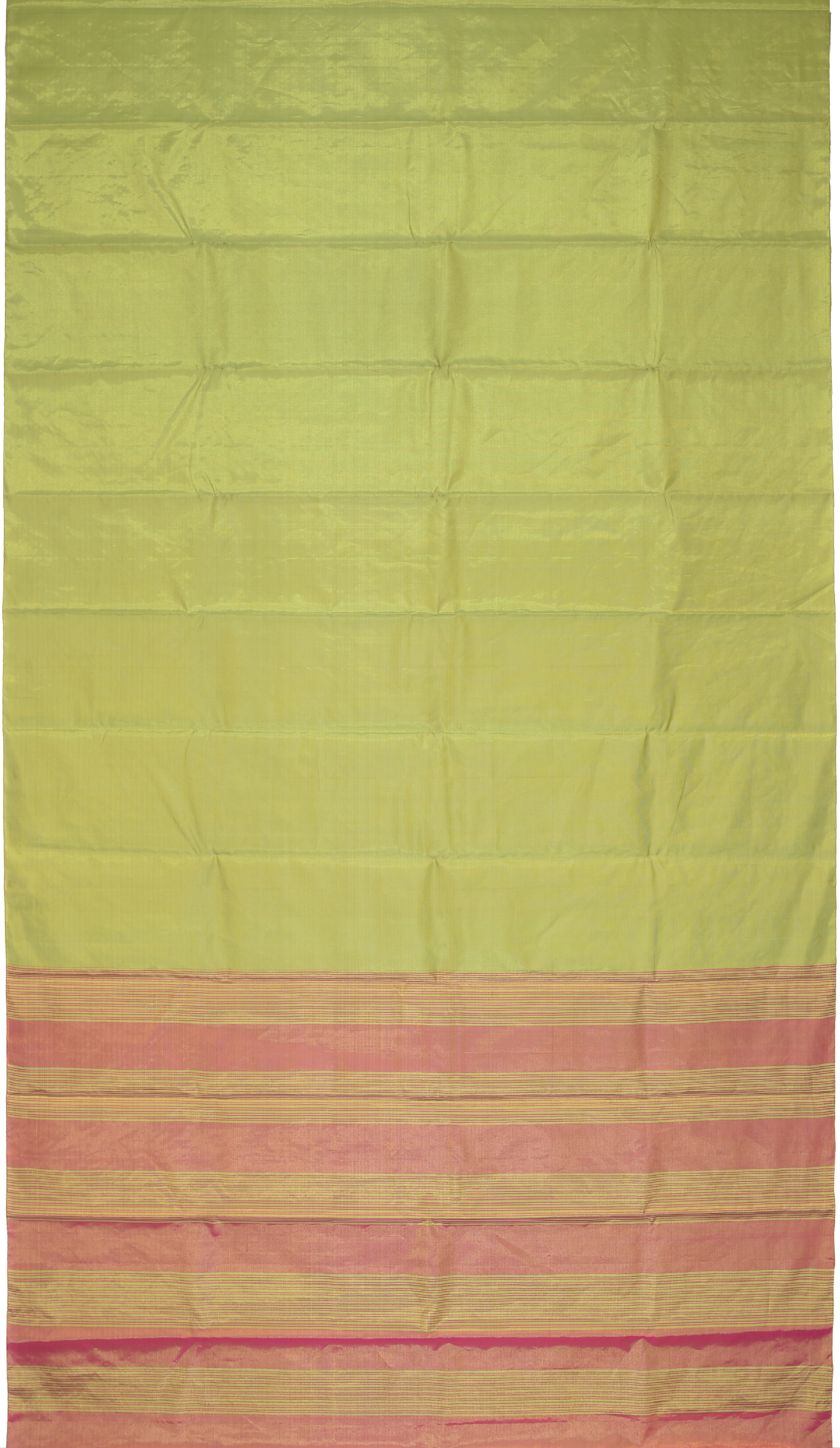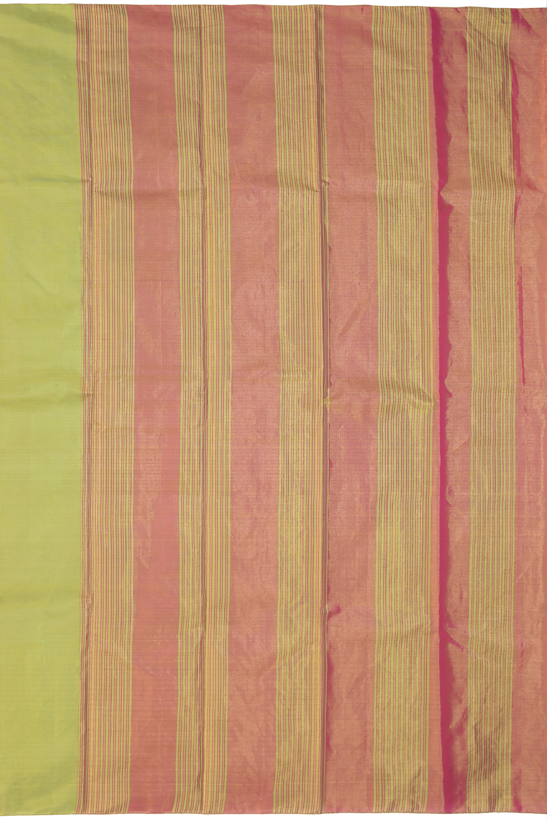Discover the beauty in simplicity with this plain tissue Kanchipuram silk saree. The serene green hue, devoid of any zari, speaks of grace and poise. The saree, though simple, captures the heart with its sheen and delicate feel.