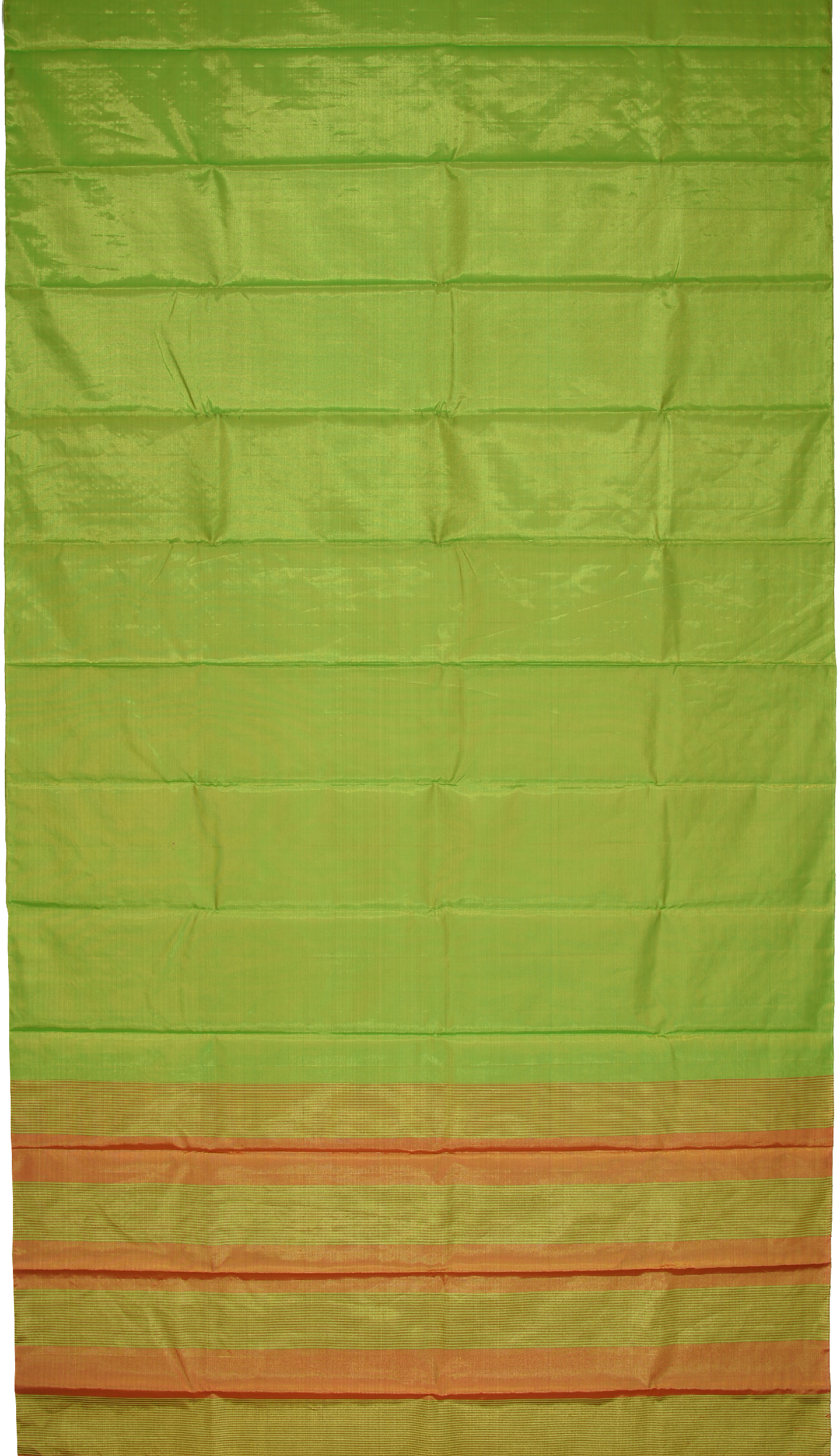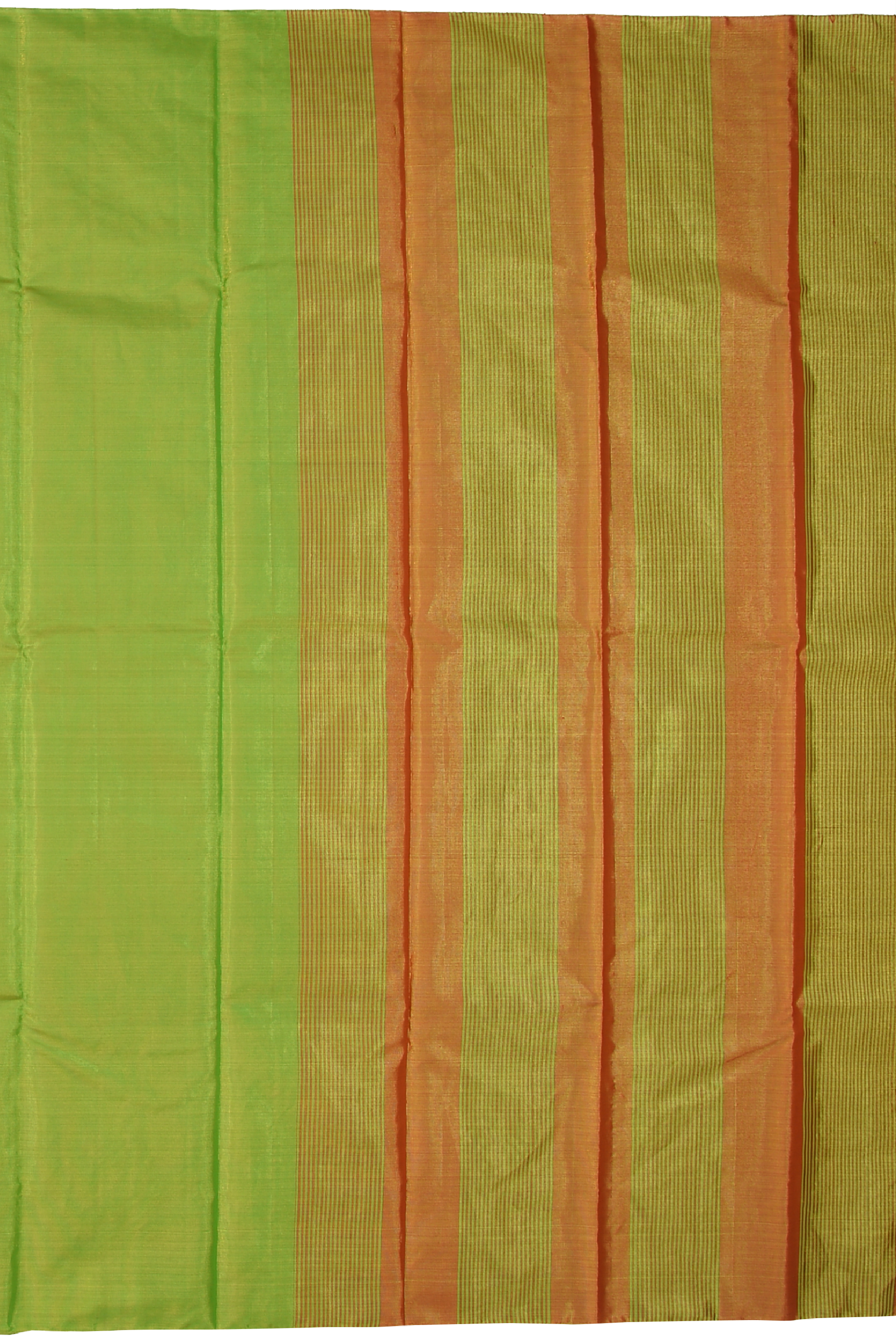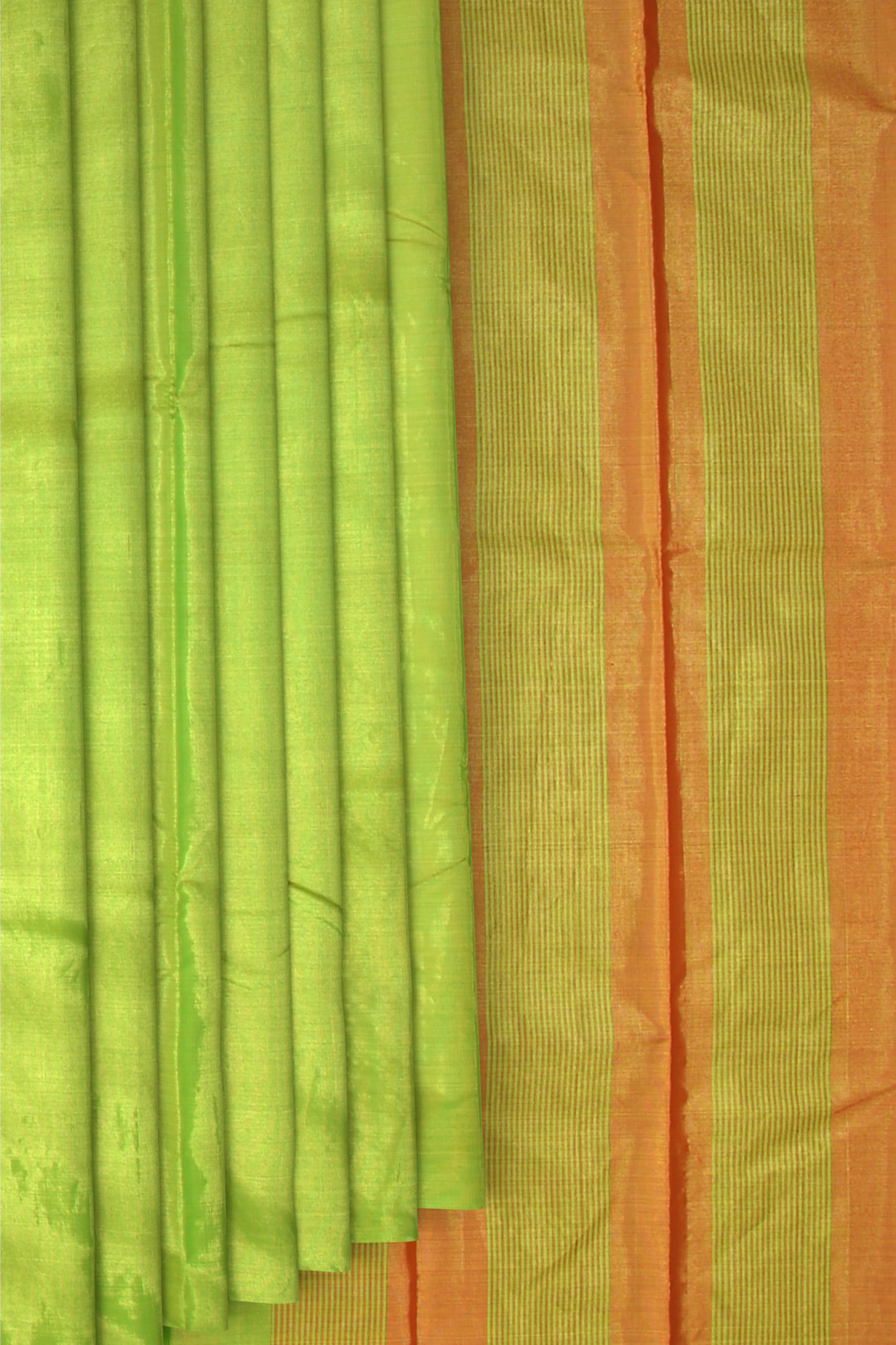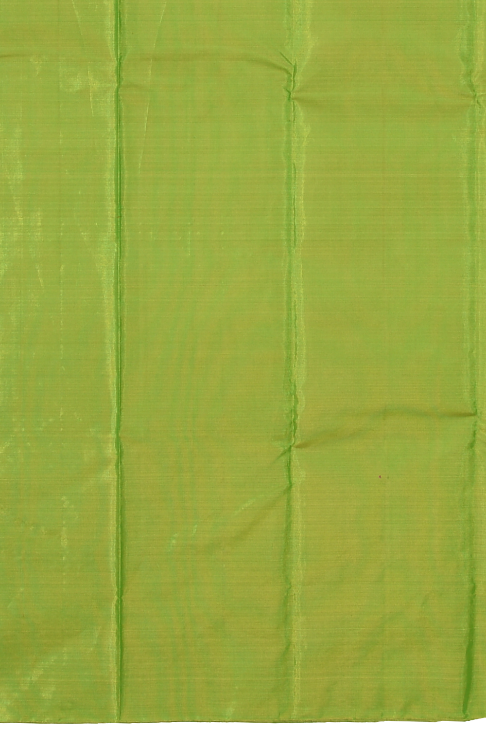This saree celebrates the vibrant shades of nature. The parrot green hue of the saree is reminiscent of lush landscapes and brings a fresh appeal to the ensemble. Crafted from pure silk tissue, the saree shimmers with a subtle elegance.