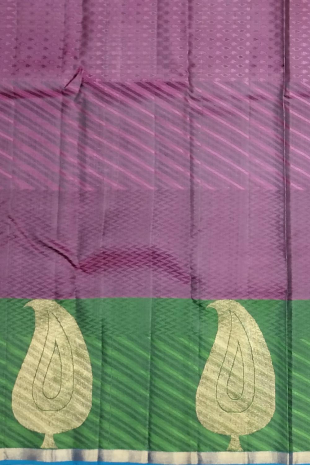 Deep plum silk meets intricate mango motifs in this stunning saree, contrasted beautifully by a bright green border and rich blue pallu. A tri-color harmony that embodies festive grandeur.