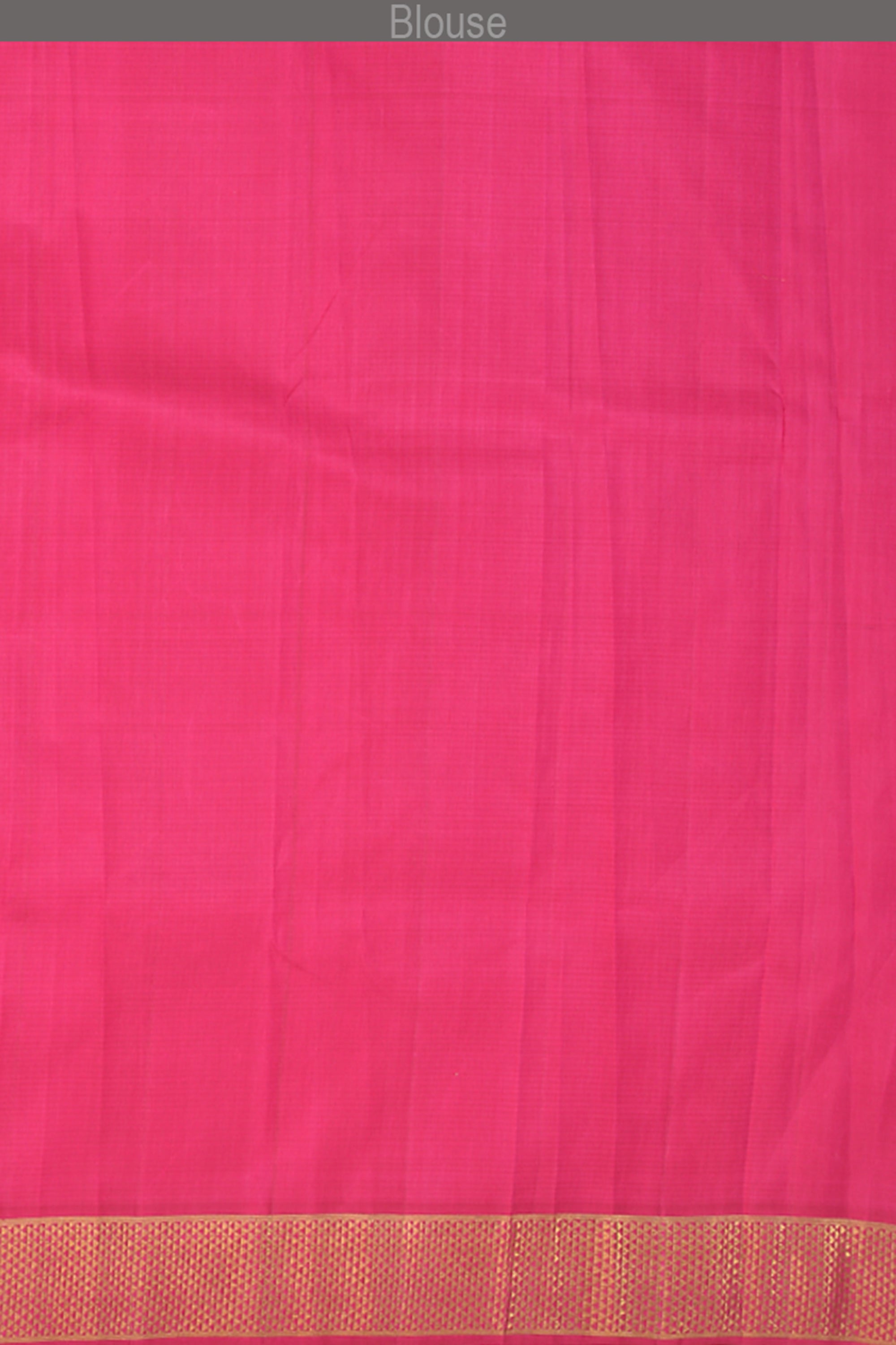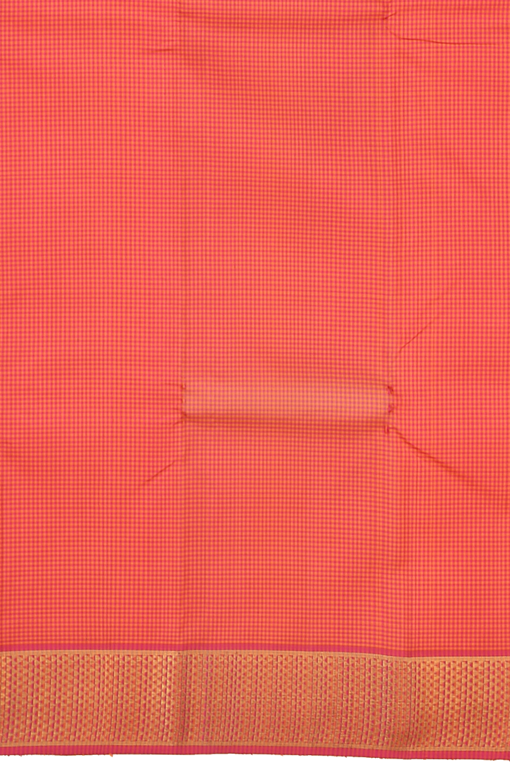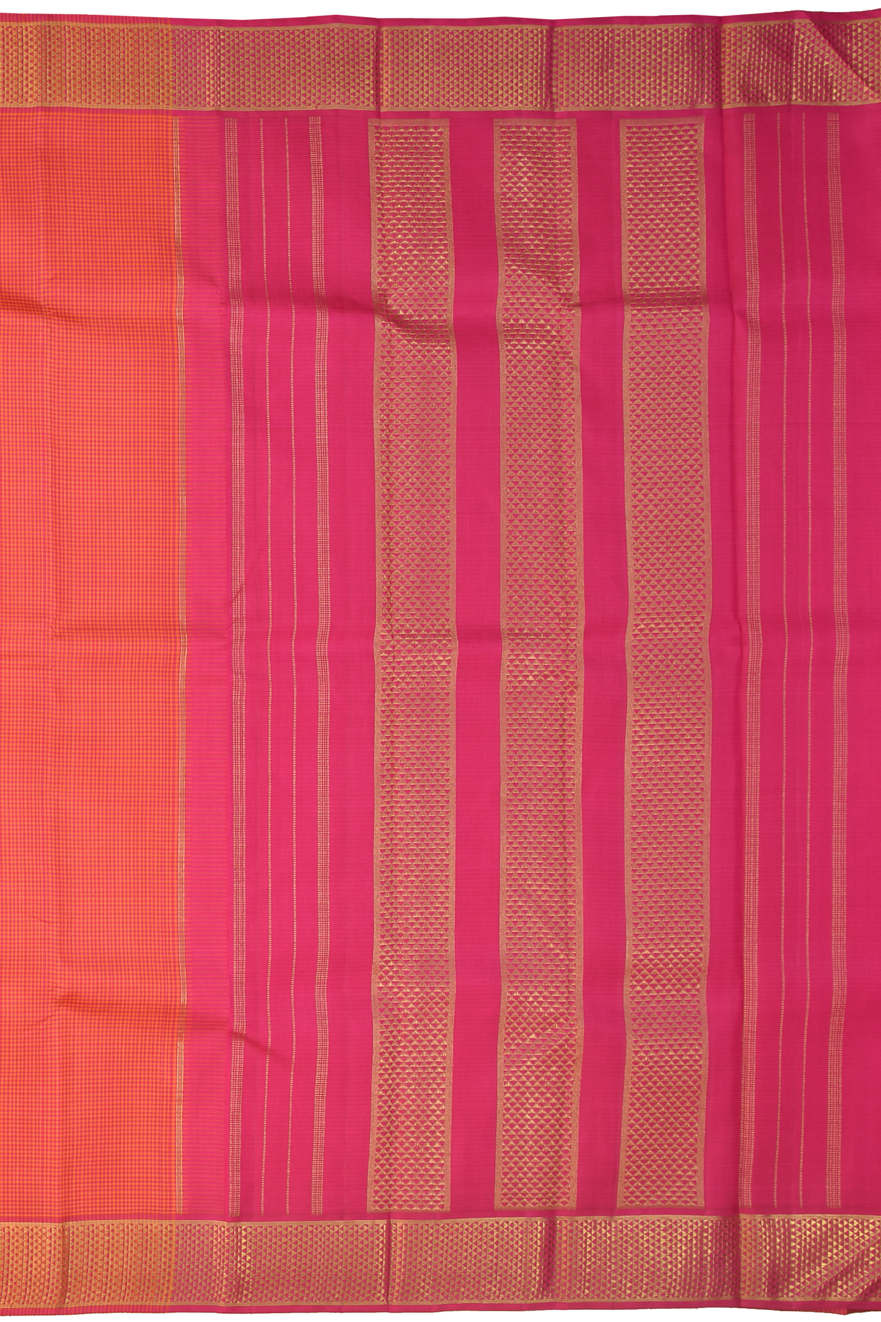 The Podi Kattam checks body intertwines with the Mayil Kan design on the border. The saree gracefully concludes with a Pink pallu adorned with the Mayil Kan border, further enhanced with Seer Mundhi designs.