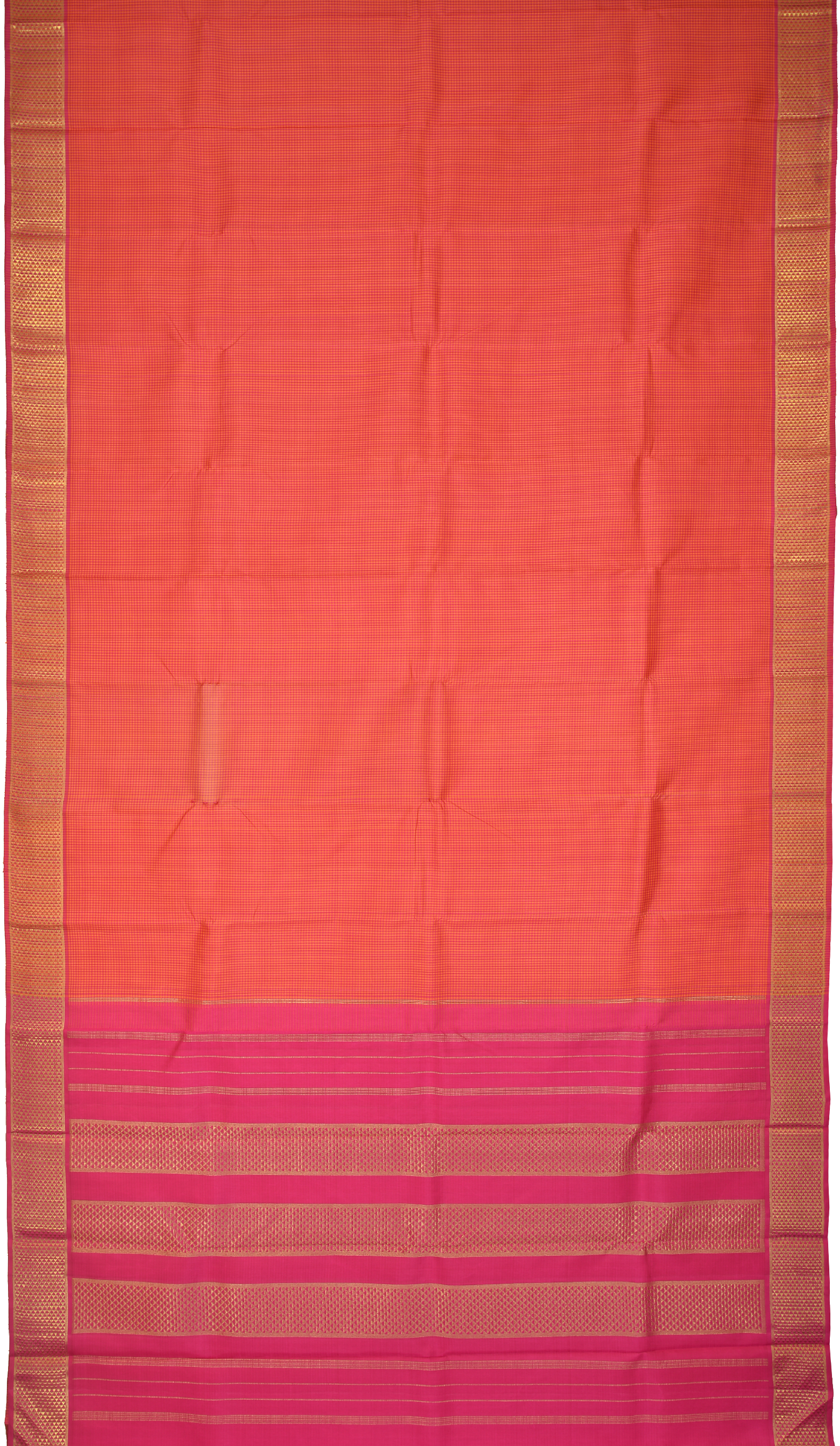 Dive into the embrace of dawn with this vibrant Kanchipuram silk saree. The mesmerizing dance between Orange and Pink creates a visual treat reminiscent of the early morning sky.