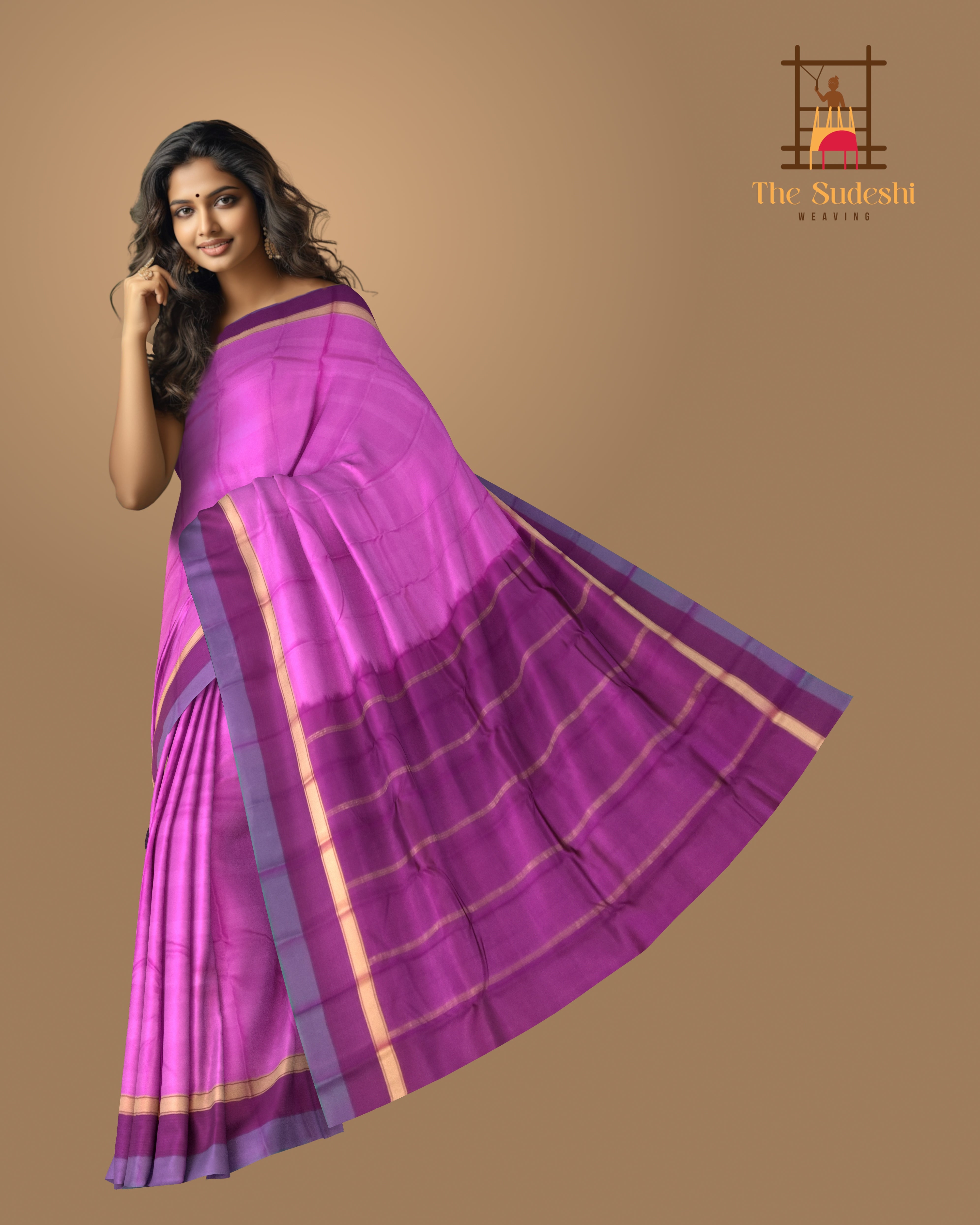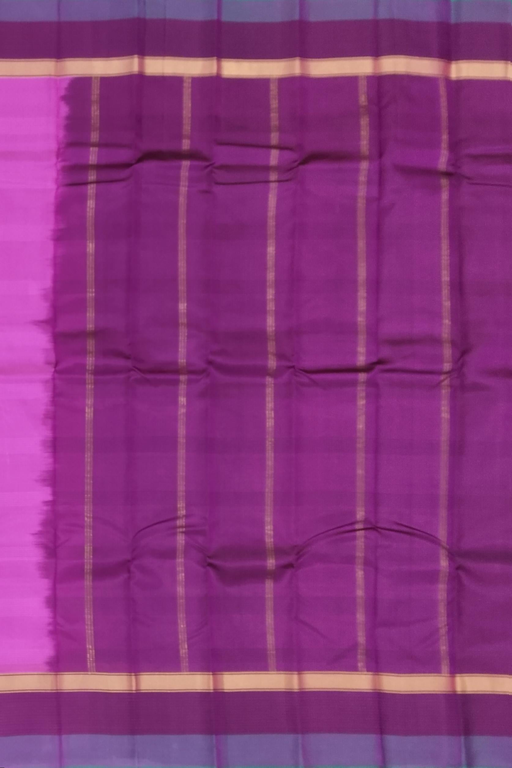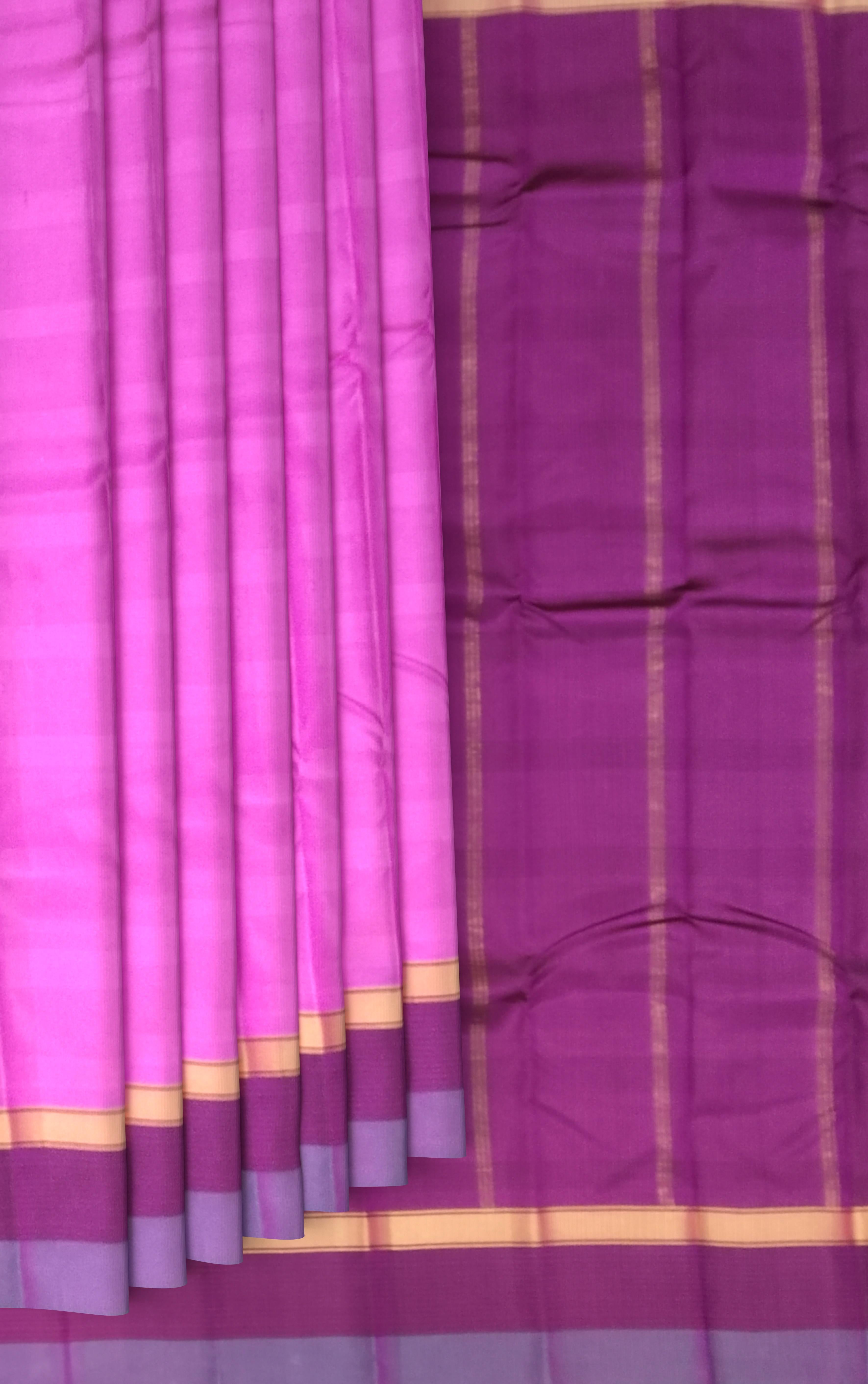 Discover contemporary grace with this Pretty Pink Kanchipuram Silk Saree, adorned with elegant horizontal lines and rich dark purple accents. The delicate pink body exudes a soft, feminine charm, while the modern horizontal lines add a sophisticated geometric element. The deep dark purple in the border and pallu provides a striking contrast, elevating the saree with a touch of regal elegance.