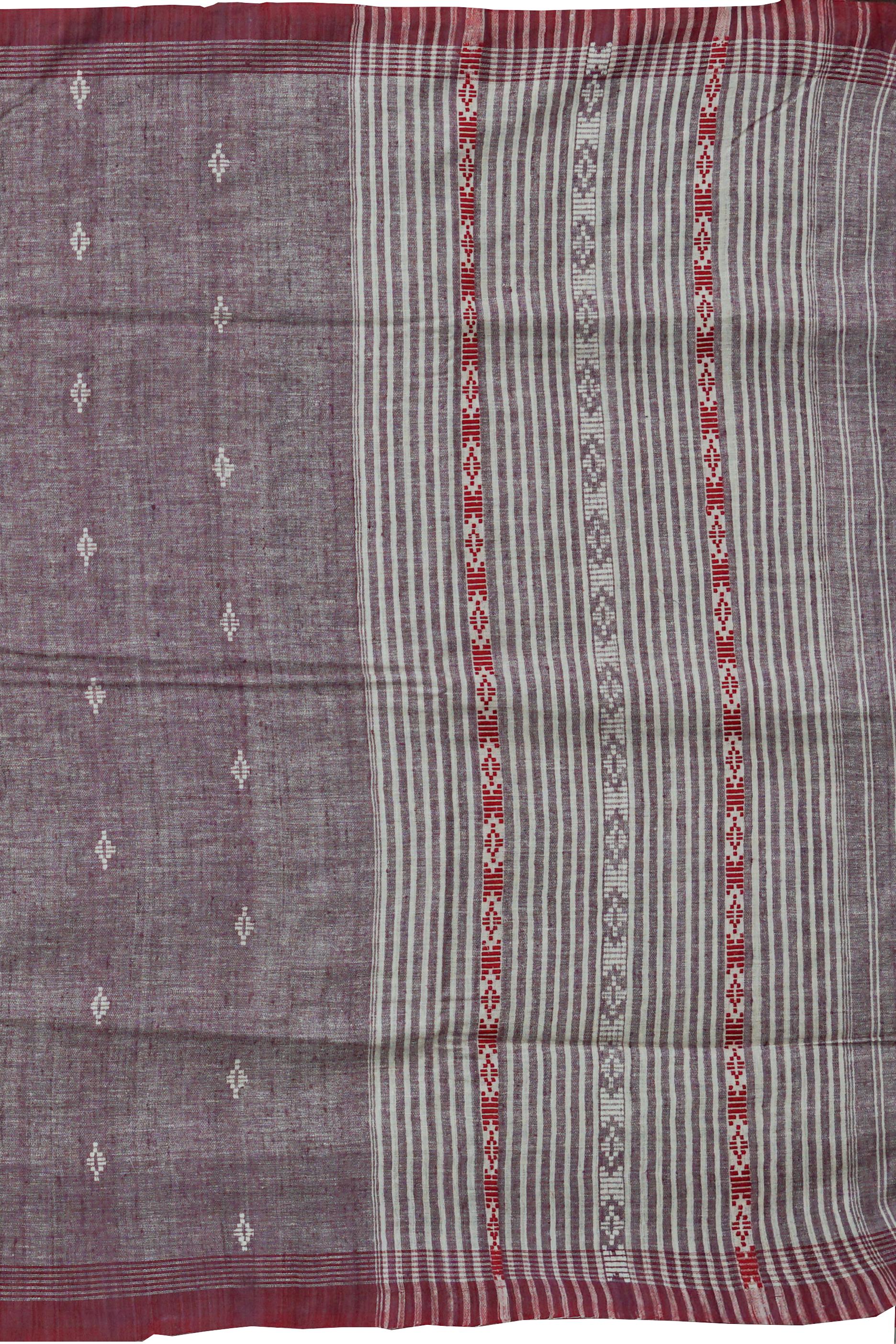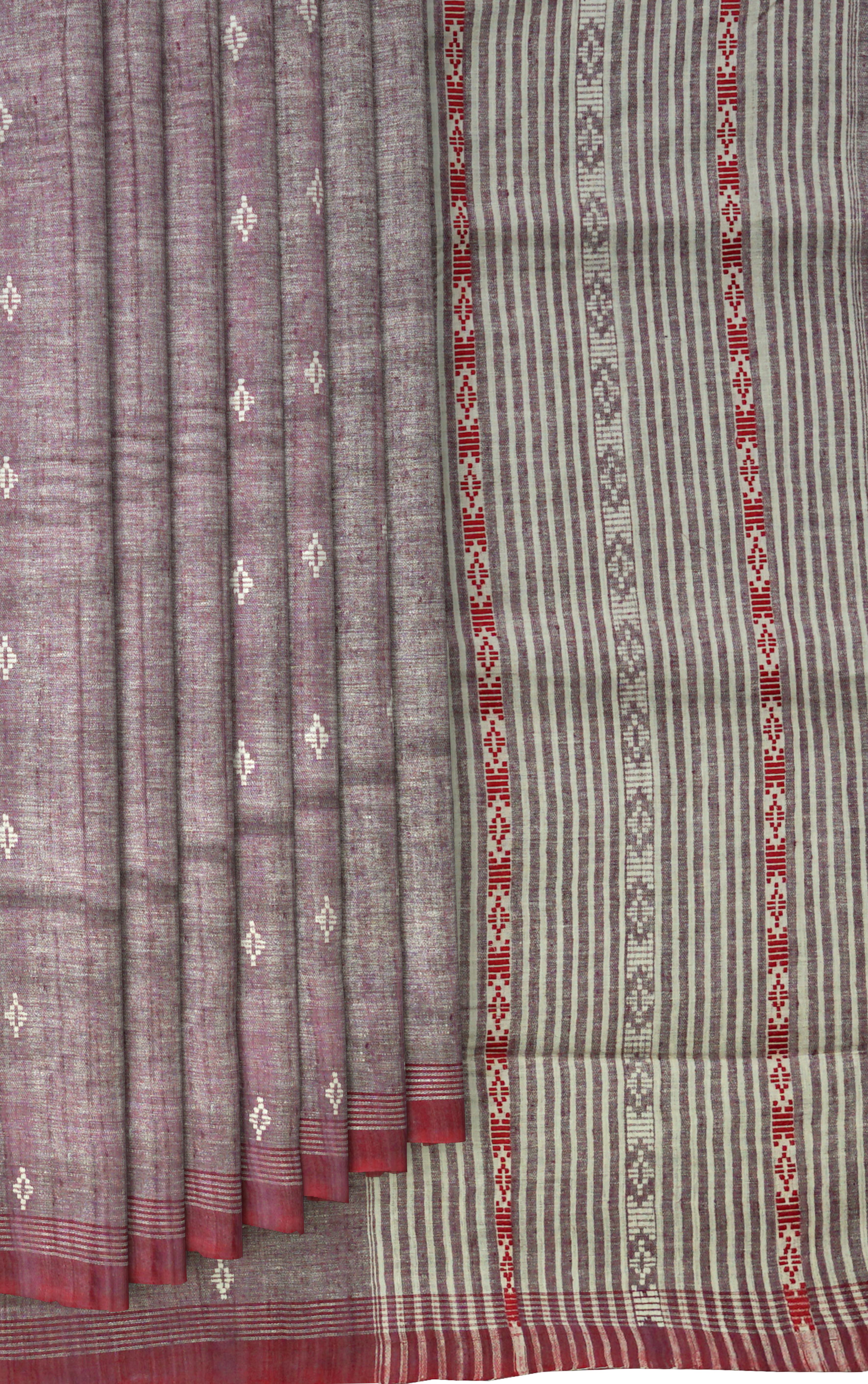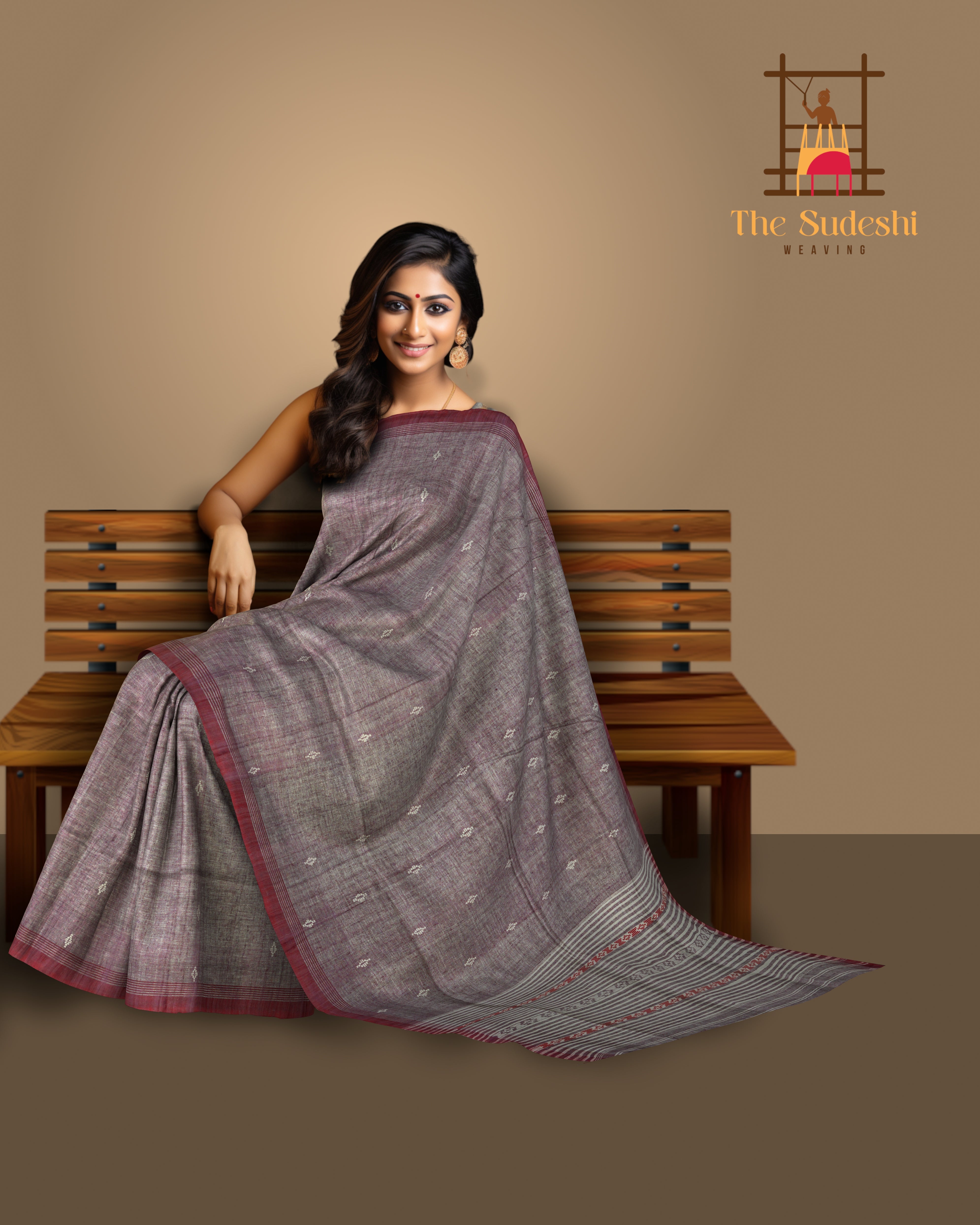 Embrace the rich tradition and craftsmanship of Assam with our Purple Eri Silk Saree with a Brown Border. This saree is woven from pure Eri silk, known for its unique texture and eco-friendly production process. The deep purple body is adorned with delicate buttis, creating a stunning contrast with the earthy brown border. This saree is a perfect representation of the timeless elegance and cultural richness of Assamese handloom.