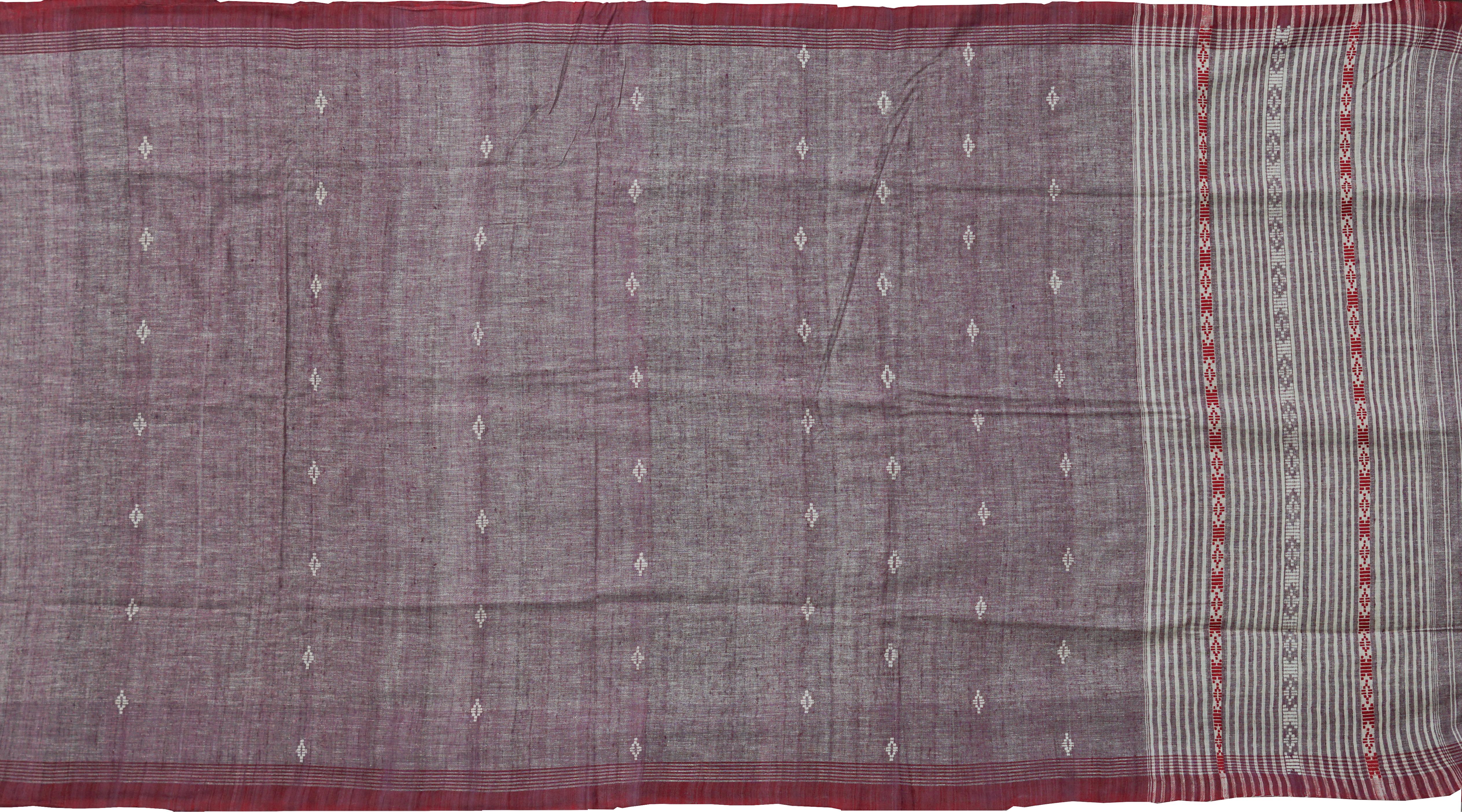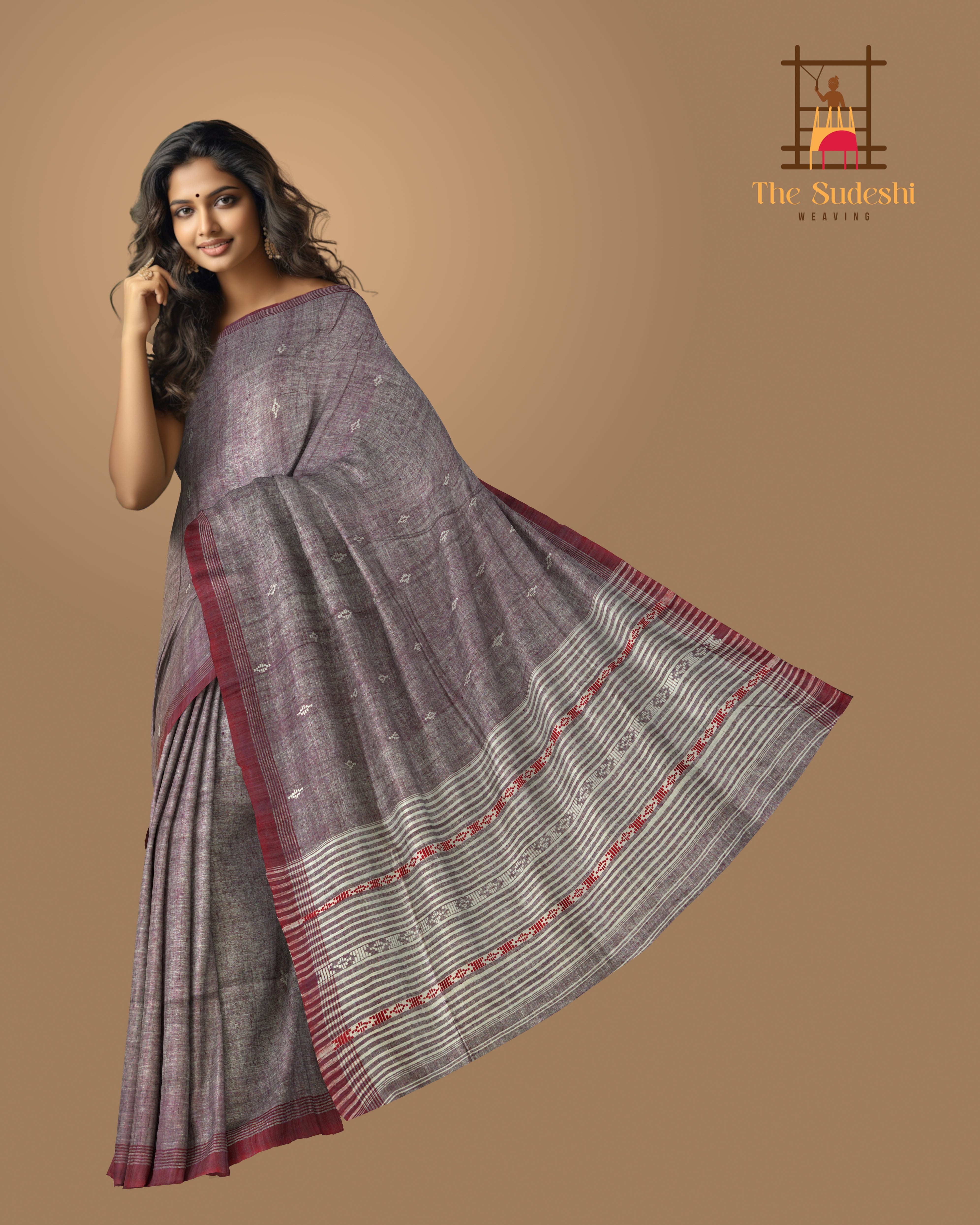 The motifs on this saree are inspired by the natural beauty and cultural symbols of Assam, featuring geometric and stylized patterns that represent flowers, plants, and traditional artifacts. These motifs are woven using the extra-weft technique, giving them a raised effect that adds texture and depth to the fabric. The combination of purple and brown is both sophisticated and versatile, making this saree suitable for a variety of occasions.