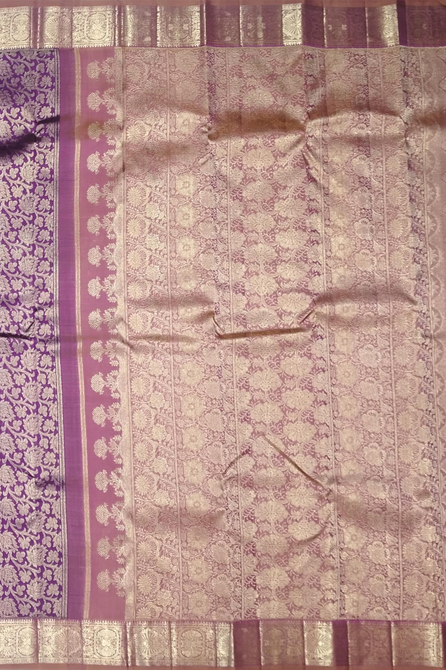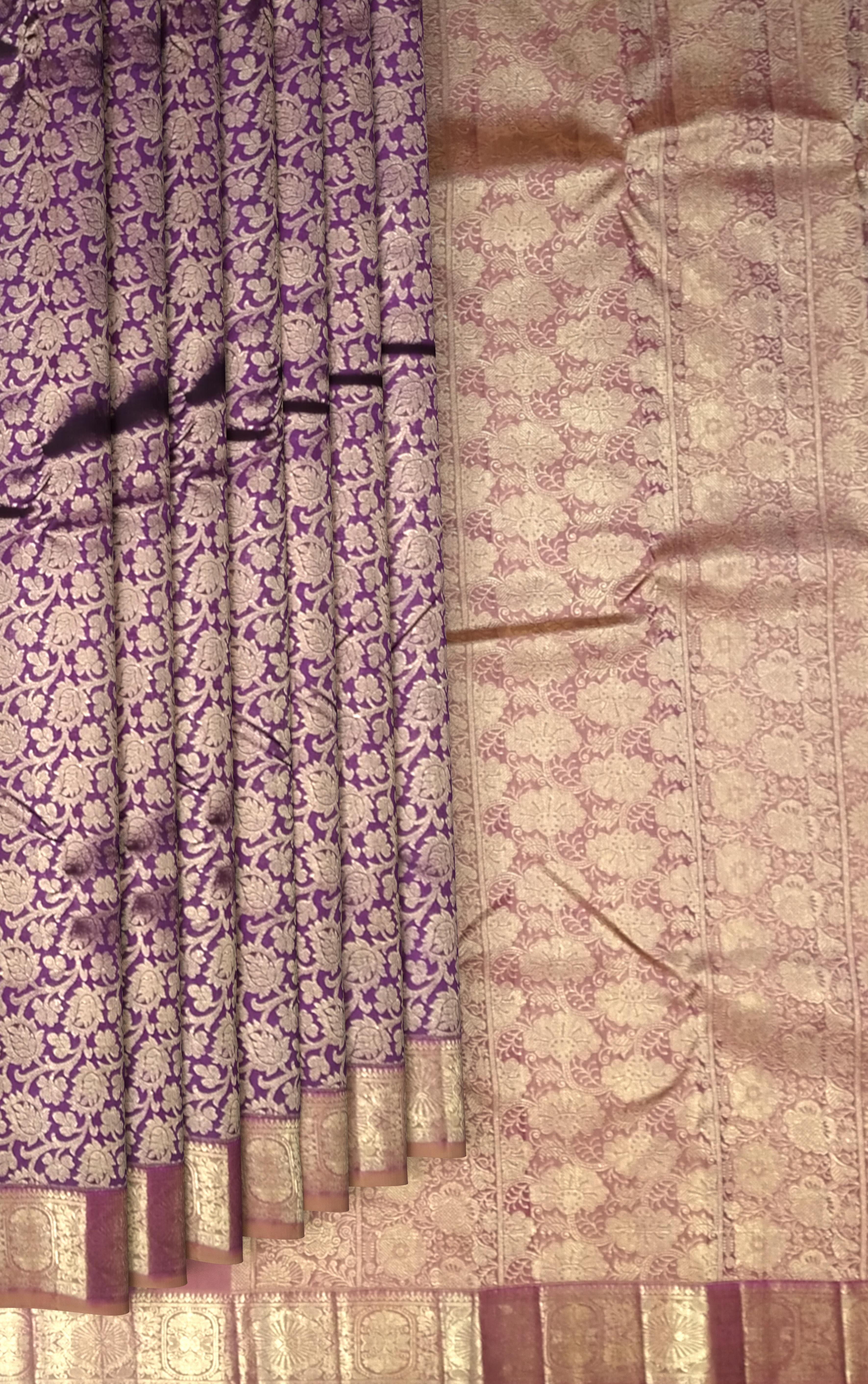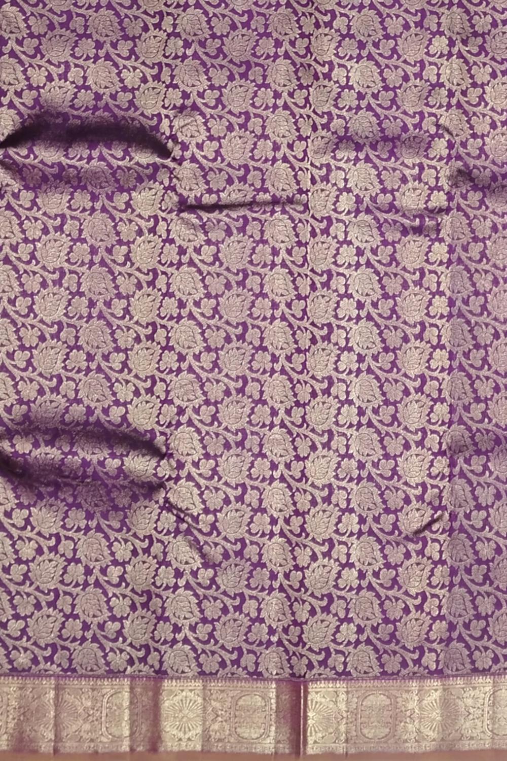 The floral jacquard pattern in this saree is a nod to nature’s beauty as well as the heritage of Kanchipuram’s weaving culture. Purple, often associated with devotion and royalty, is balanced by the earthy tones of light brown—symbolizing grounding elegance. This saree is a fine example of how timeless motifs and contemporary styling can coexist, woven on the looms of skilled artisans whose work is steeped in cultural reverence.