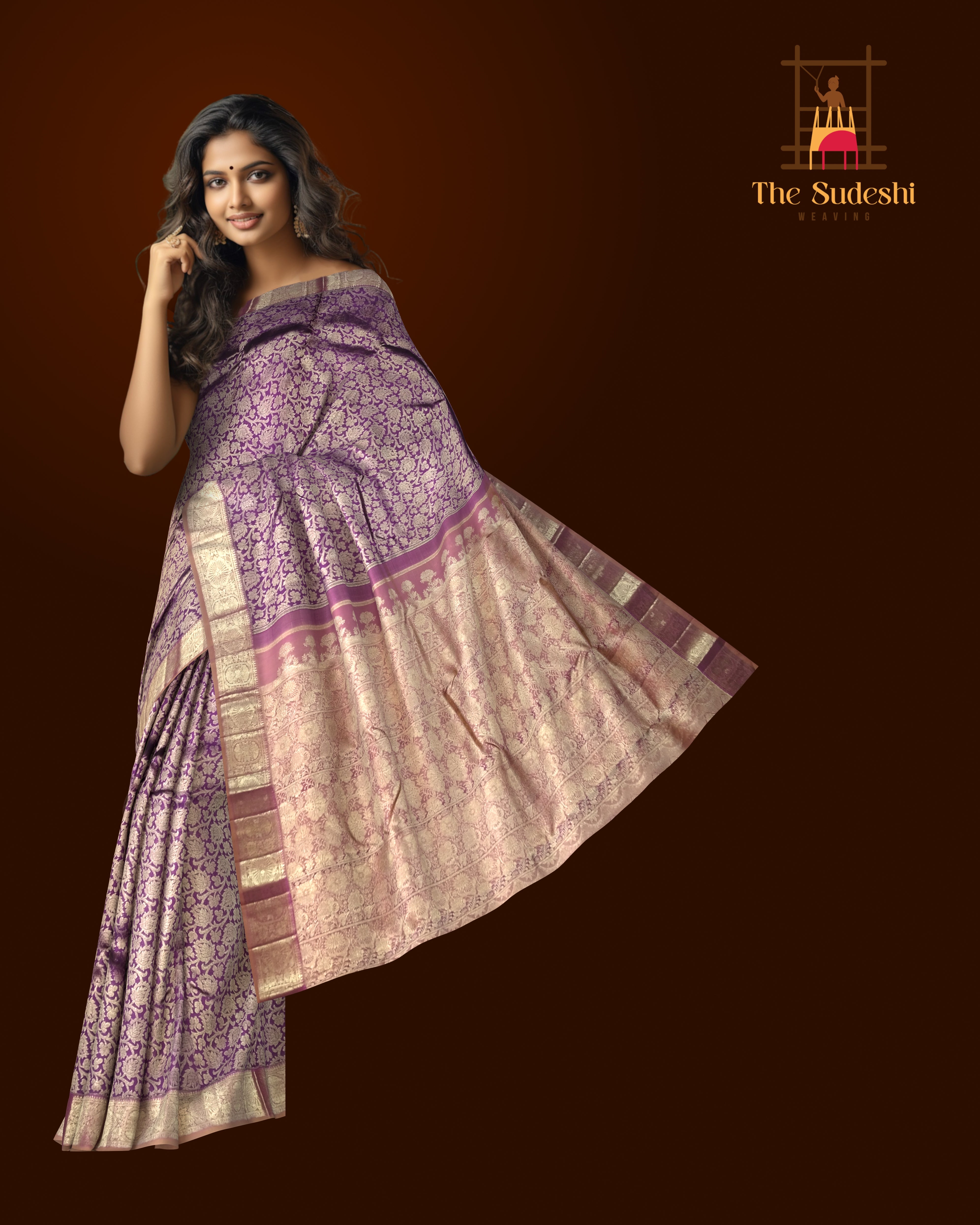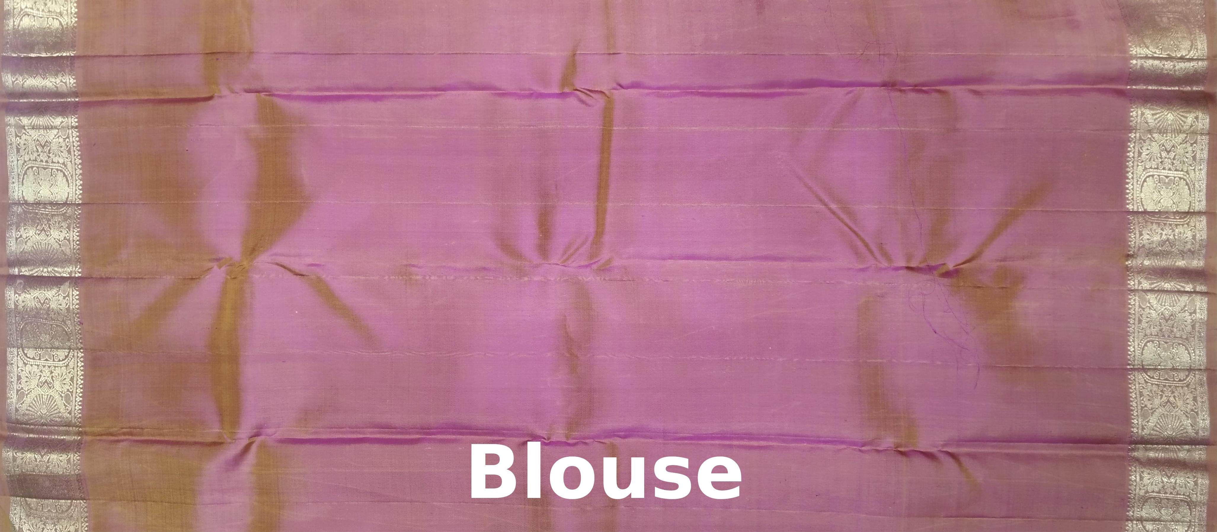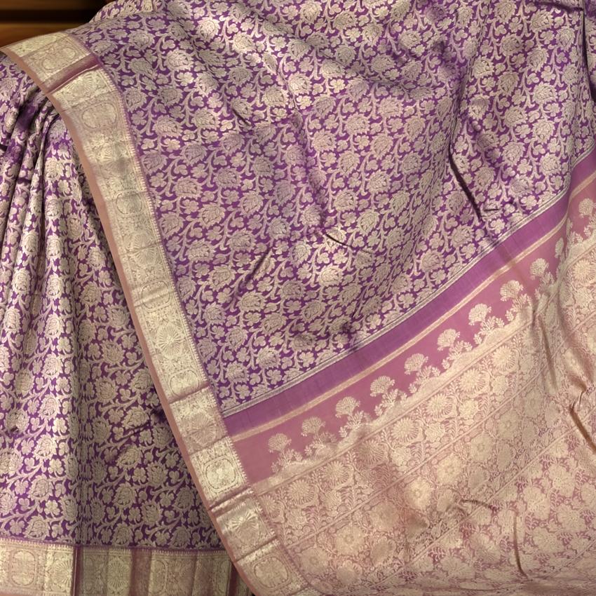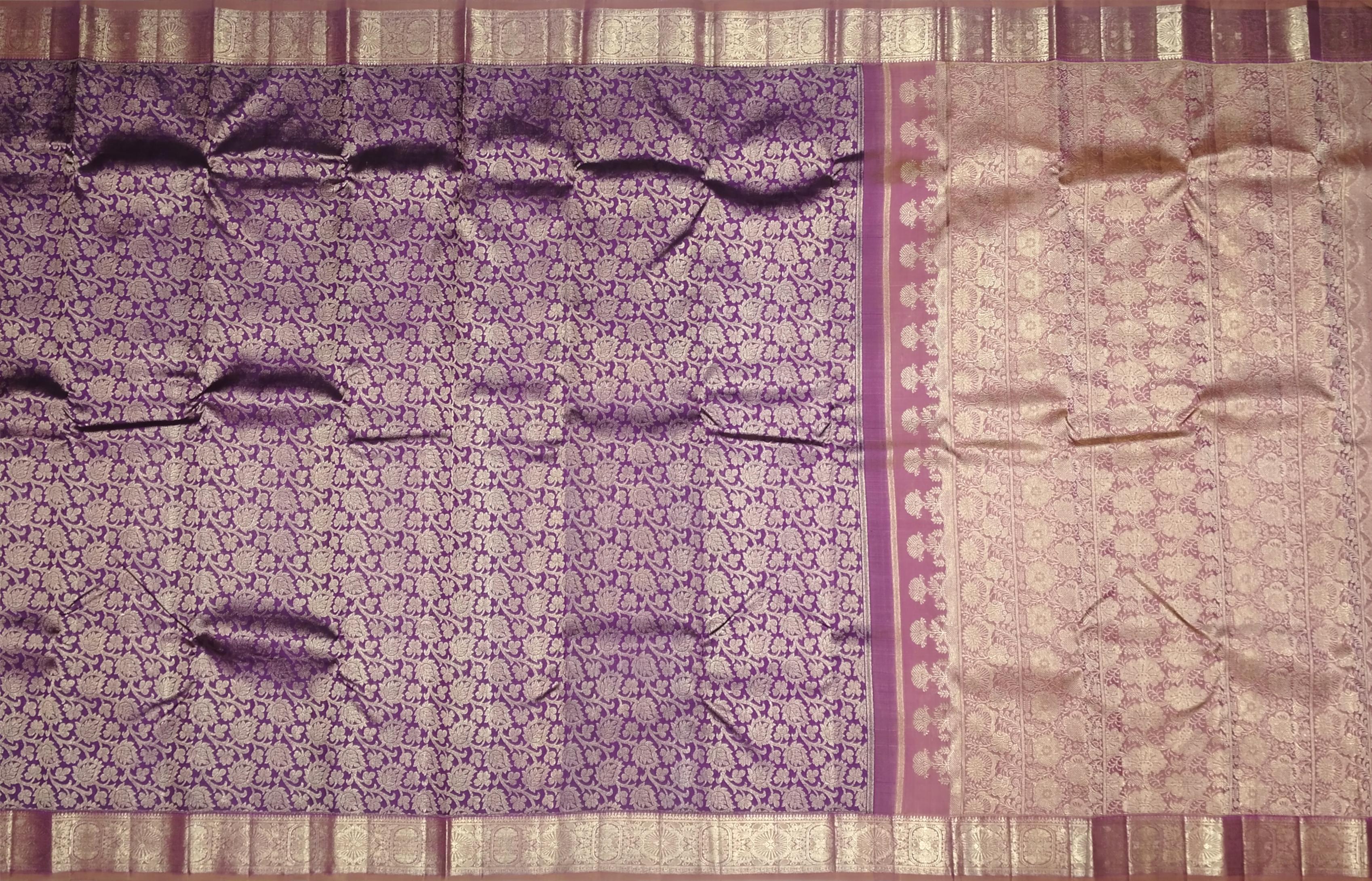 The floral jacquard pattern in this saree is a nod to nature’s beauty as well as the heritage of Kanchipuram’s weaving culture. Purple, often associated with devotion and royalty, is balanced by the earthy tones of light brown—symbolizing grounding elegance. This saree is a fine example of how timeless motifs and contemporary styling can coexist, woven on the looms of skilled artisans whose work is steeped in cultural reverence.