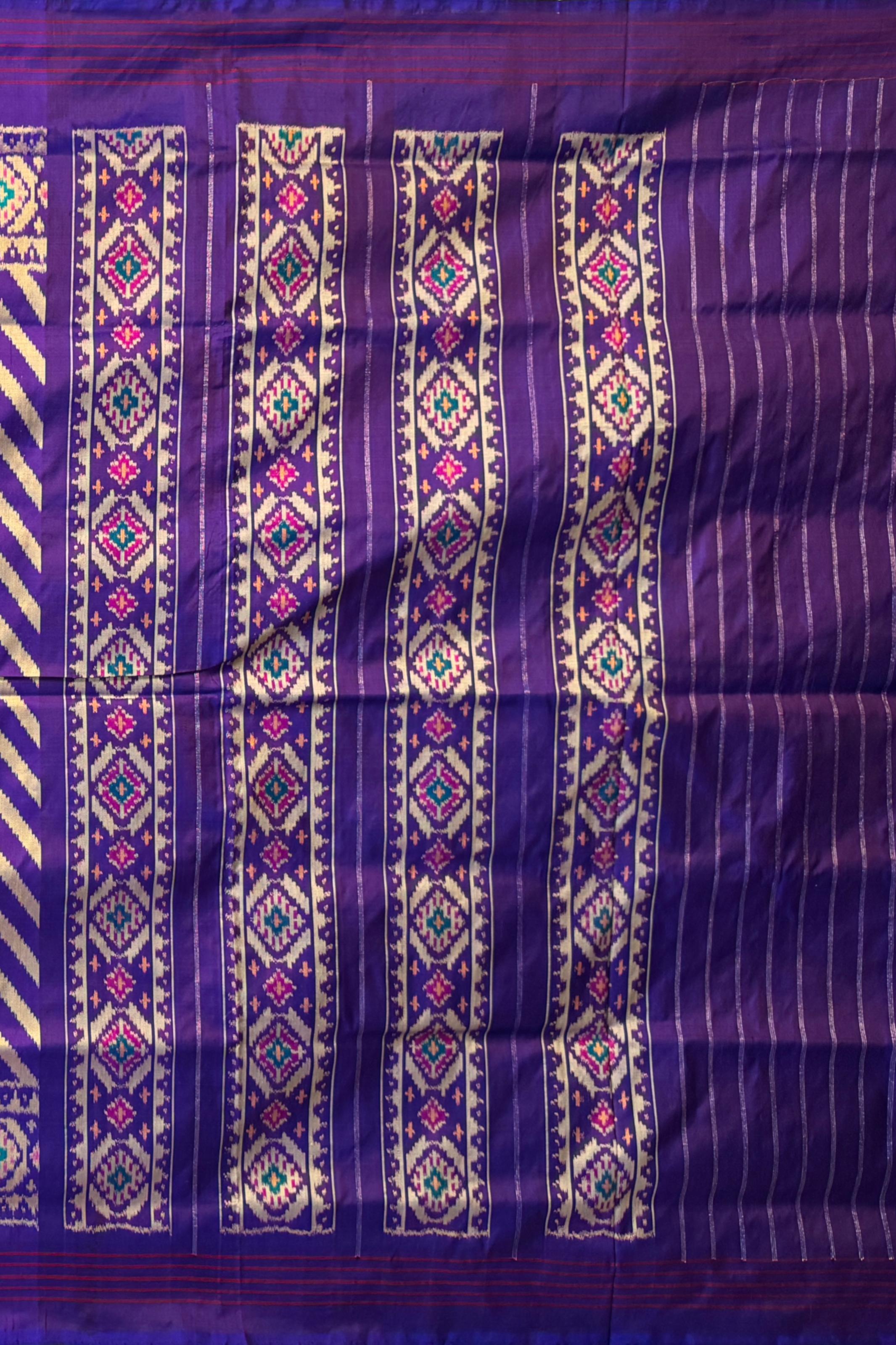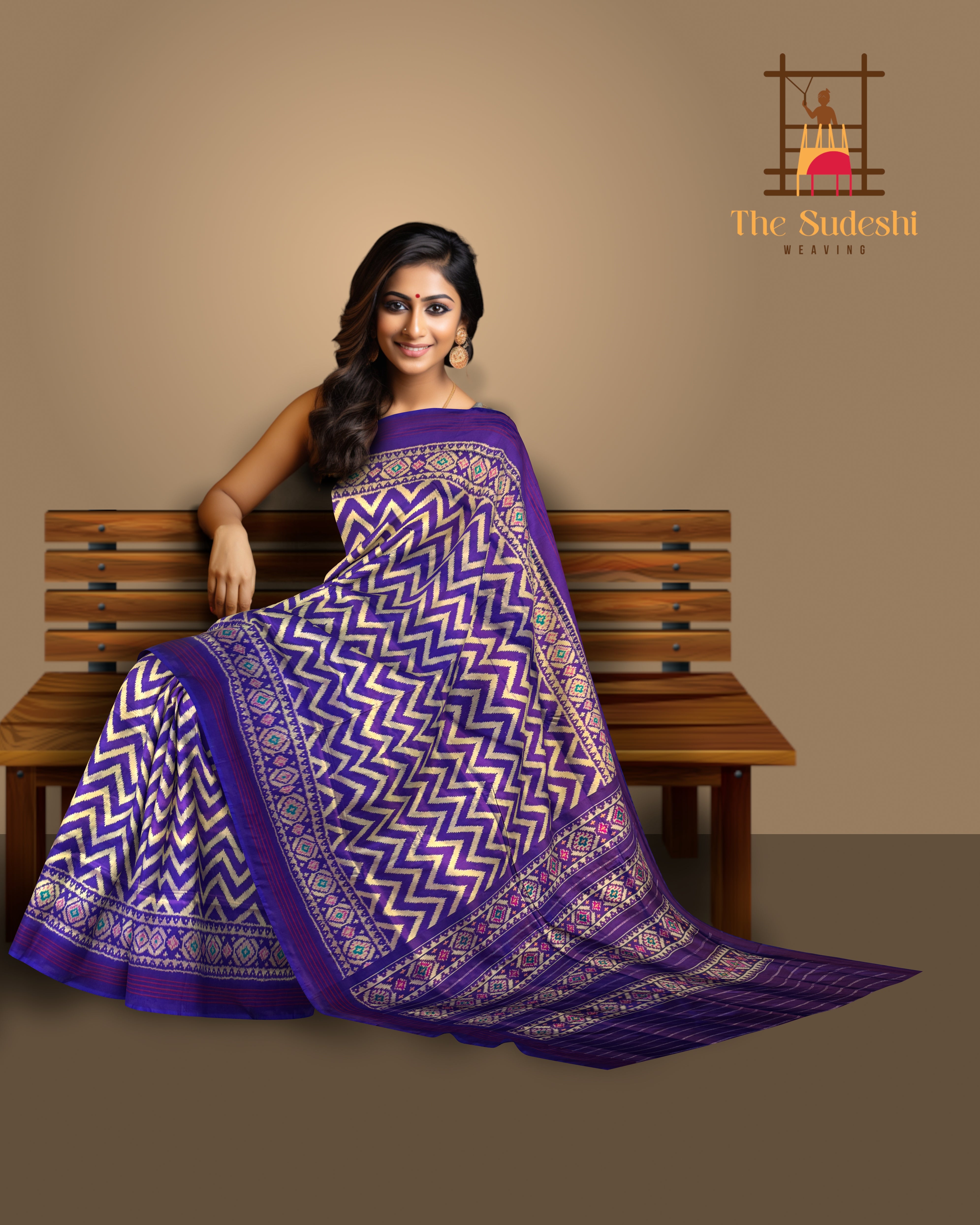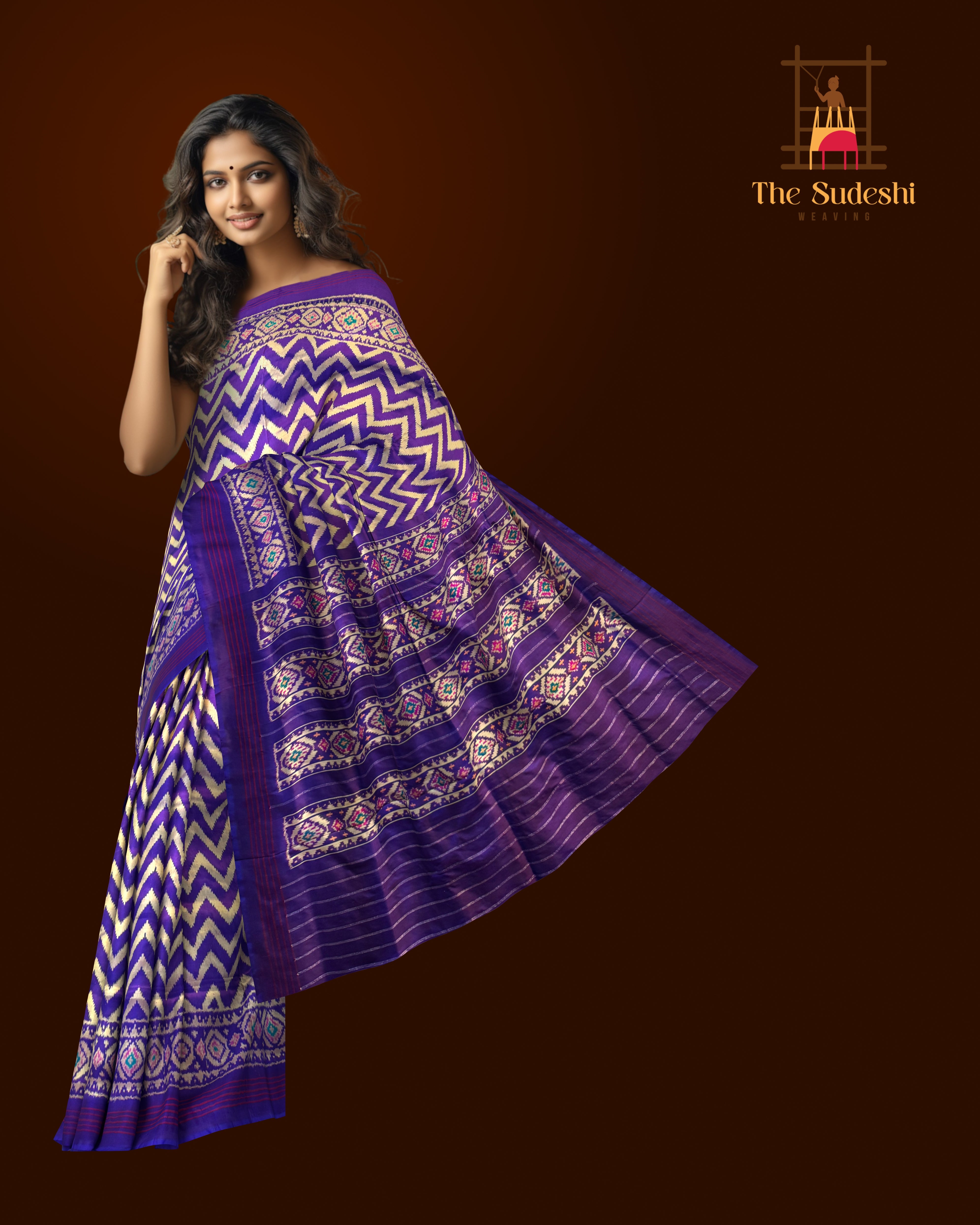Drape yourself in regal elegance with this Purple Pochampally Ikat Saree, featuring a deep purple body complemented by a matching purple border and pallu. The uniform color theme adds a sophisticated monochrome effect, while the intricate ikat patterns lend an artistic touch to the overall appearance. Originating from Pochampally in Telangana, these Ikat sarees are a testament to India’s age-old double ikat weaving tradition. In this technique, each yarn is pre-dyed with precision to form complex motifs that symbolize cultural prosperity, creativity, and depth. Purple, long associated with royalty and wisdom, enhances the saree's grandeur. Perfect for festive evenings, formal occasions, and cultural gatherings, this saree pairs beautifully with a contrasting gold or silver blouse. Complete your ensemble with antique gold or kundan jewelry for a majestic and timeless look. Note: The appearance of the product’s colors may vary due to lighting conditions or your device’s screen calibration. For further assistance or additional images/videos, feel free to contact us at +91 97897 60367 / +1 (945) 308-5962 or email at wecare@thesudeshiweaving.com.