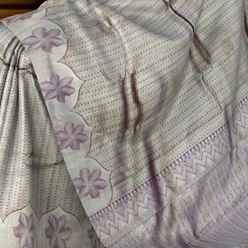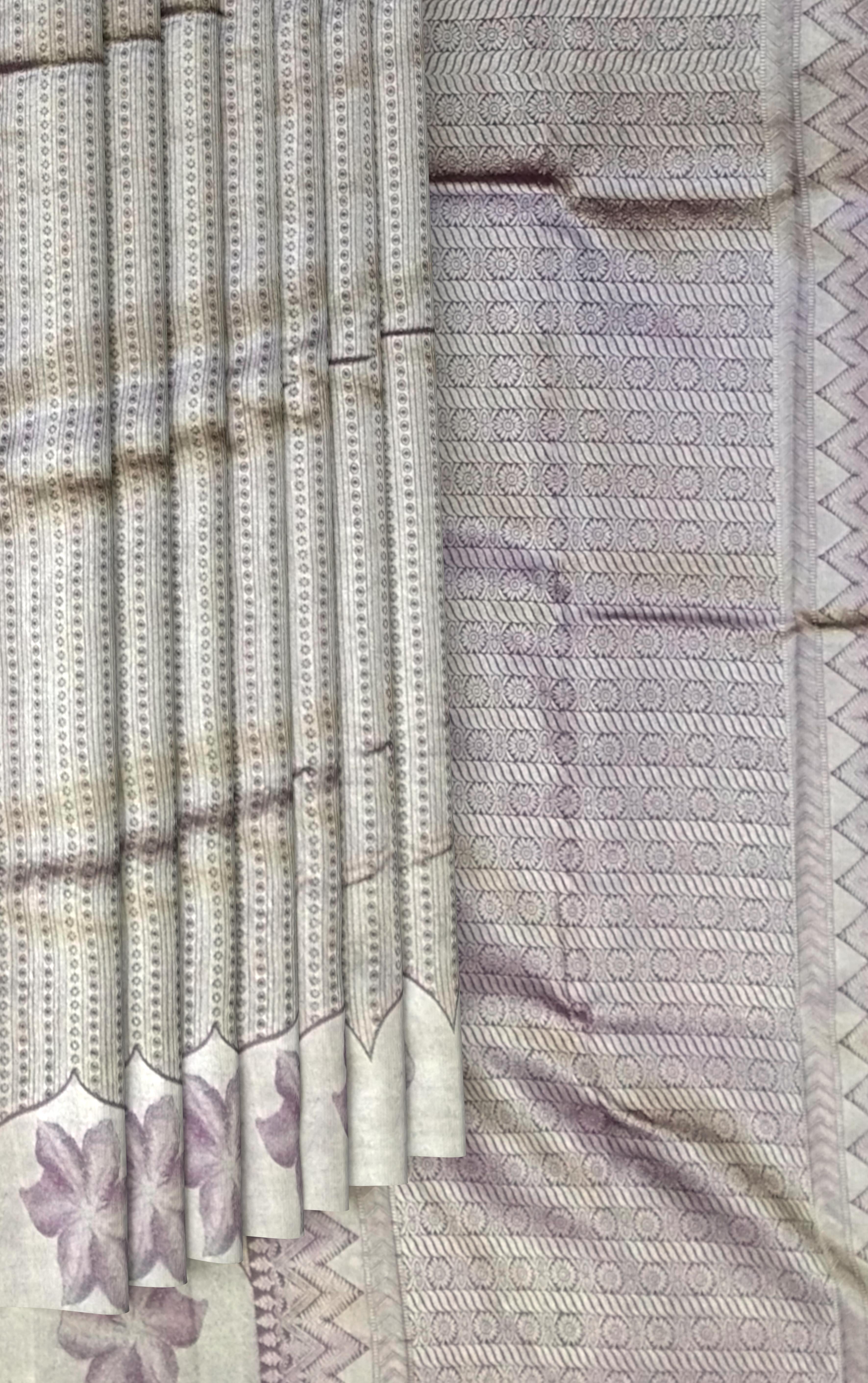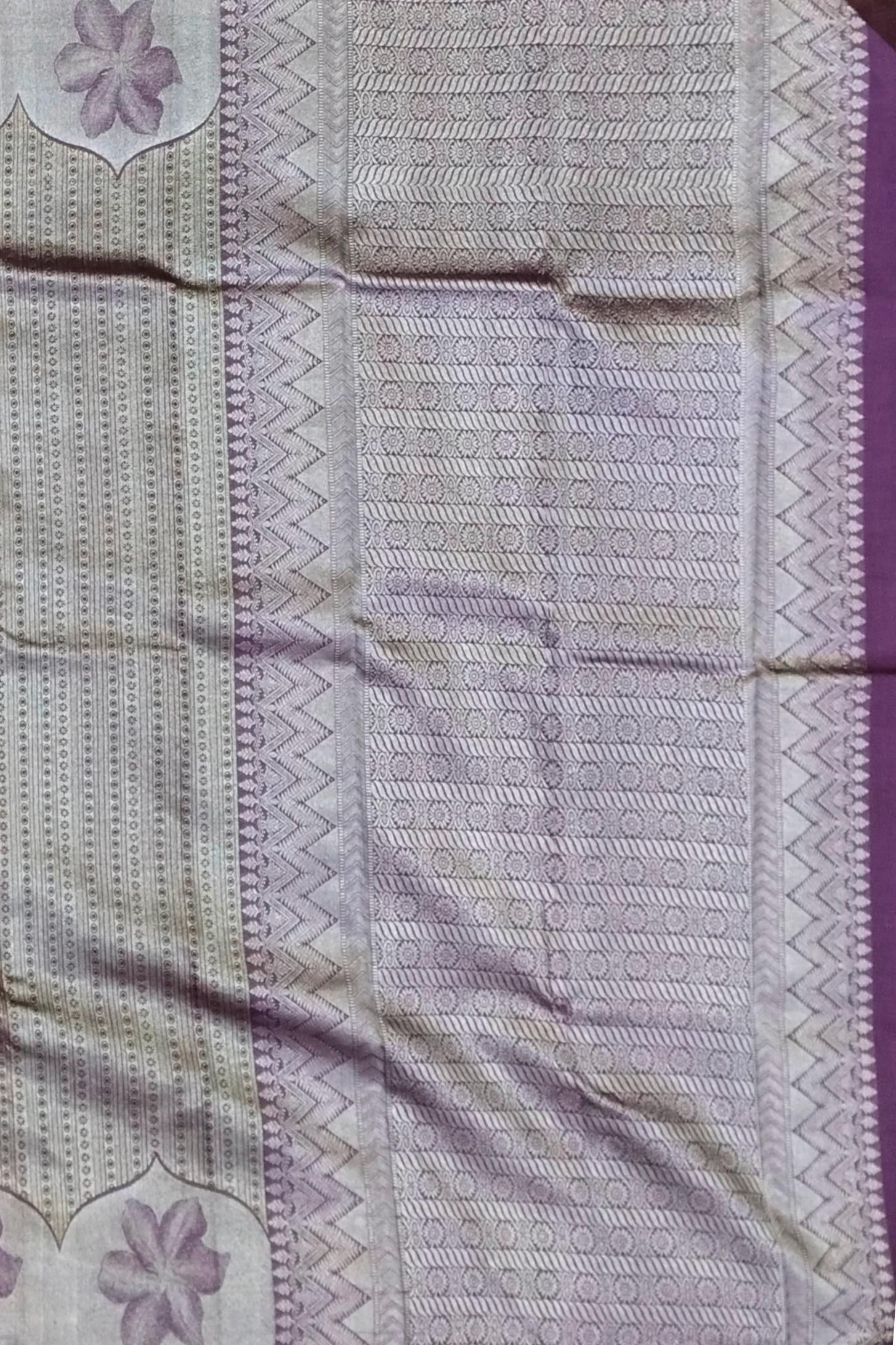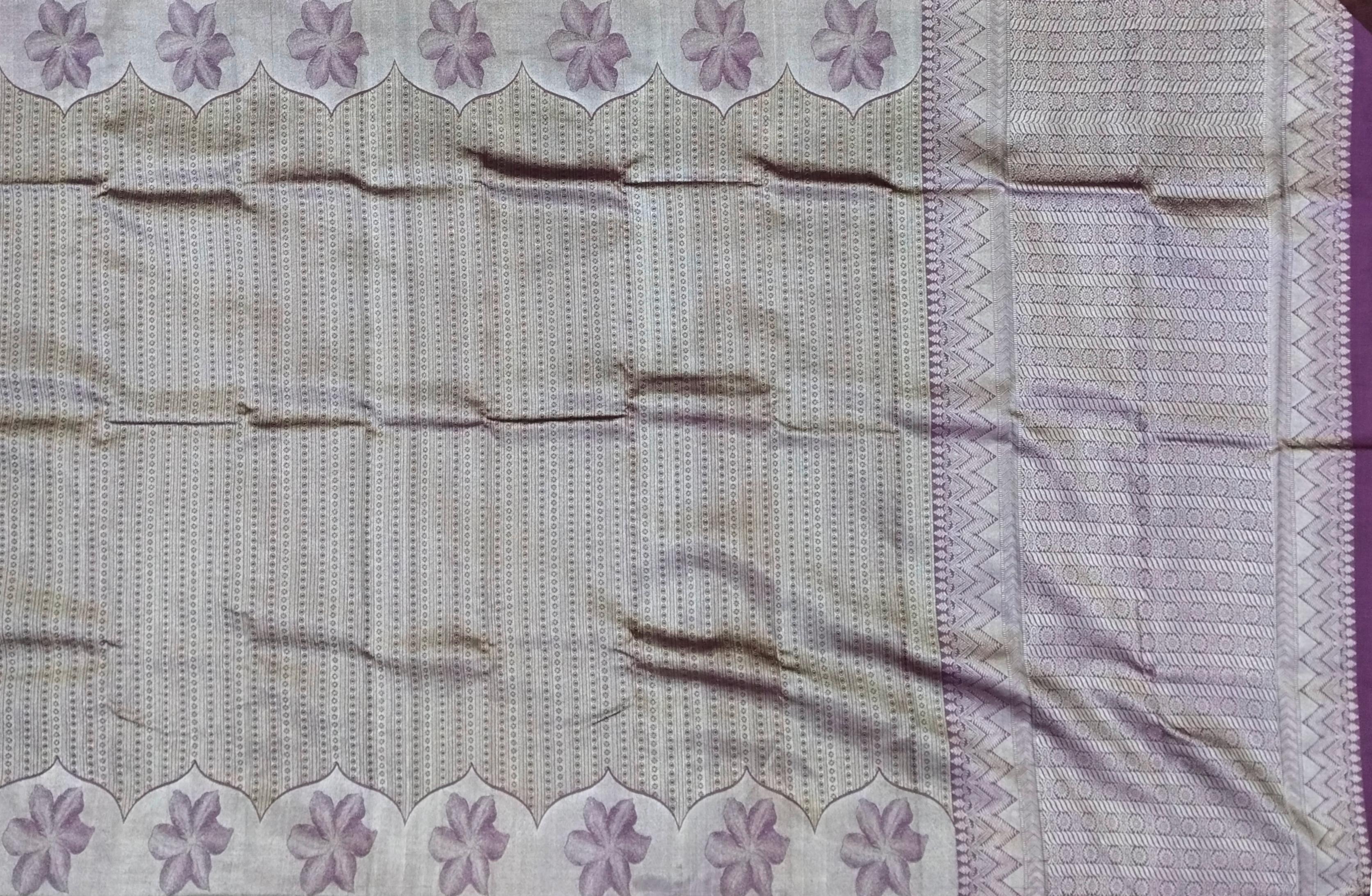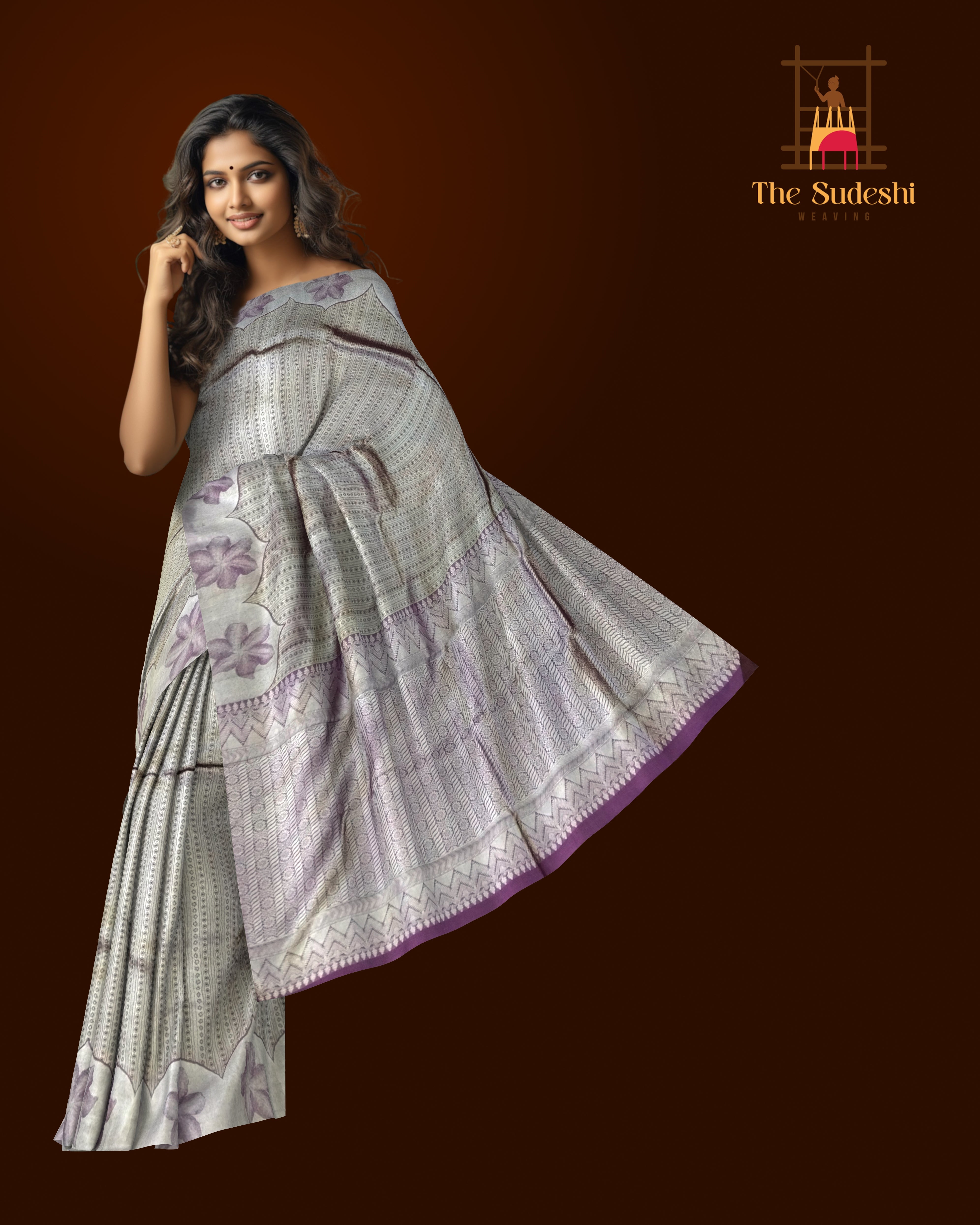 Purple is a color of dignity and devotion, often worn during religious events or auspicious days. The vertical jacquard weave adds sophistication to the saree’s body, while the floral border represents beauty, abundance, and prosperity—key themes in traditional South Indian weaving lore.