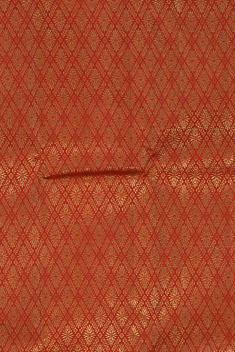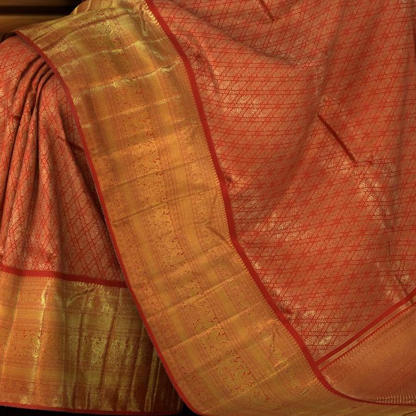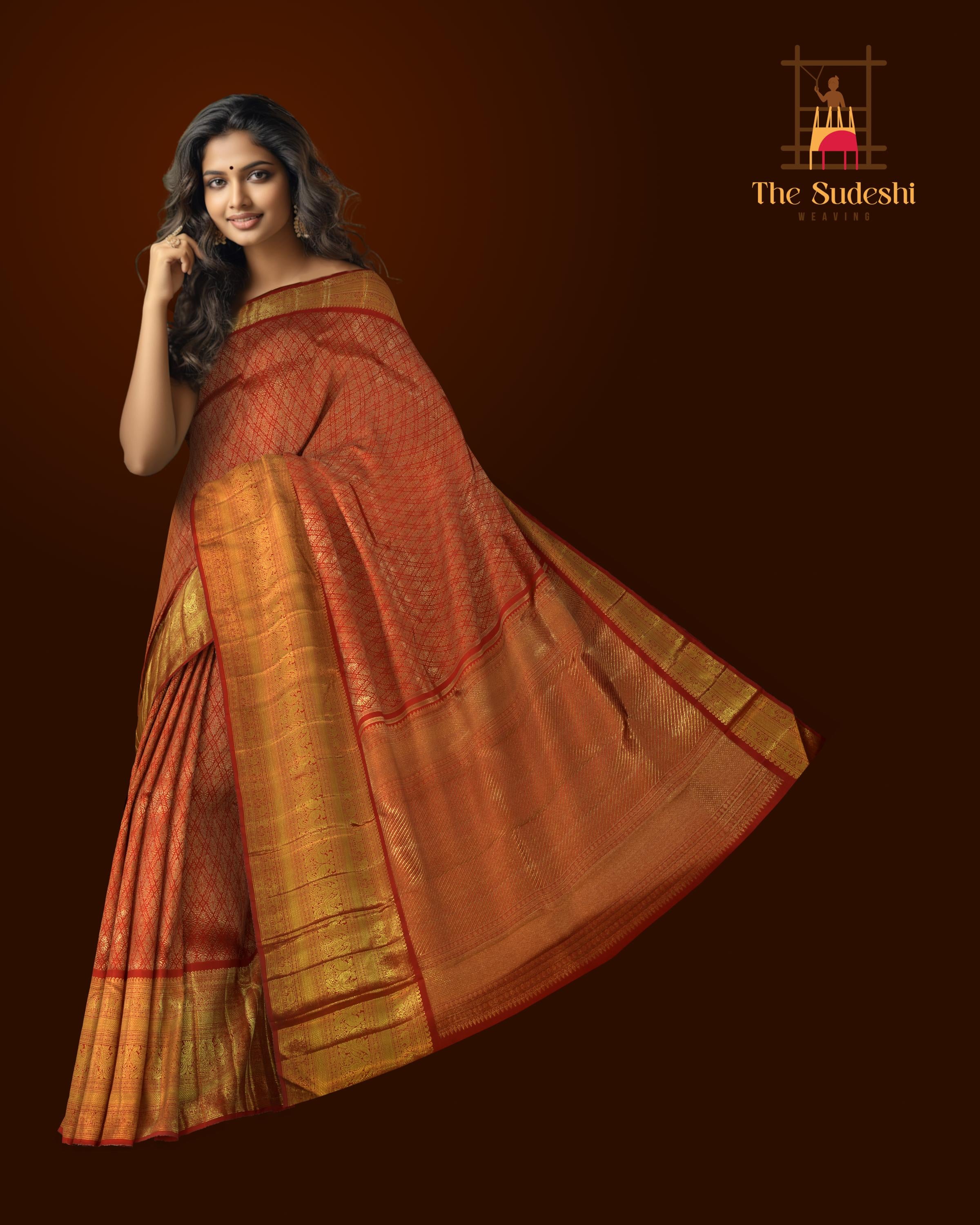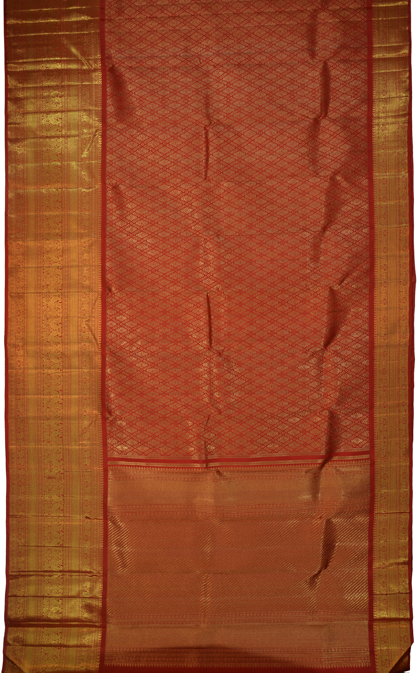 Embrace the vigor and vitality of India's traditions with this radiant Kanchipuram silk saree. Dyed in a deep red, it captures the fervor of festivities and age-old rituals. As you drape this saree, you adorn yourself with centuries of artistry, craftsmanship, and cultural pride.