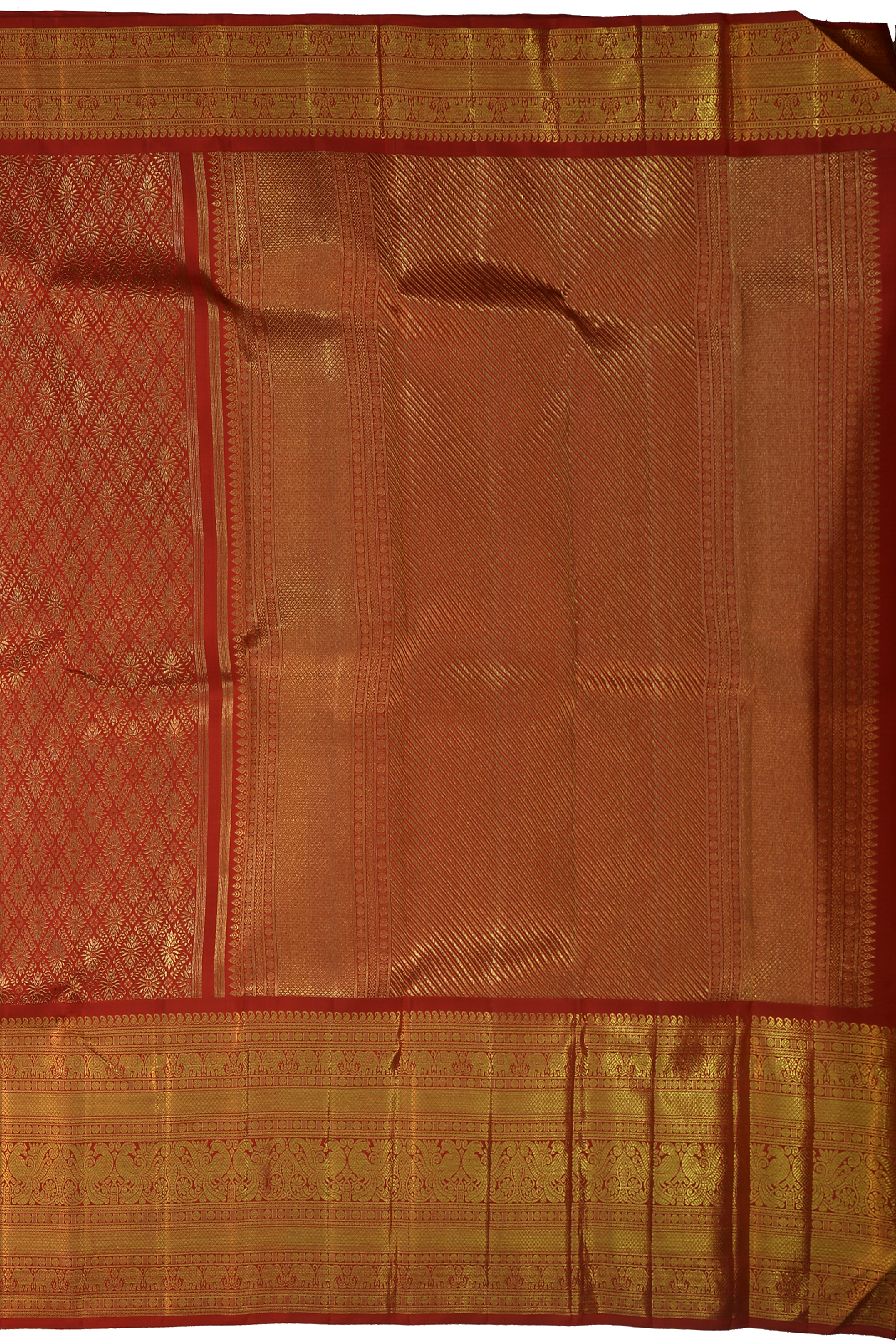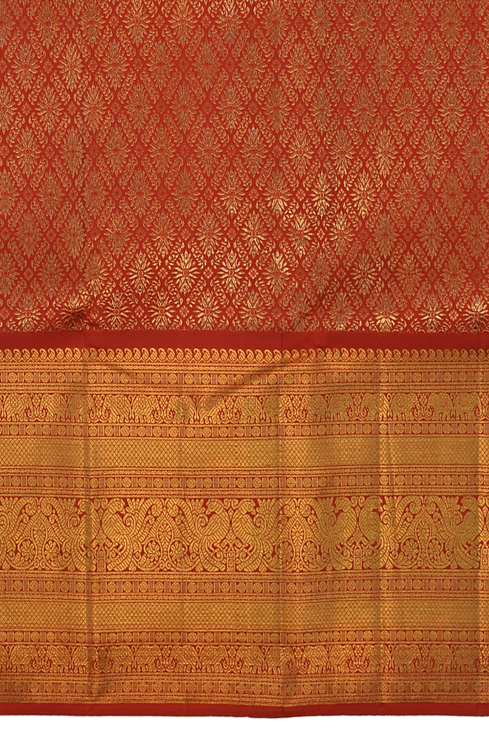 The Jacquard body, intricately detailed, tells tales of dedication and artistry, with diamond designs interlaced with the graceful kamalam motif. The red self border, a testament to grandeur, showcases an elaborate dance of peacocks, elephants, and the varusai pet design. The pallu, draped in rich red, is a symphony of the kuyil kan and benarspet designs intertwined with varisapet motifs.