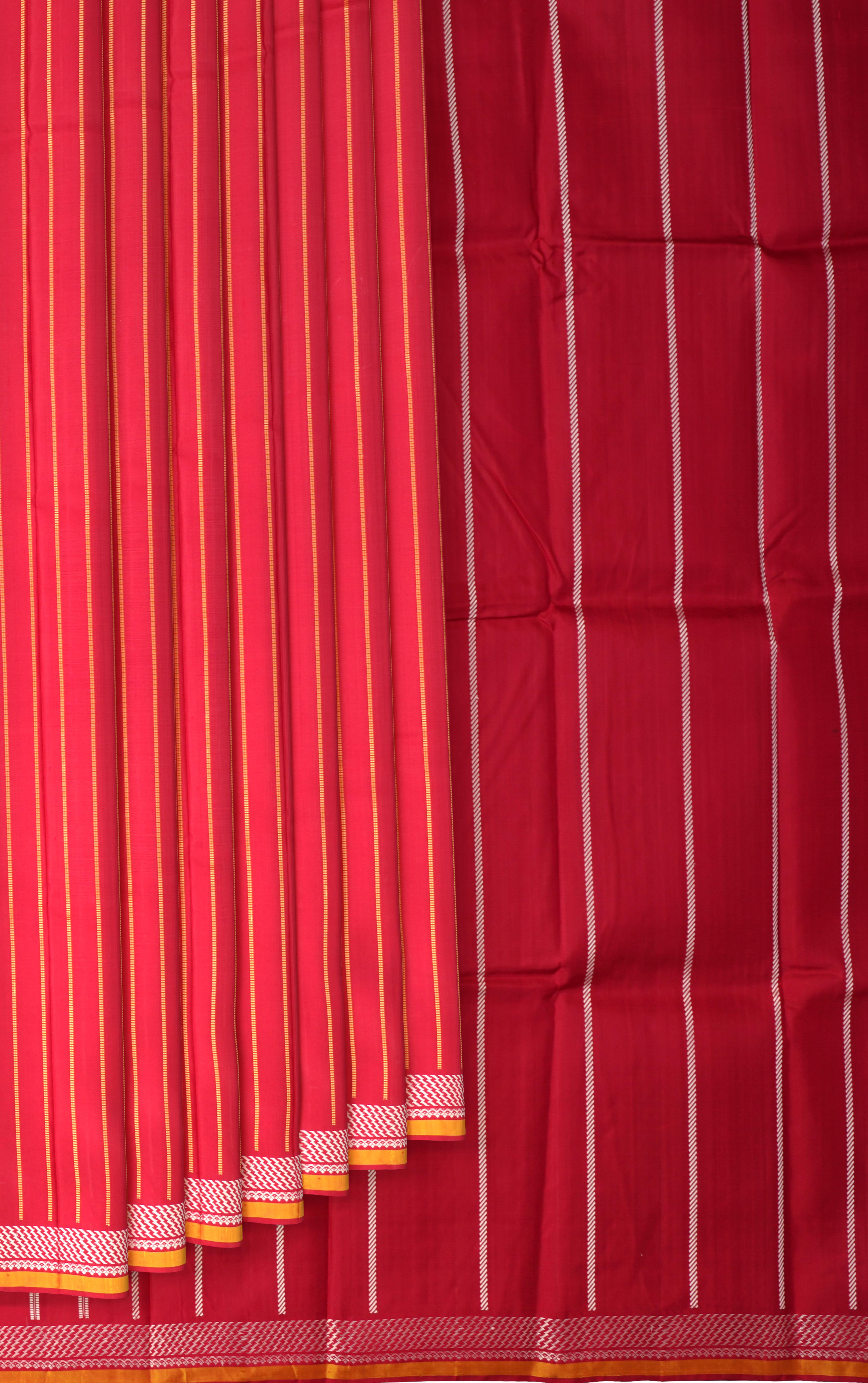 Experience the beauty of traditional Indian craftsmanship with this stunning Red and Orange Arni Thread Work Saree. The vertical thread work design, a hallmark of Arni Thread Work, is a testament to the artisan's skill and dedication. The bold red and orange colors, symbolizing passion and energy, are perfectly complemented by the intricate thread work. The dual tone of red and orange adds a touch of vibrancy and playfulness to this saree, making it perfect for formal events and festivals.
