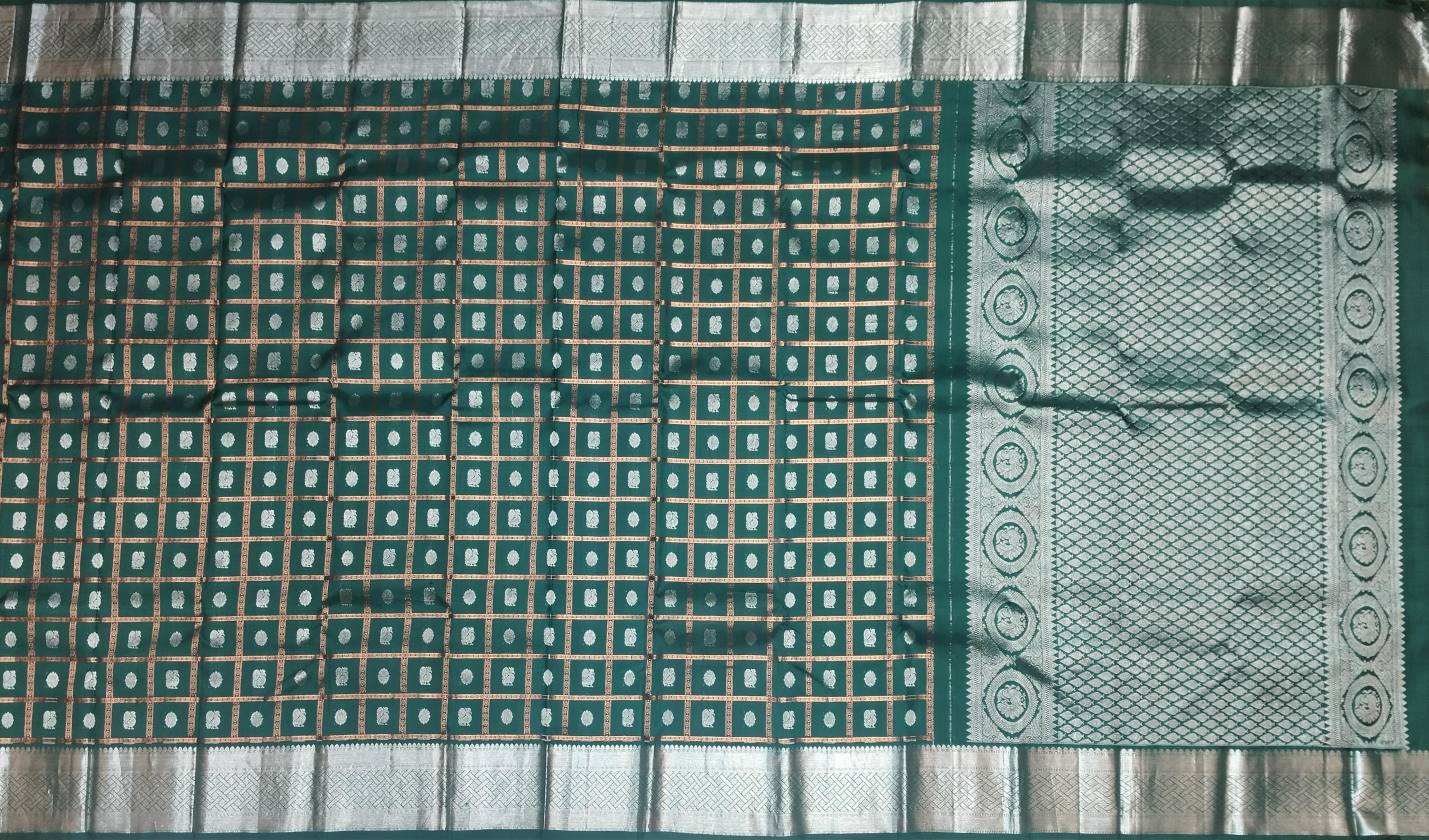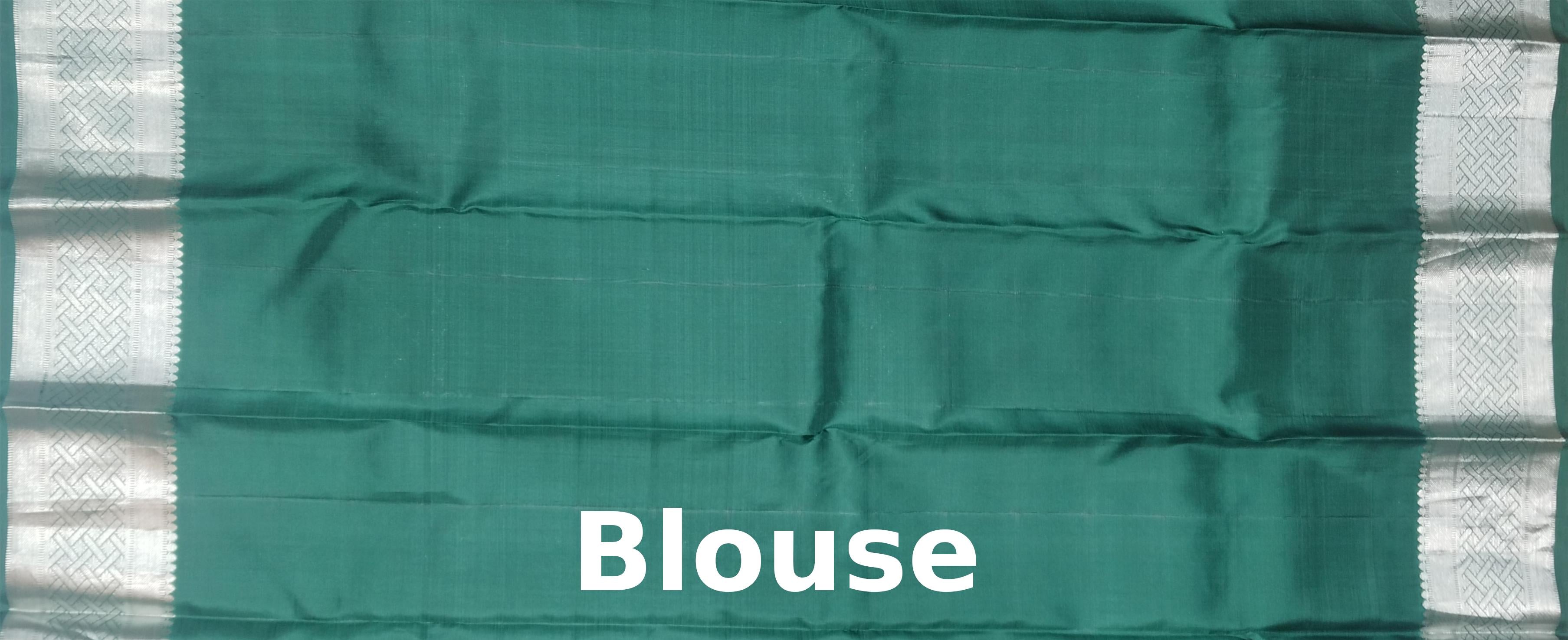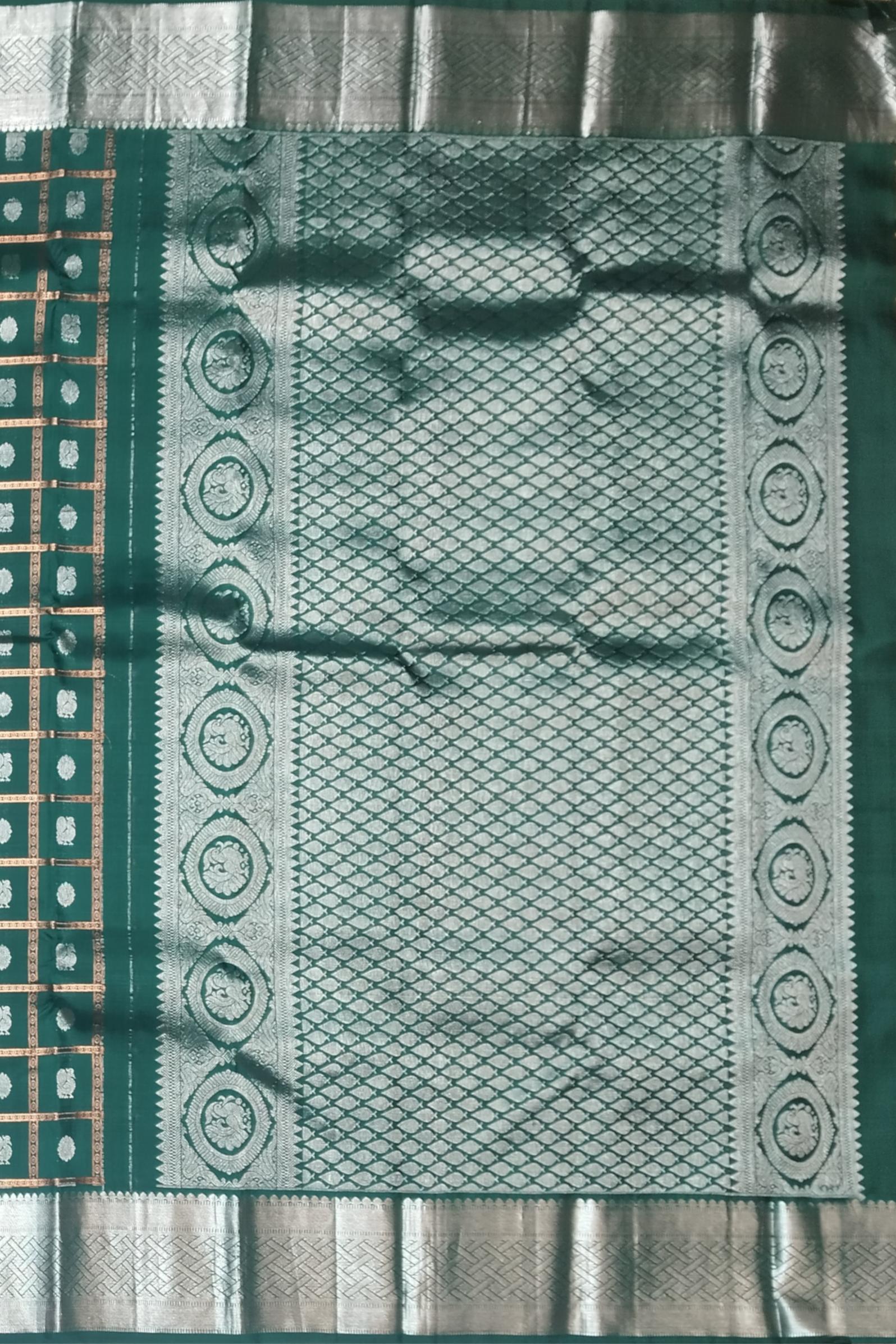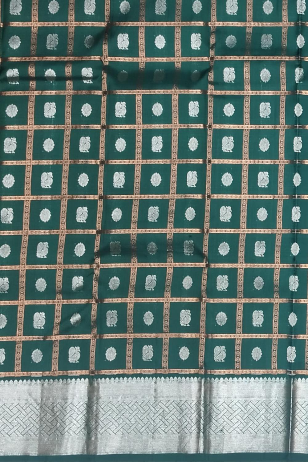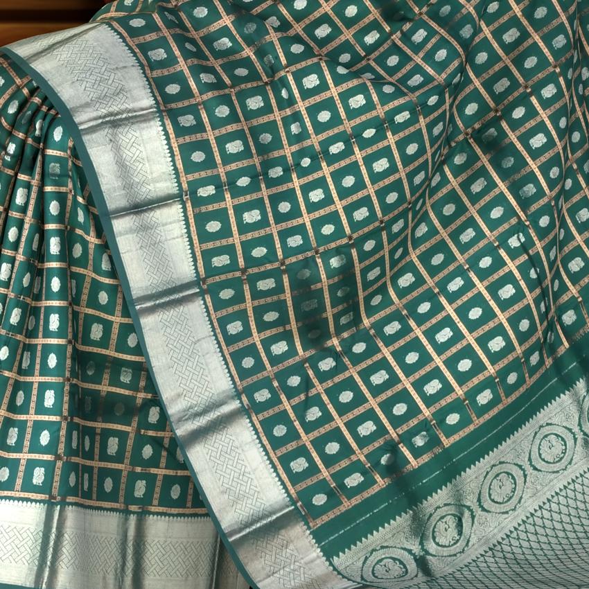 Elevate your ethnic wardrobe with the majestic allure of this Dark Green Kanchi Pure Silk Saree, woven with intricate silver checks and the symbolic Annam Chakram butta. The deep green body offers a lush canvas that highlights the gleaming silver motifs—“Annam,” the celestial swan, symbolizes purity and spiritual wisdom, while the “Chakram” represents the eternal cycle of life and protection. The pallu and blouse in shimmering silver add a radiant contrast, while the single-side border subtly balances the opulence.