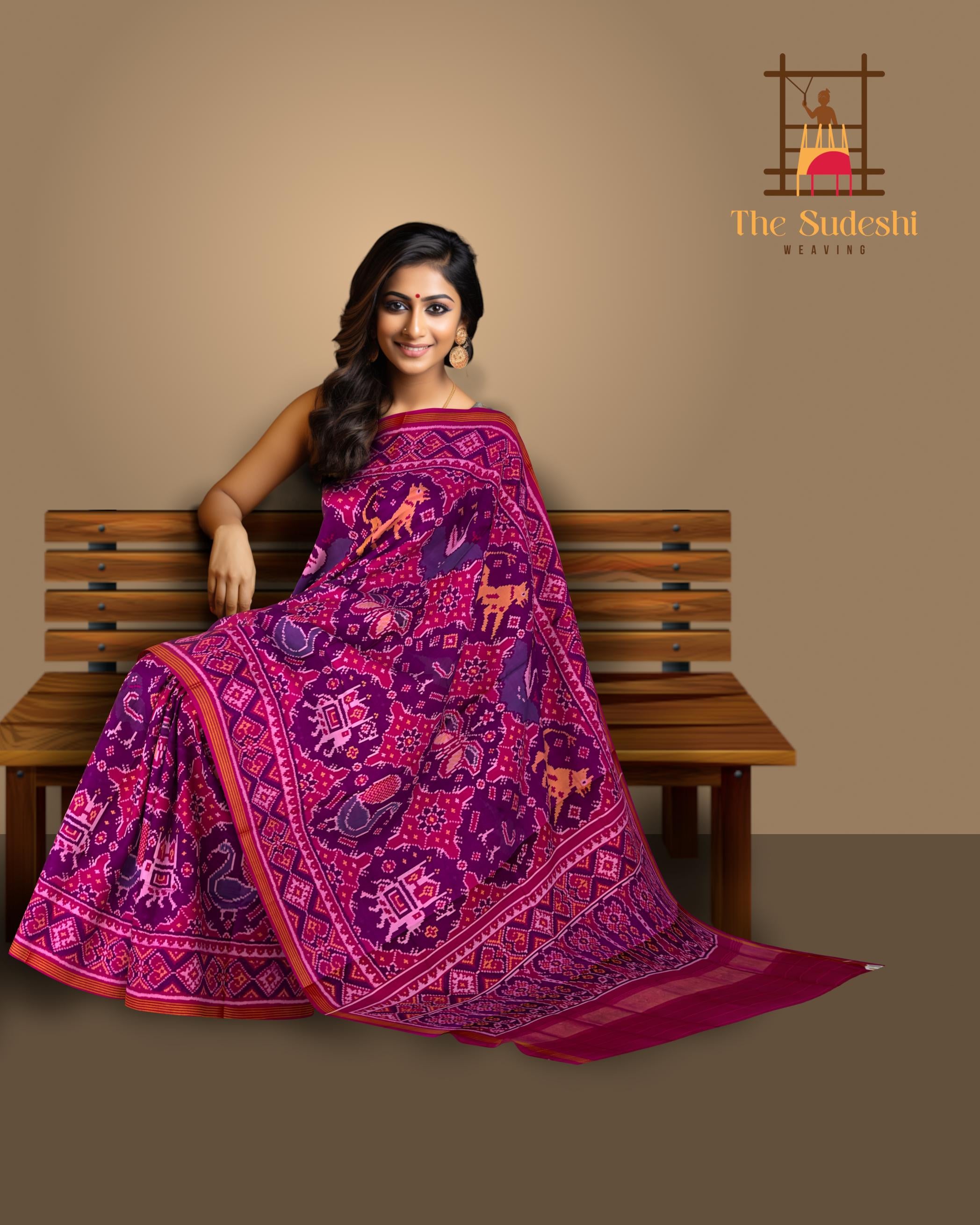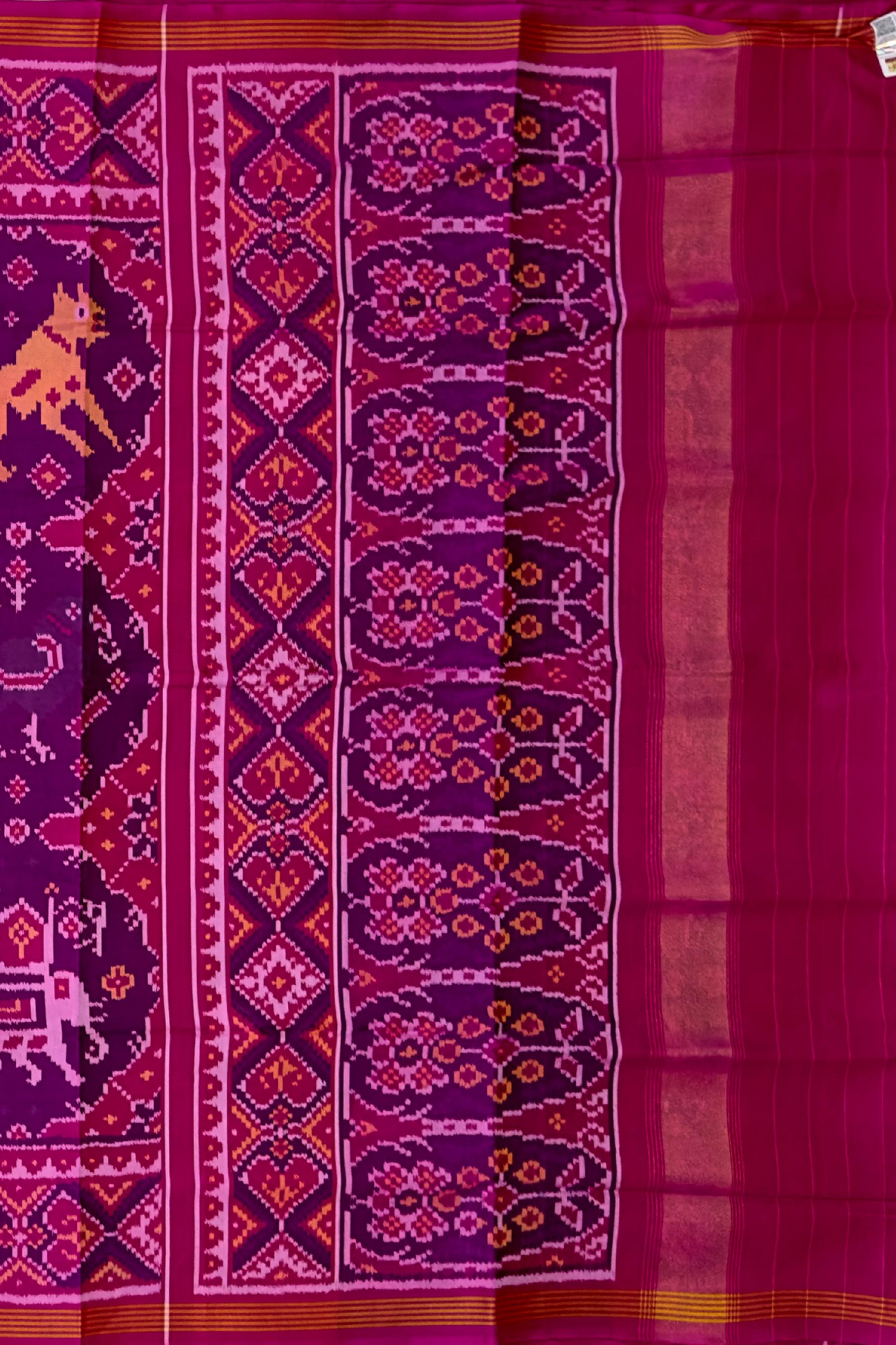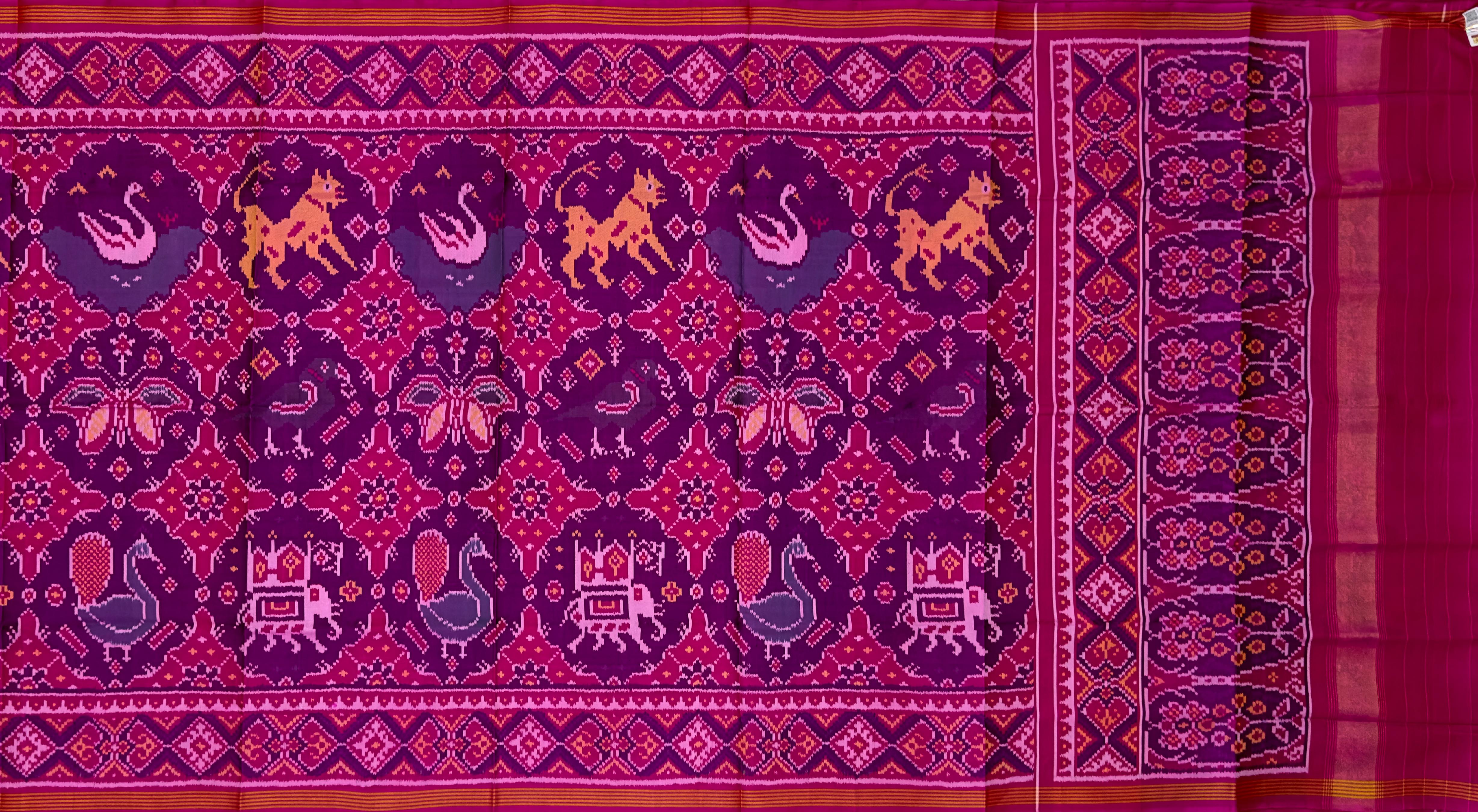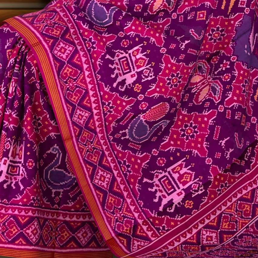 Stand out in the Red Blue Pink Ringni Tal Chabdi Semi Patan Saree, a perfect choice for celebratory events and cultural functions. Its vivid pink and ringni colors adorned with 6 Figure patterns offer a festive flair.