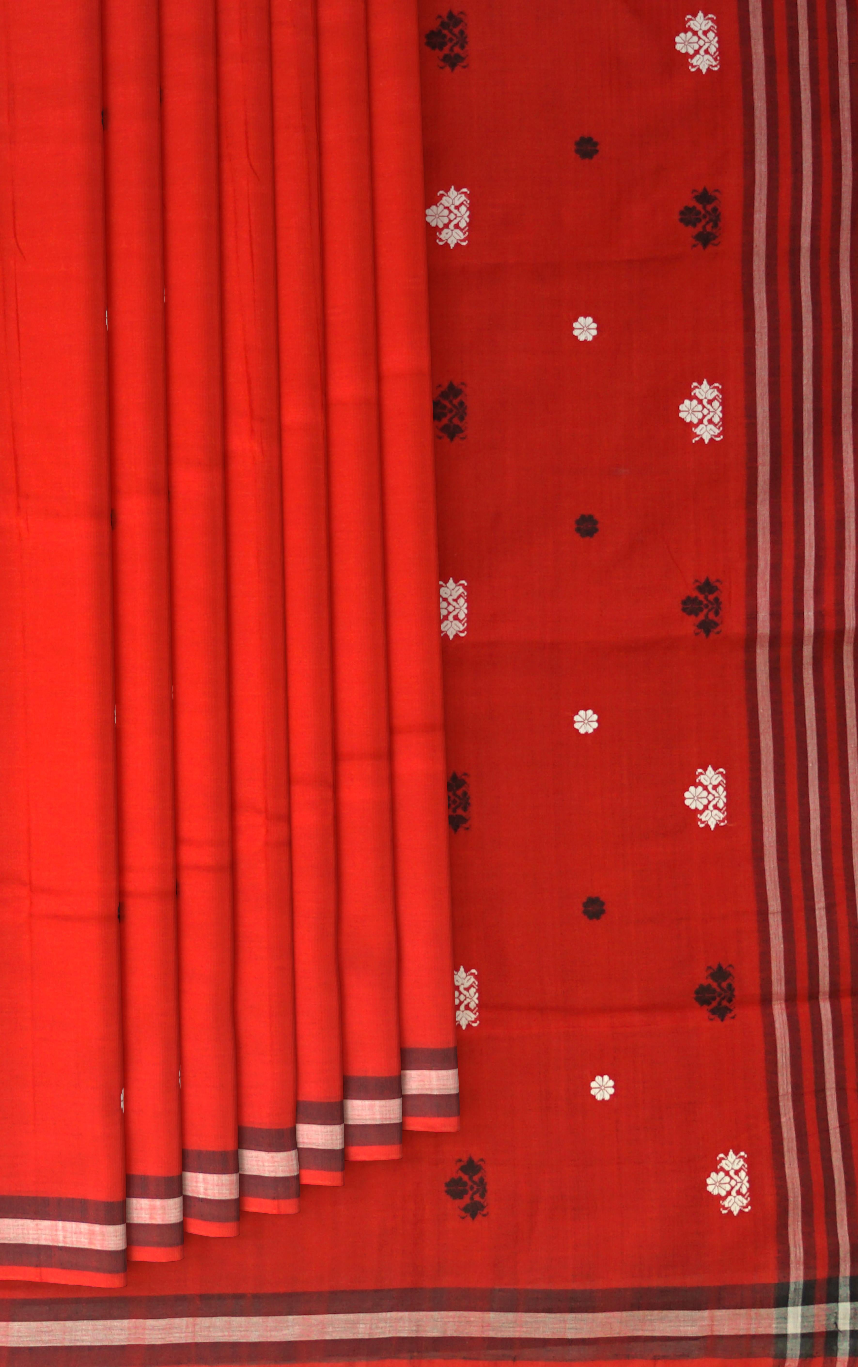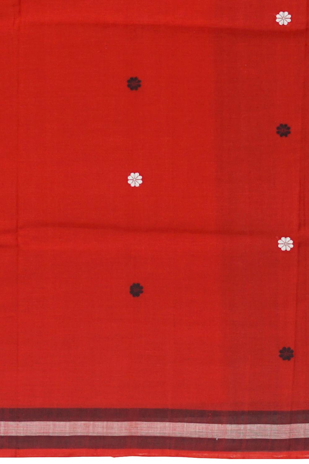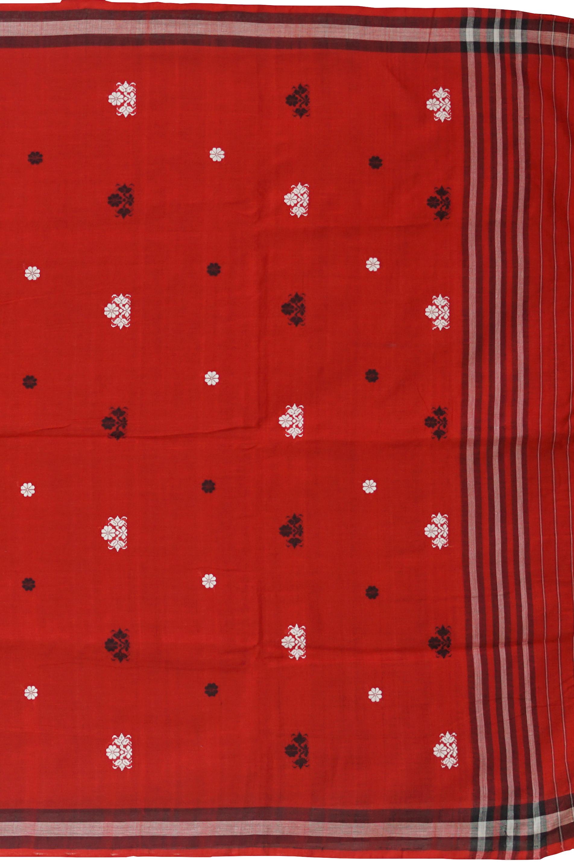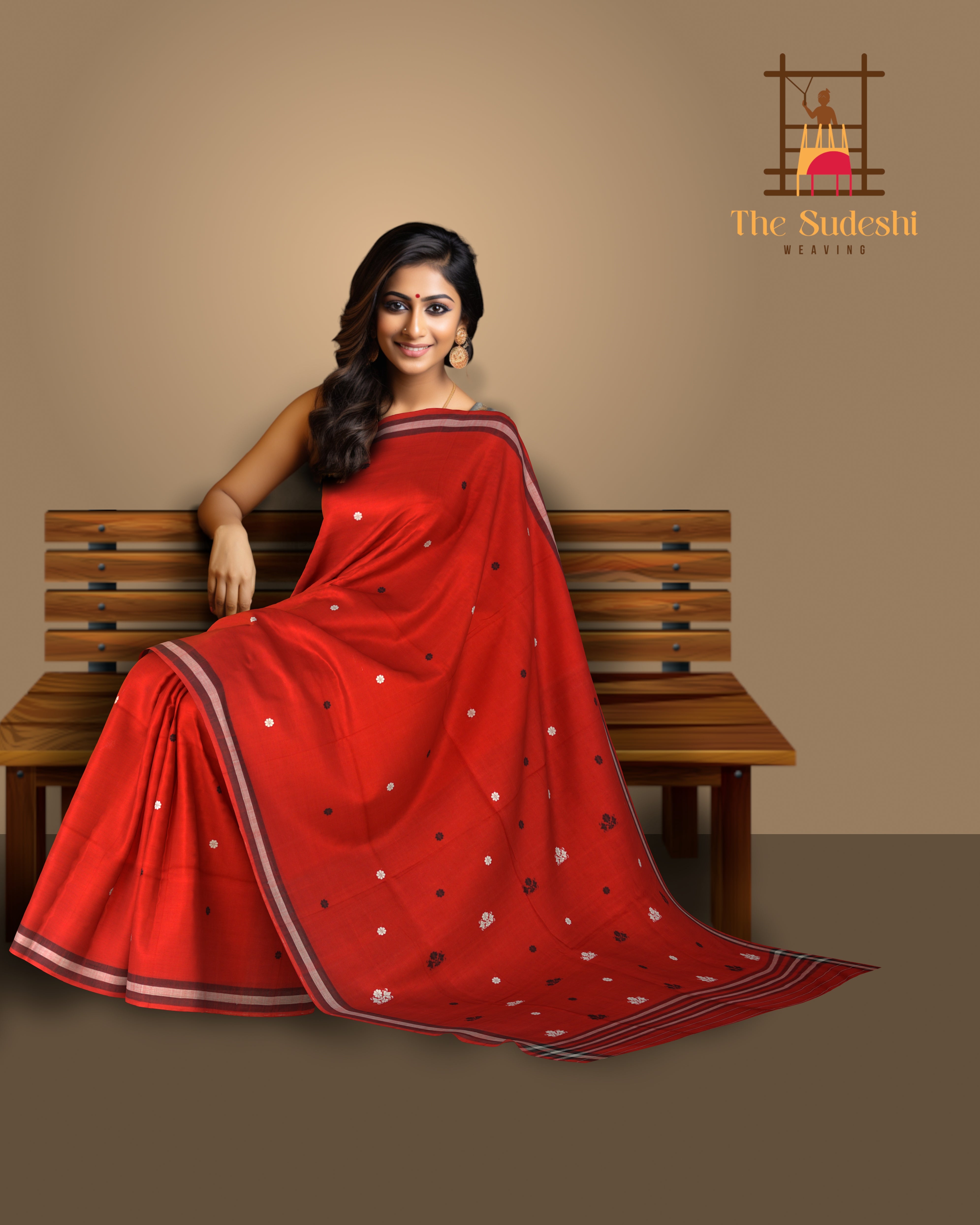 Step into the world of vibrant tradition with our Red Cotton Saree with a Black Border and Intricate Buttis. This saree is woven from pure cotton, providing a soft and breathable drape that is perfect for any occasion. The striking red body adorned with delicate buttis creates a bold contrast with the black border, making this saree both stylish and versatile.
