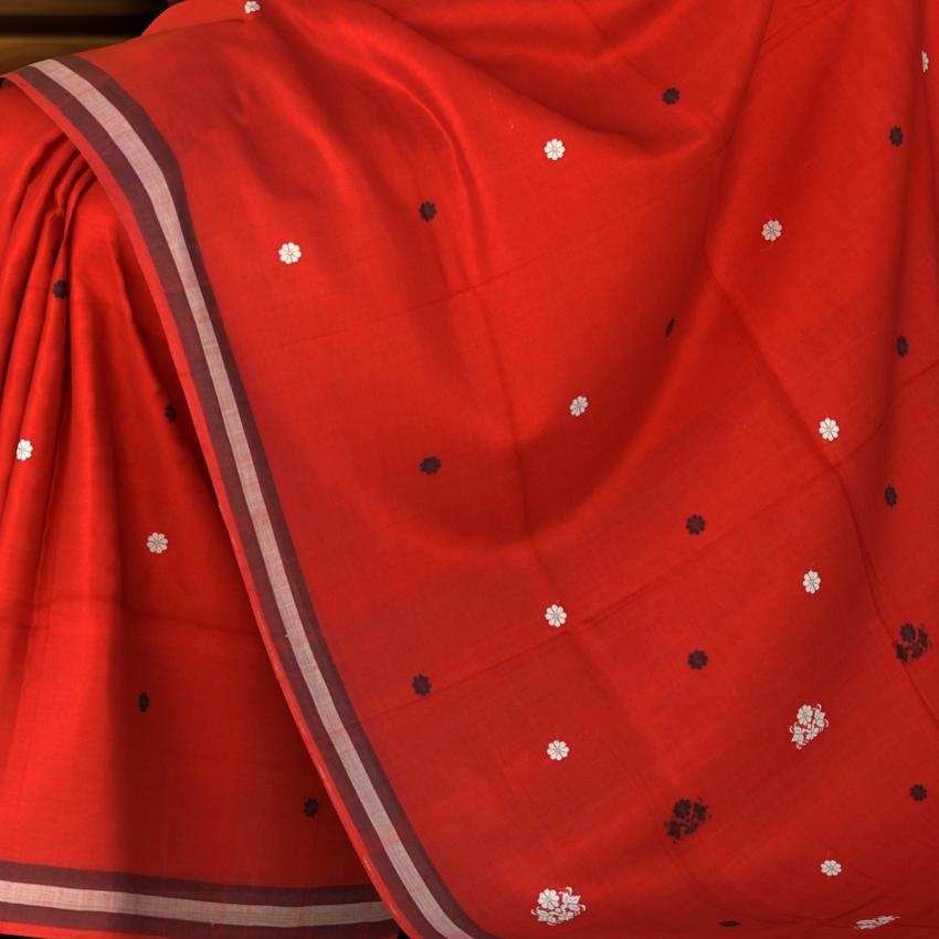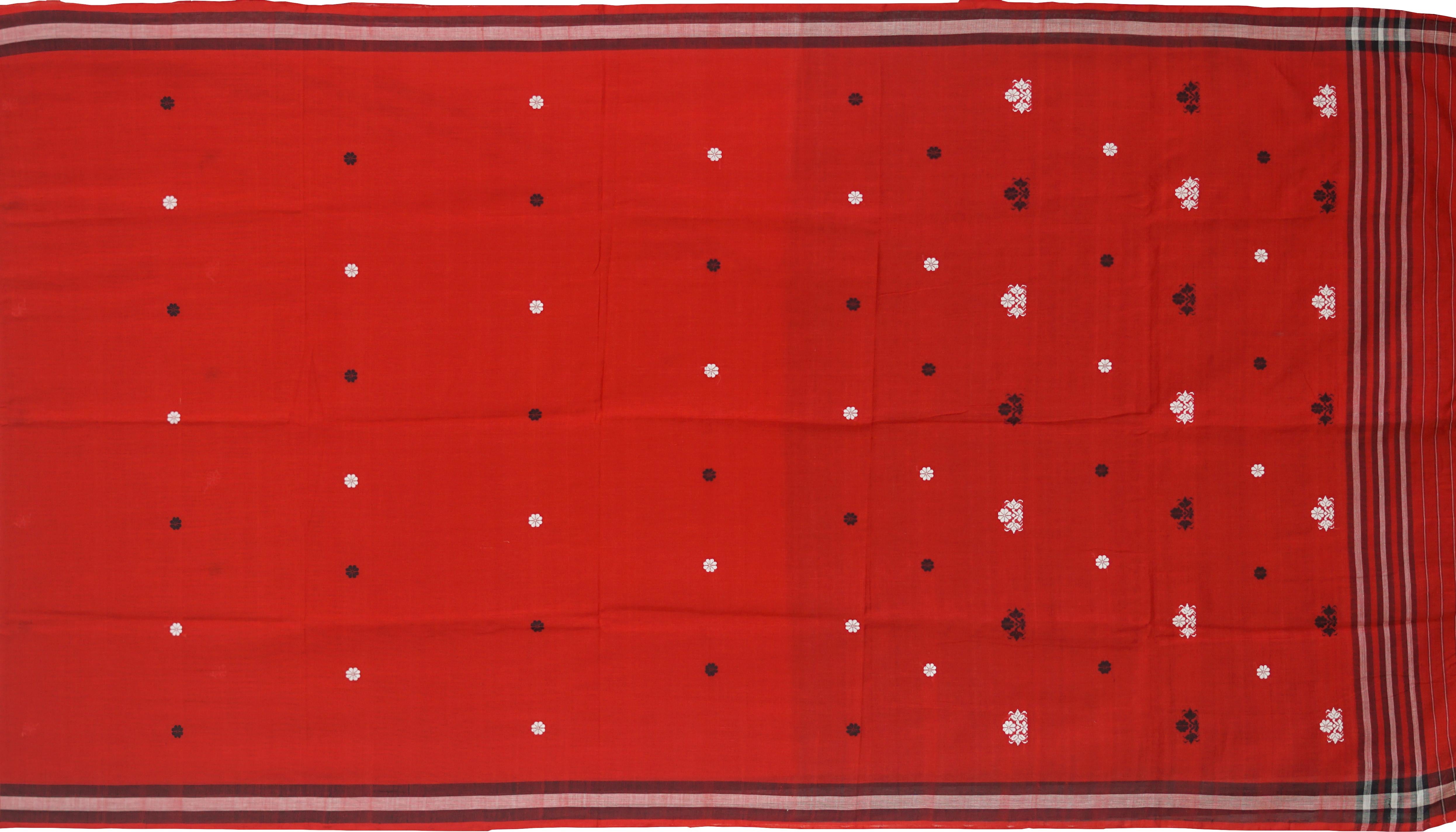 The motifs on this saree are inspired by Assamese culture and nature, featuring geometric and stylized patterns that symbolize flowers, plants, and traditional artifacts. These motifs, woven using the extra-weft technique, add a raised, embossed effect that enhances the saree's texture and depth. The combination of red and black is both classic and contemporary, appealing to women of all ages.
