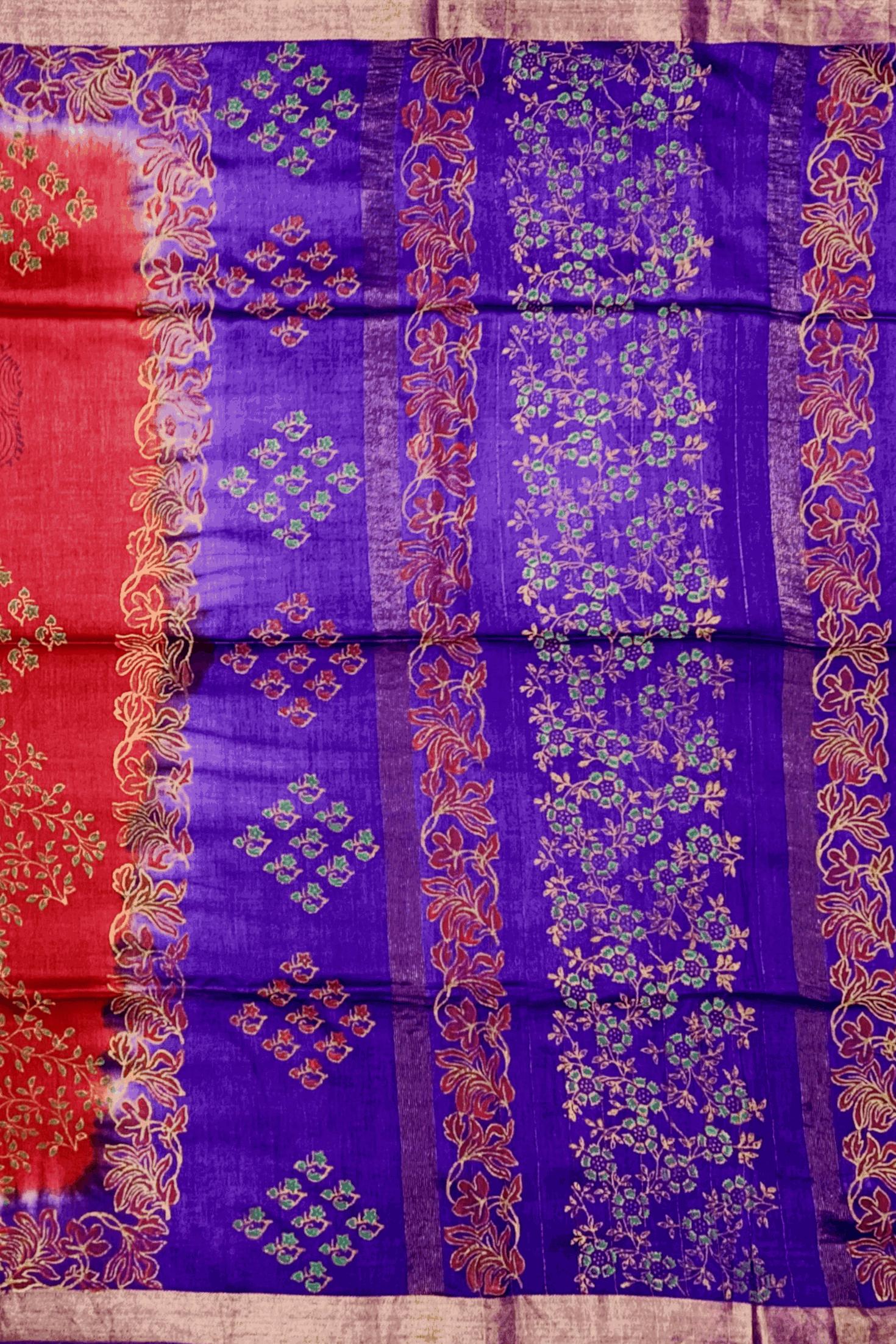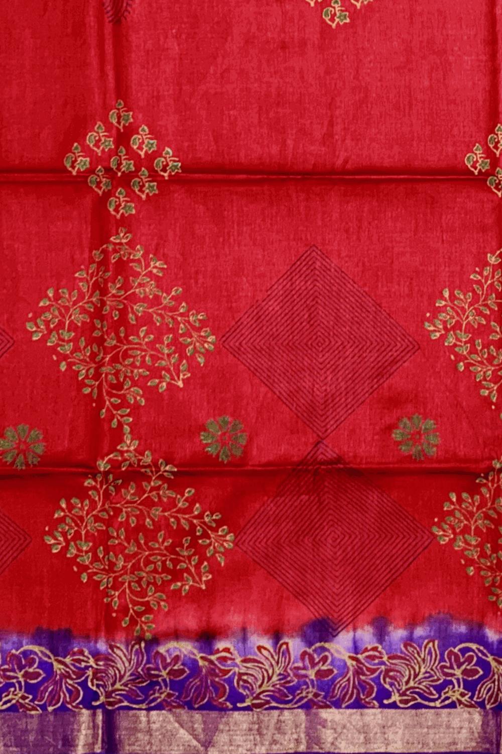 Experience the beauty of this Red Cotton saree, featuring a single-side design. The vibrant red hue creates a striking contrast, while the voilet and gold accents add a touch of elegance.
