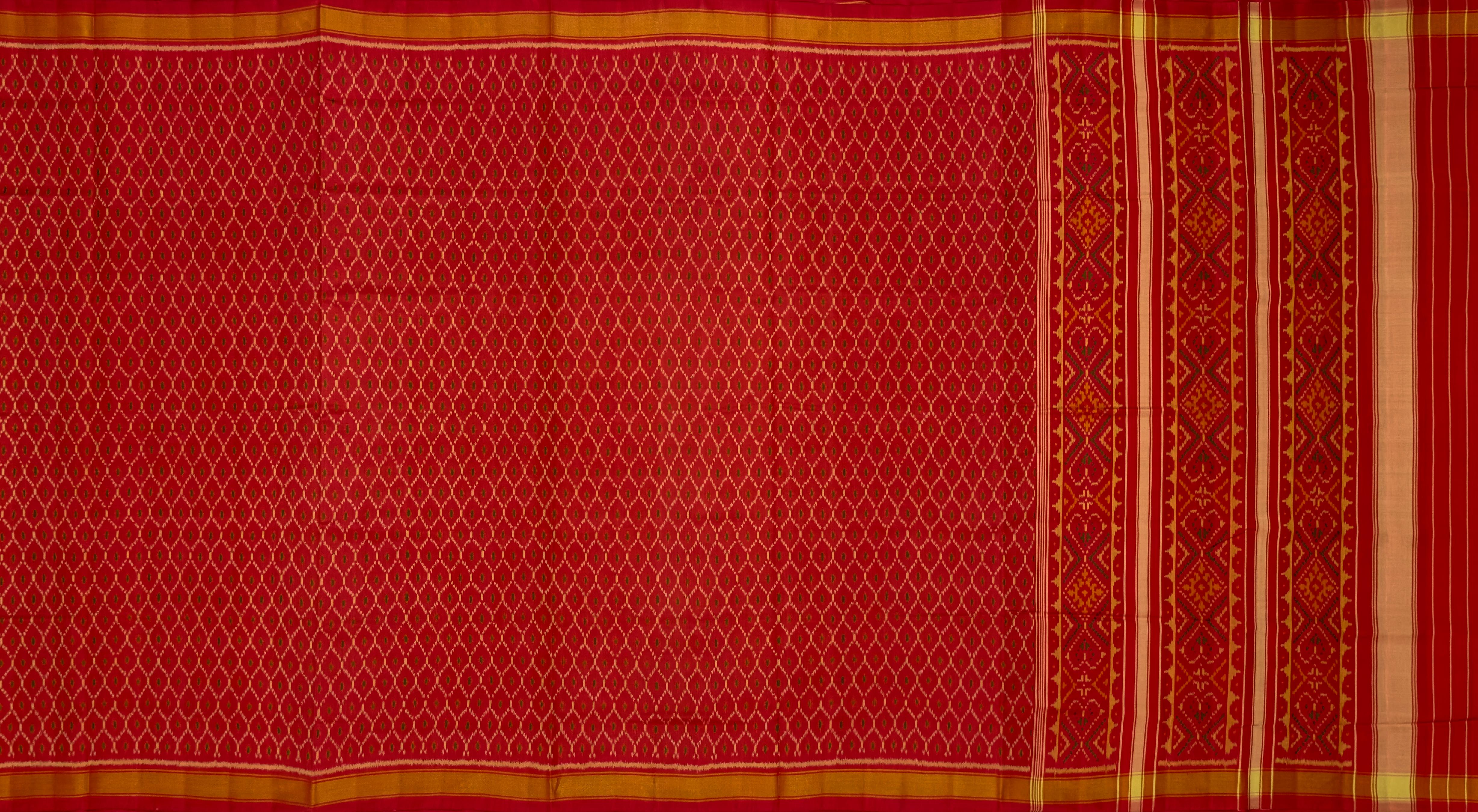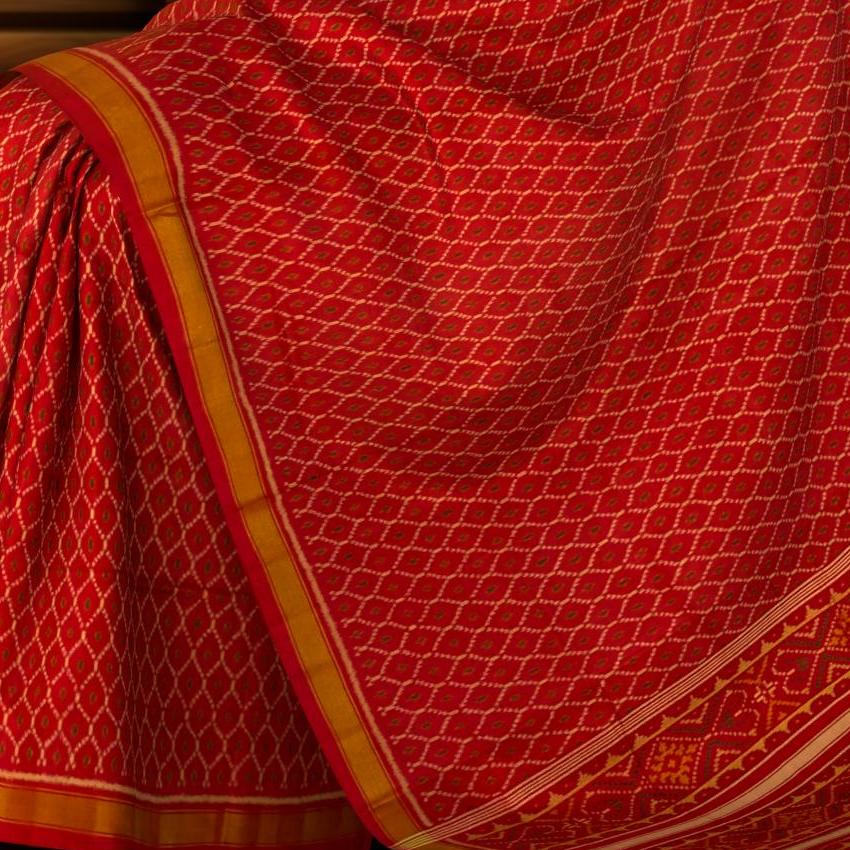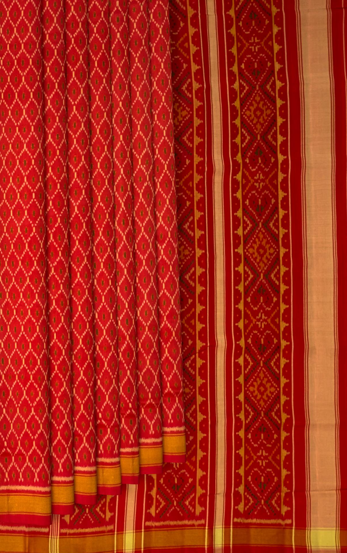 Experience the timeless beauty of the Red Daliyabhat Patola Saree, a true embodiment of Indian artistry. Crafted using the single ikat technique, this saree showcases the Daliyabhat design, featuring intricate and exquisite patterns. The deep red color provides a striking backdrop for the detailed motifs that flow seamlessly from the body to the pallu. The semi-lustrous finish adds a touch of elegance, making it a versatile choice for various occasions. Perfect for grand weddings, cultural celebrations, and formal gatherings, this saree is designed for the modern NRI woman who values her Indian heritage. It symbolizes centuries of artisan tradition, making each piece a unique work of art. Celebrate your heritage with the Red Daliyabhat Patola Saree, a timeless piece that exudes tradition and sophistication.