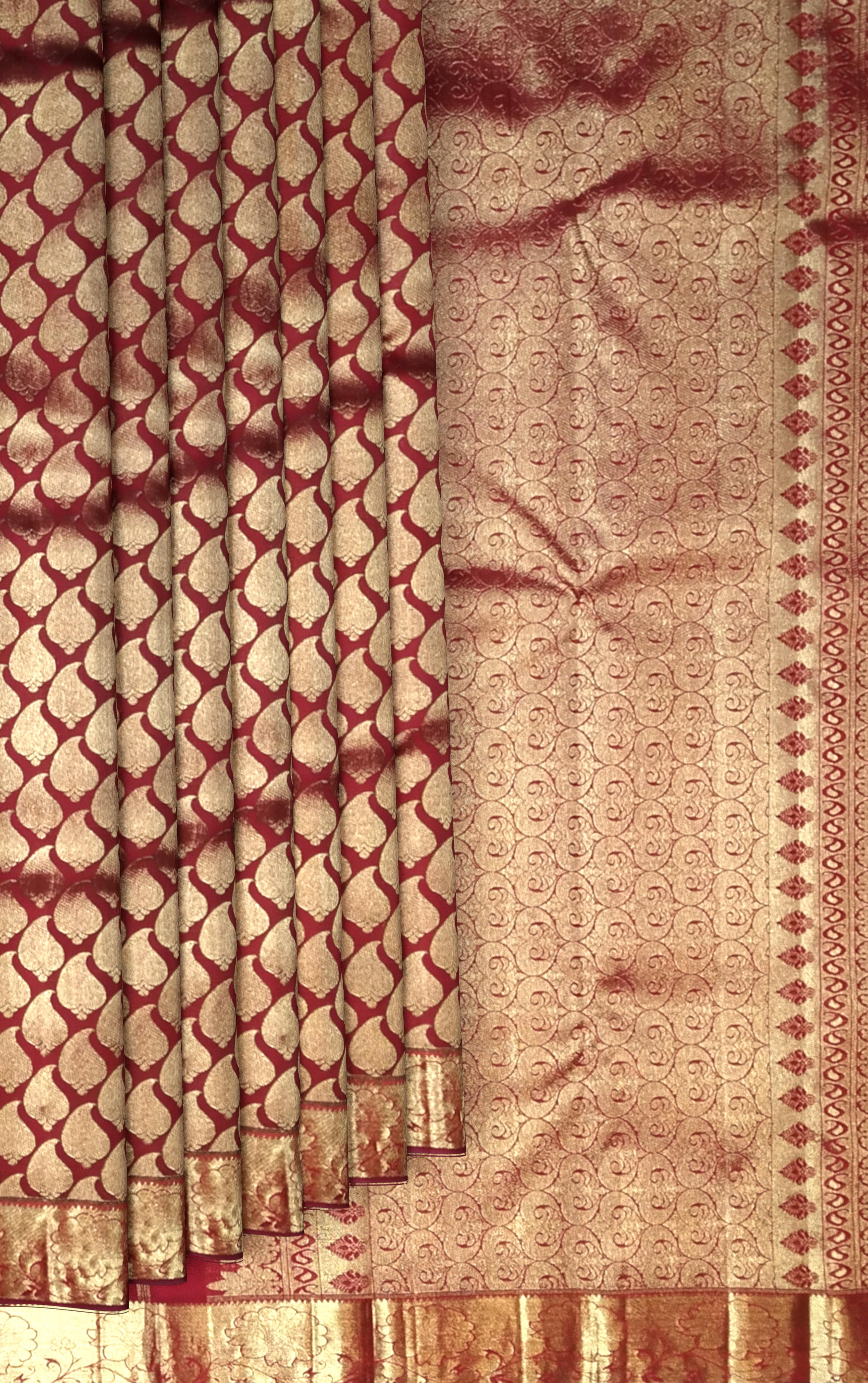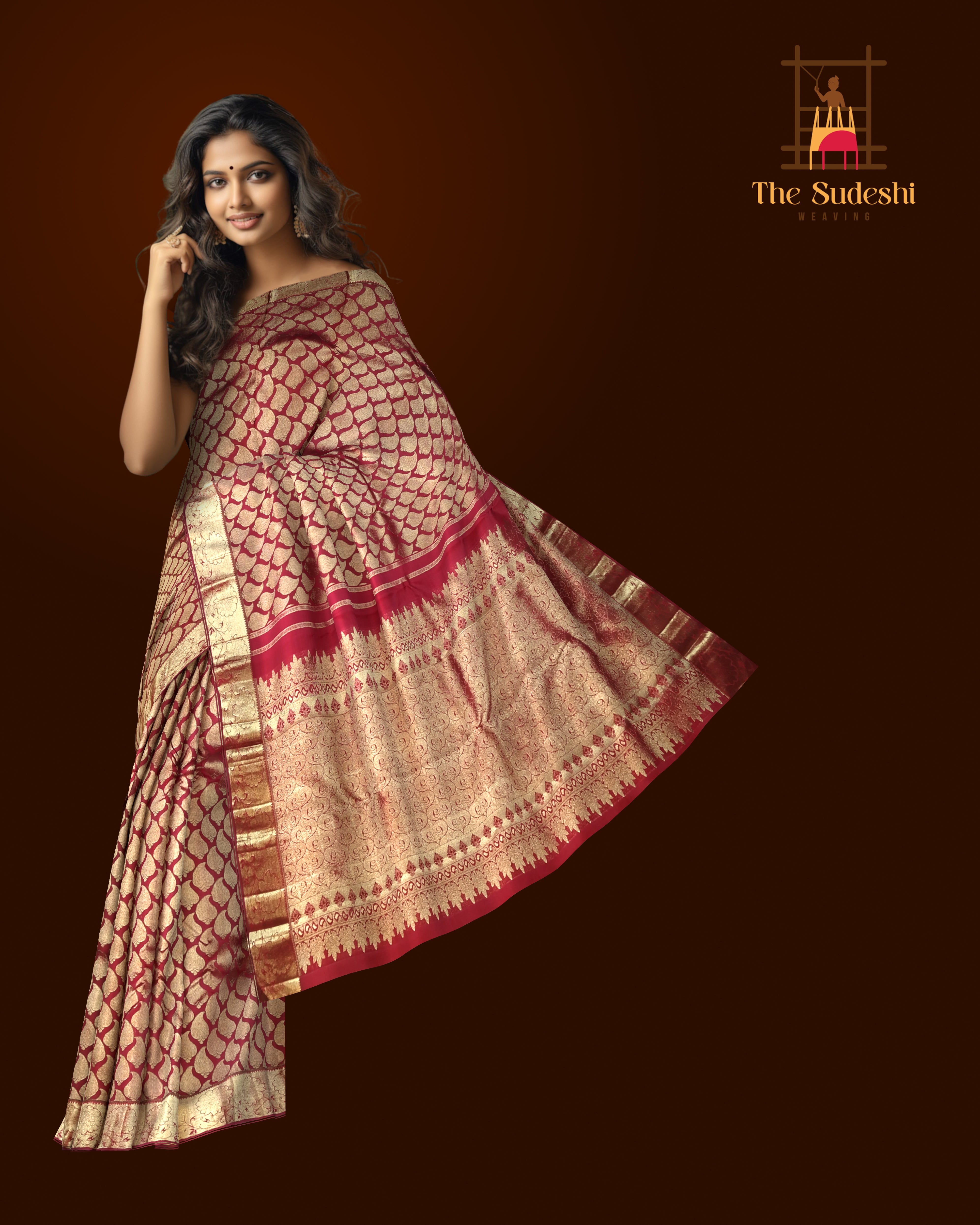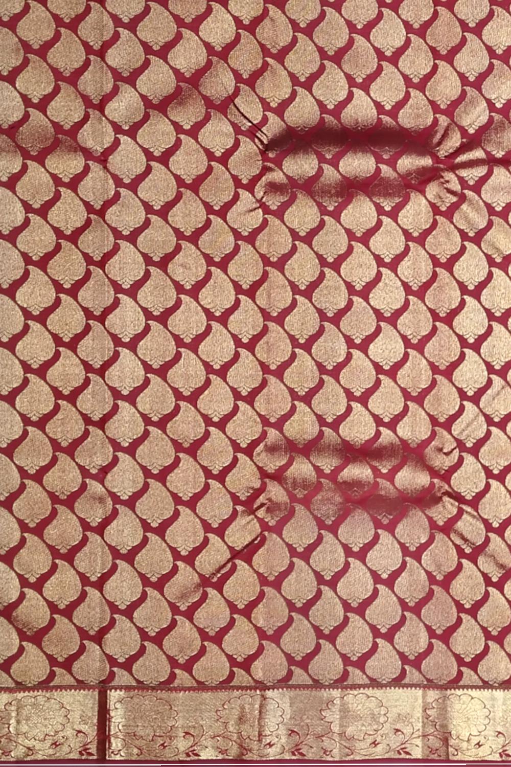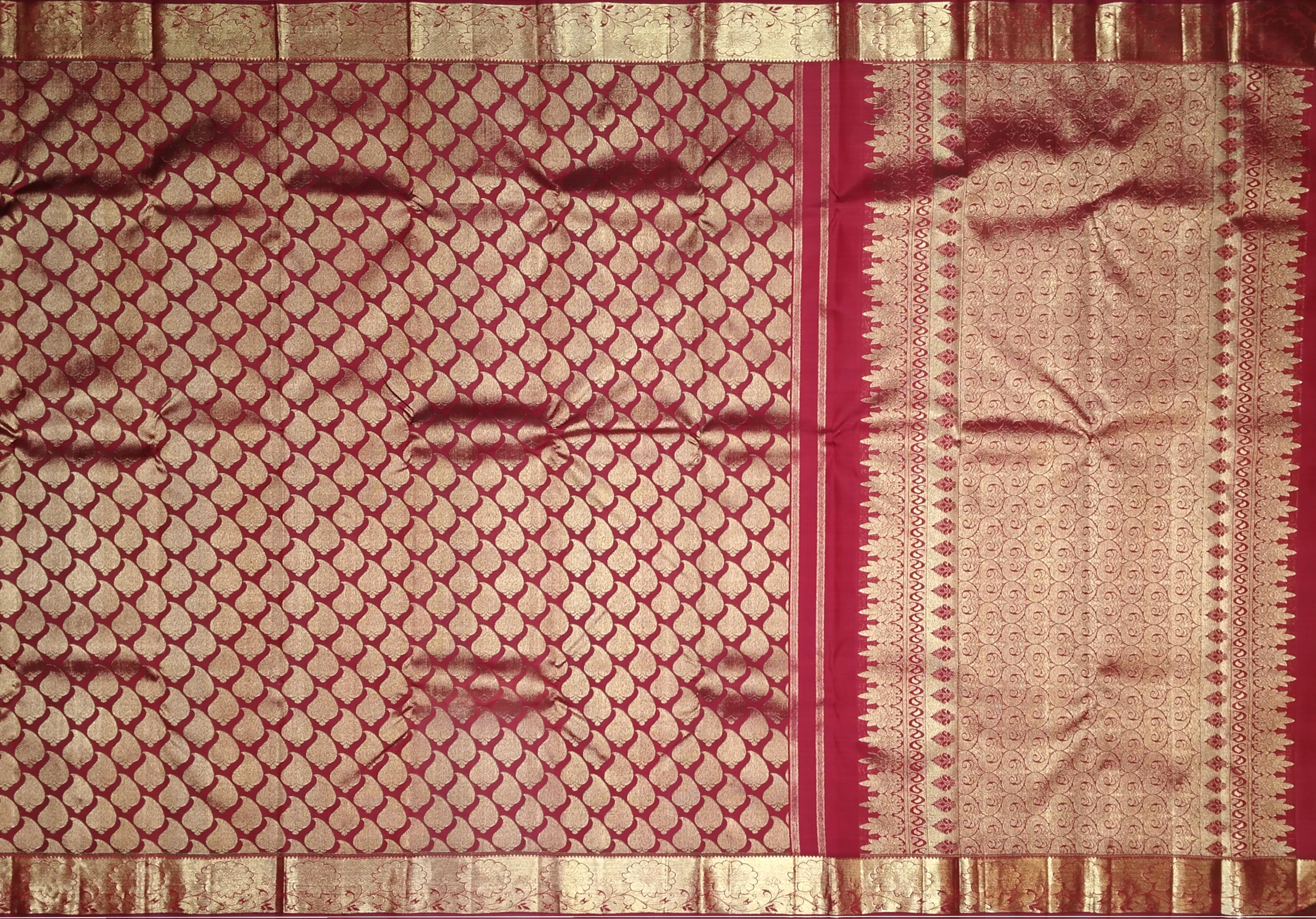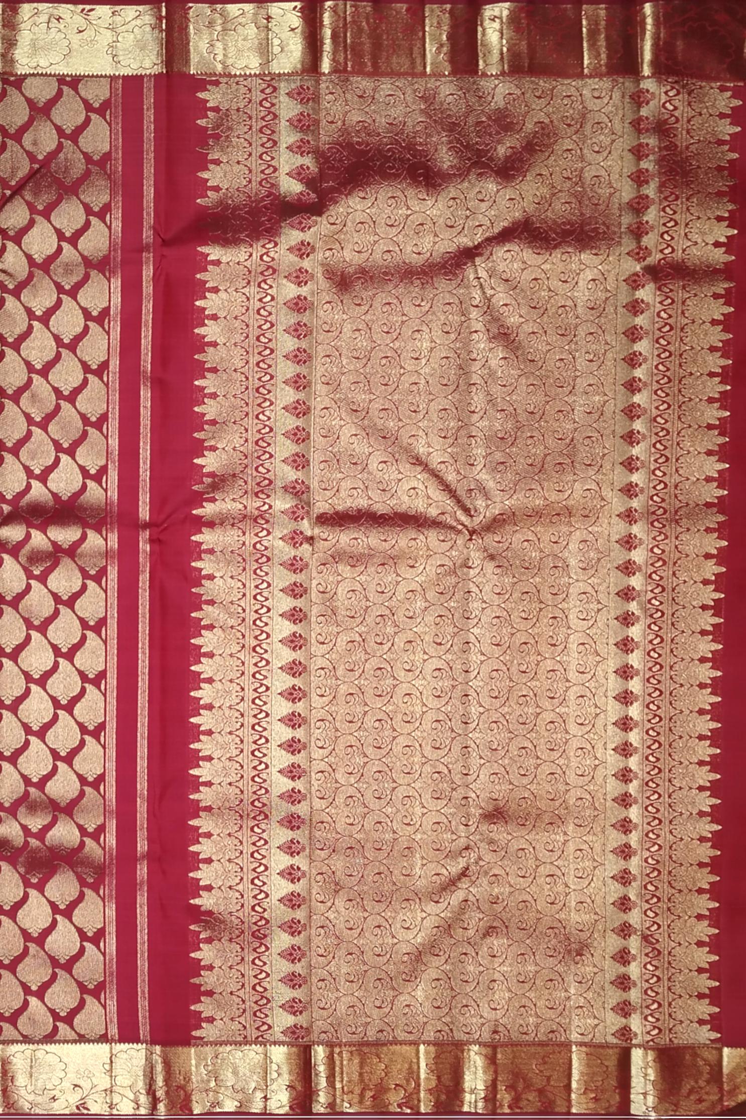 The mango or "paisley" motif holds deep cultural symbolism across Indian art—it represents fertility, renewal, and auspicious beginnings. In Kanchipuram weaving, it is more than a pattern—it’s a legacy. The self weave enhances the depth of the red silk, a color associated with love, celebration, and tradition. This saree stands as a testament to the enduring artistry of Tamil Nadu’s weavers who blend symbolism and style in every thread.