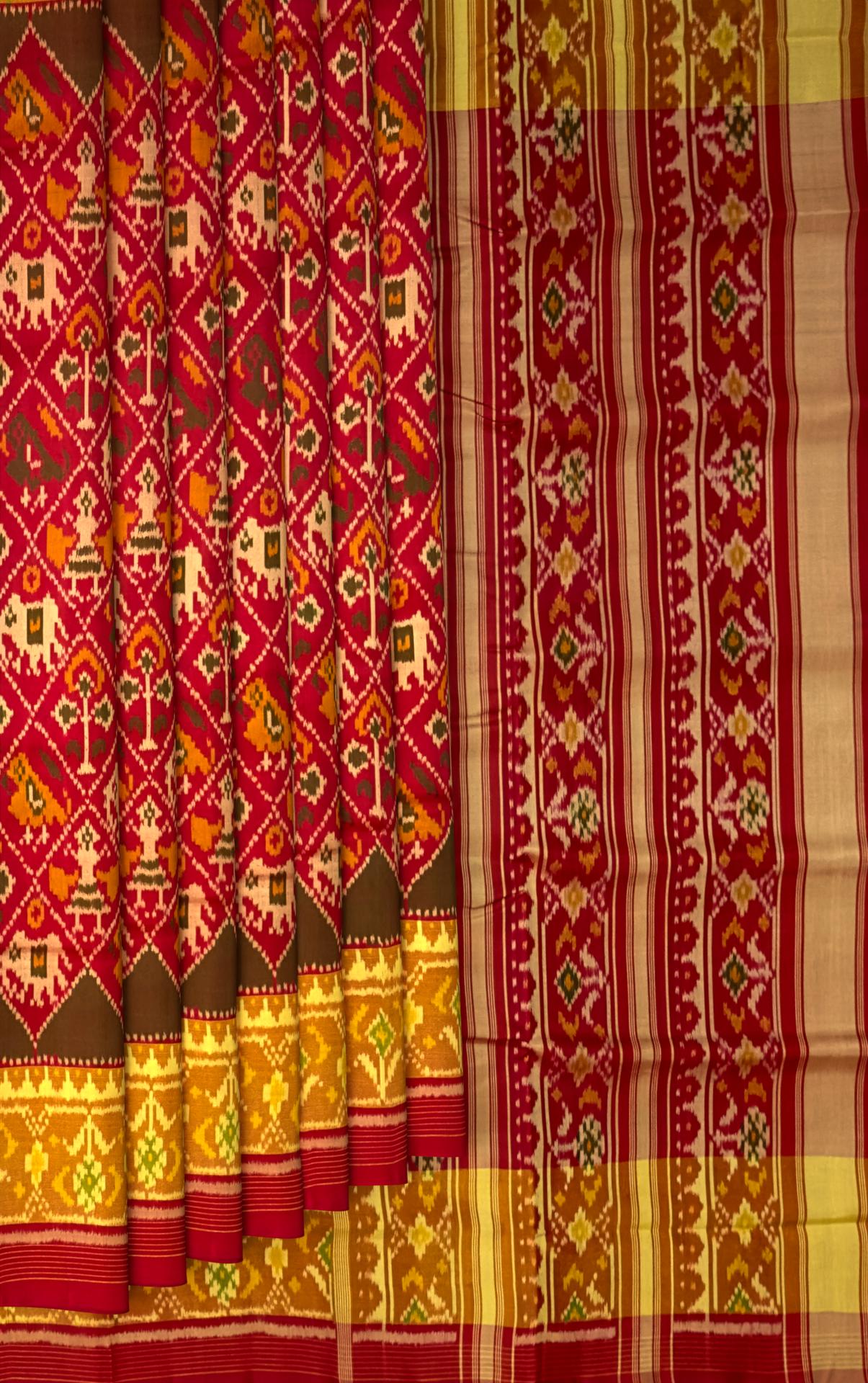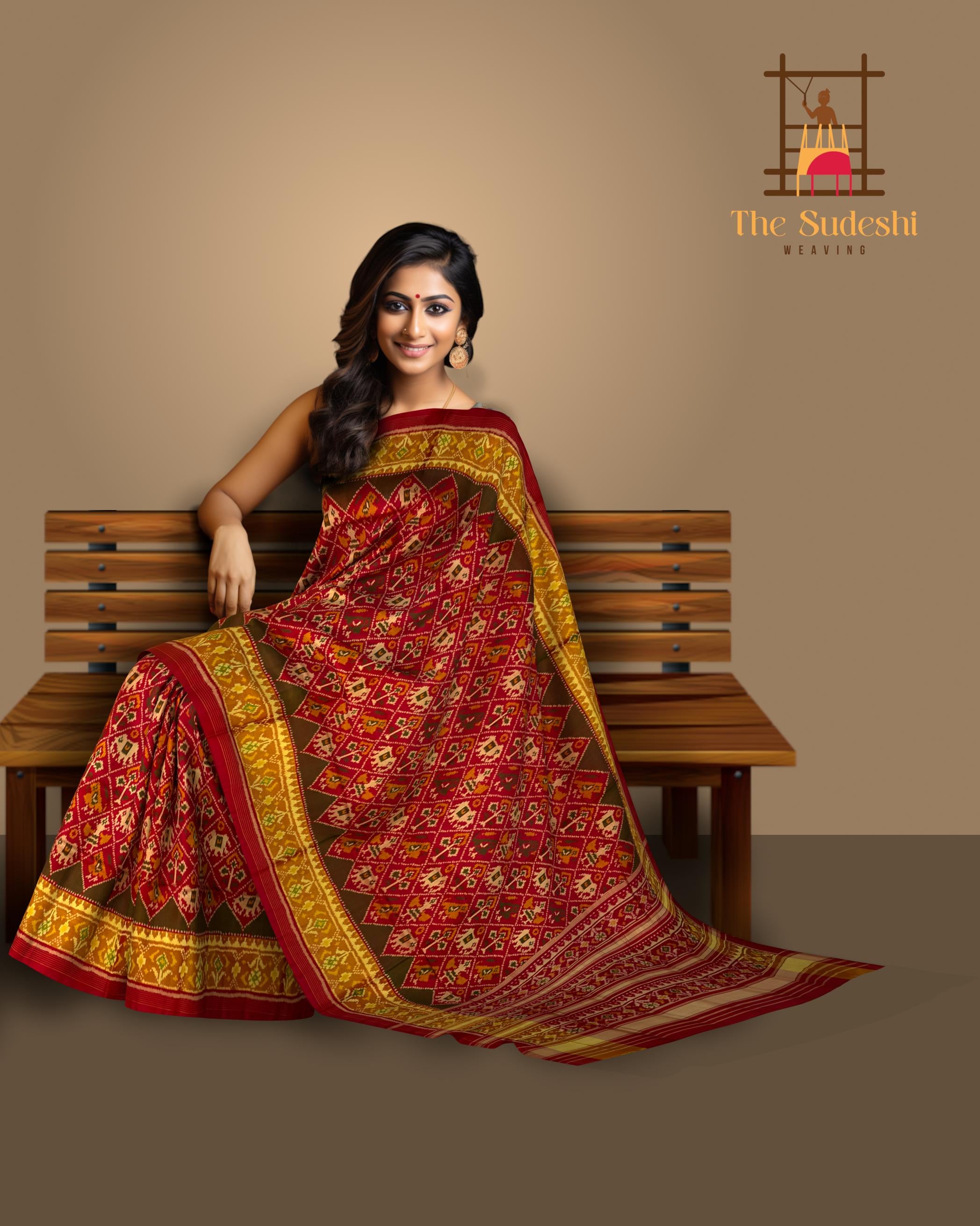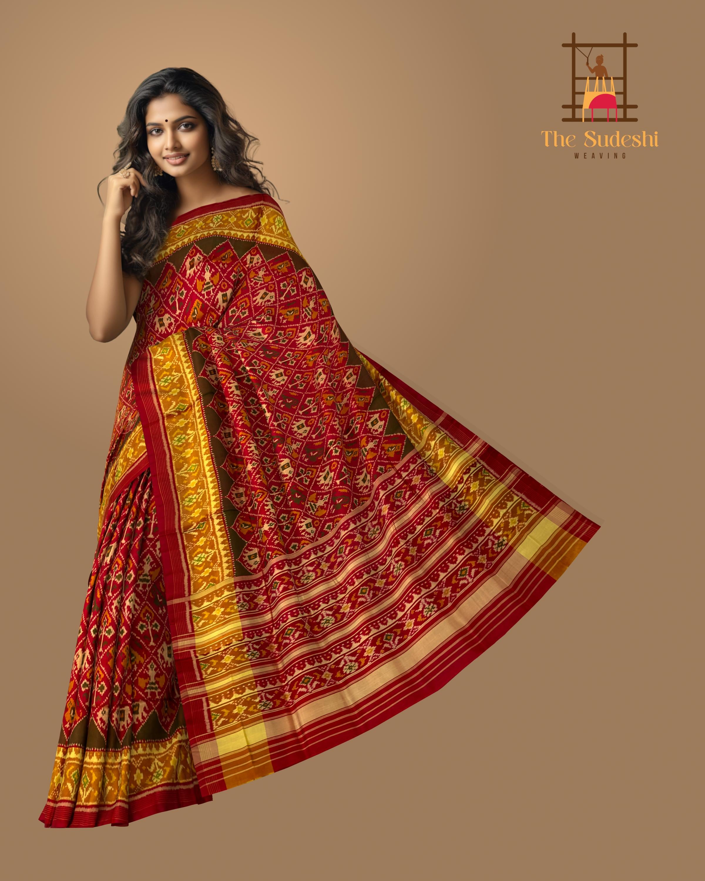 Experience the allure of the Red Maroon Nari Kunjar Patola Saree, a stunning embodiment of traditional Indian craftsmanship. Utilizing the single ikat technique, this saree features the intricate Nari Kunjar design, known for its detailed and elaborate patterns. The deep red and maroon hues provide a striking backdrop for the motifs that extend from the body to the pallu. The semi-lustrous finish adds a touch of sophistication, making it perfect for festive and cultural occasions. This saree is ideal for grand weddings, cultural festivities, and social gatherings. It embodies the rich heritage of Rajkot Patola, making each piece a unique narrative of tradition and pride. Adorn yourself with the Red Maroon Nari Kunjar Patola Saree, a timeless addition to your wardrobe that celebrates your roots with grace and elegance.